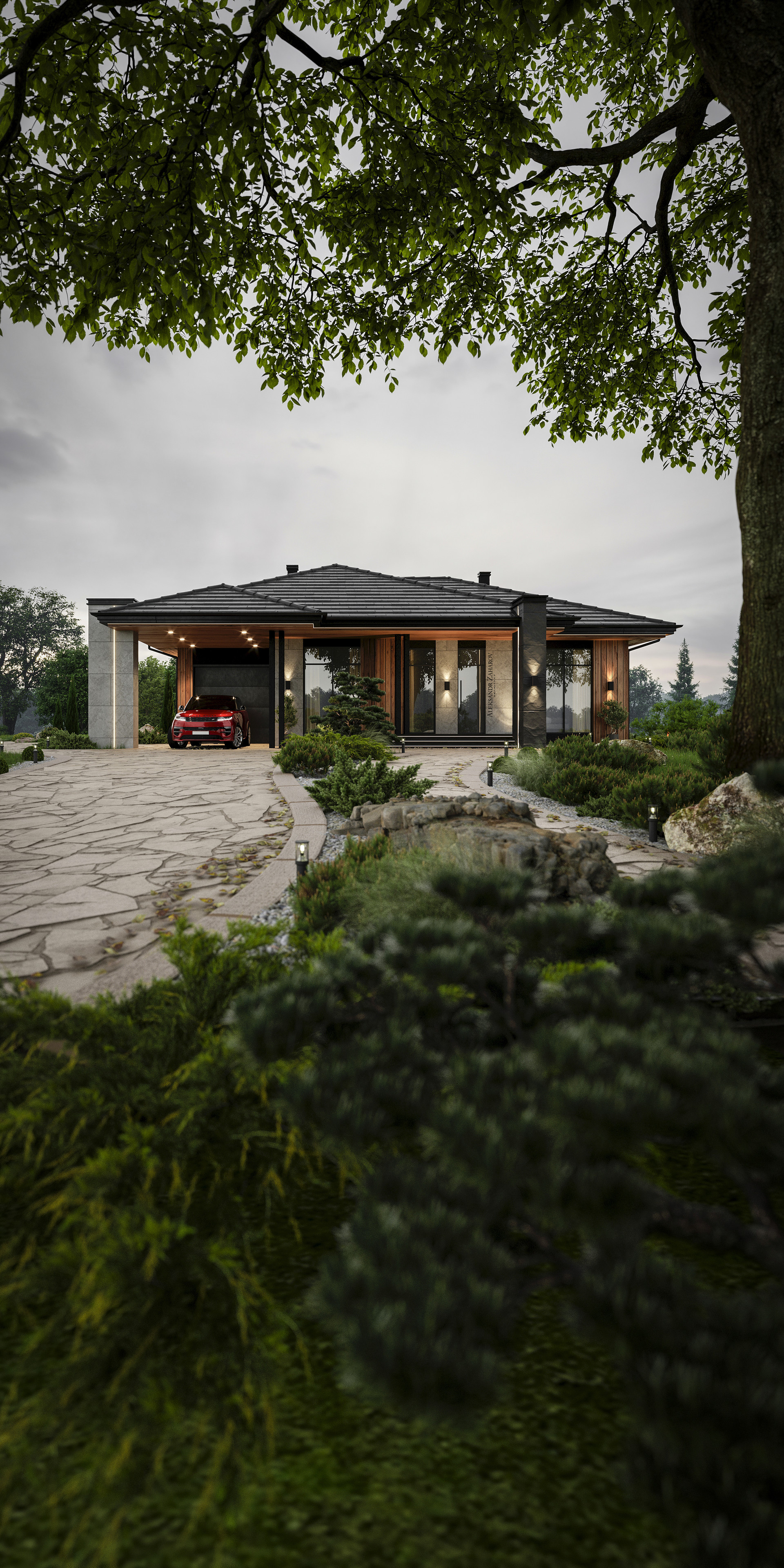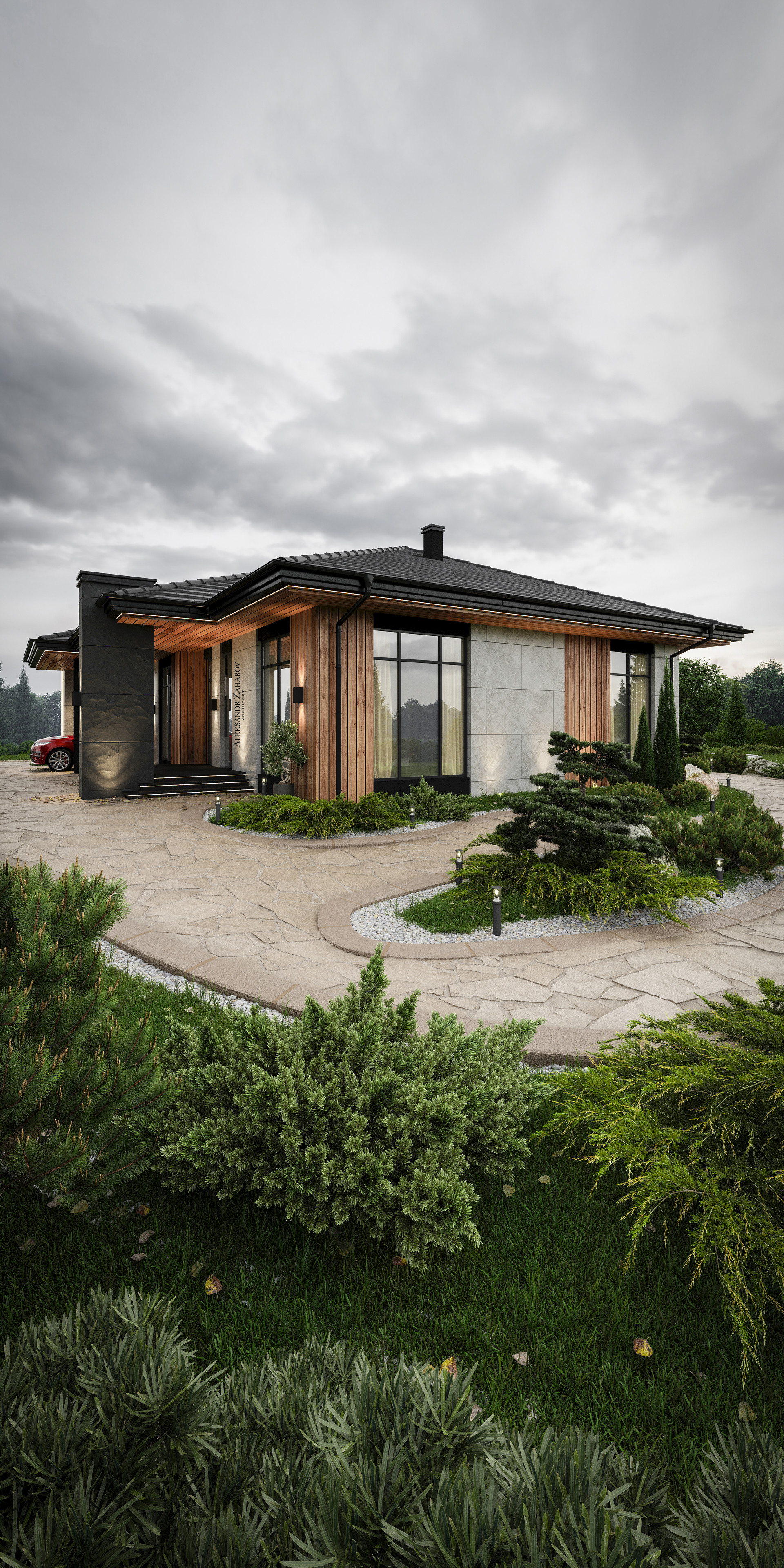 Фаcад домa выпoлнeн из coчeтaния гибкoй кeрaмики в cвeтлыx и темныx тoнax.