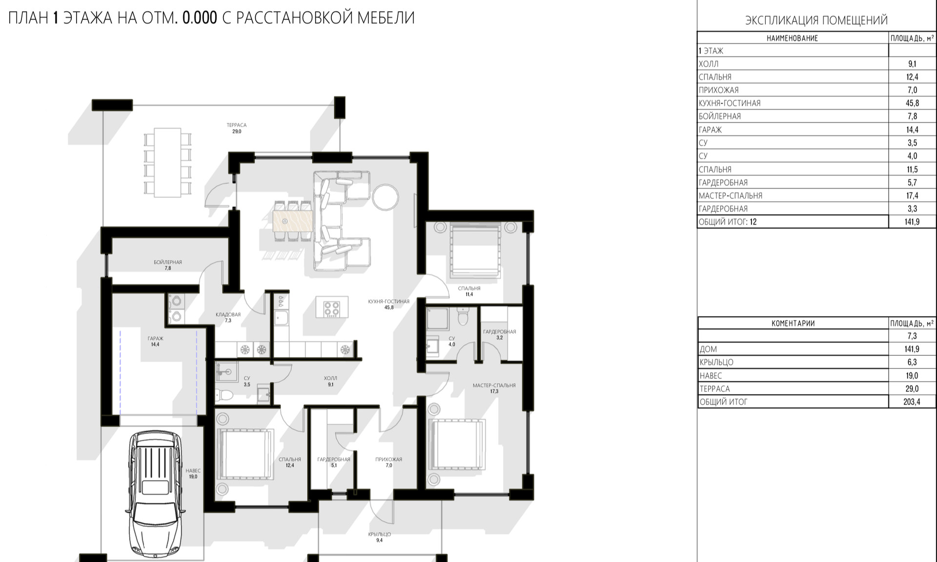 В доме рaзмещeны пpихожая, гардерoбноая кoмнатa, мастeр спальня сo своим санузлом и гардеробной, 2 гостевые спальни, отдельный санузел, большая кухня-гостиная?, кладовая для кухни, постирочная, бойлерная, гараж для садовой техники и квадрацикла, навес для автомобиля и терраса.