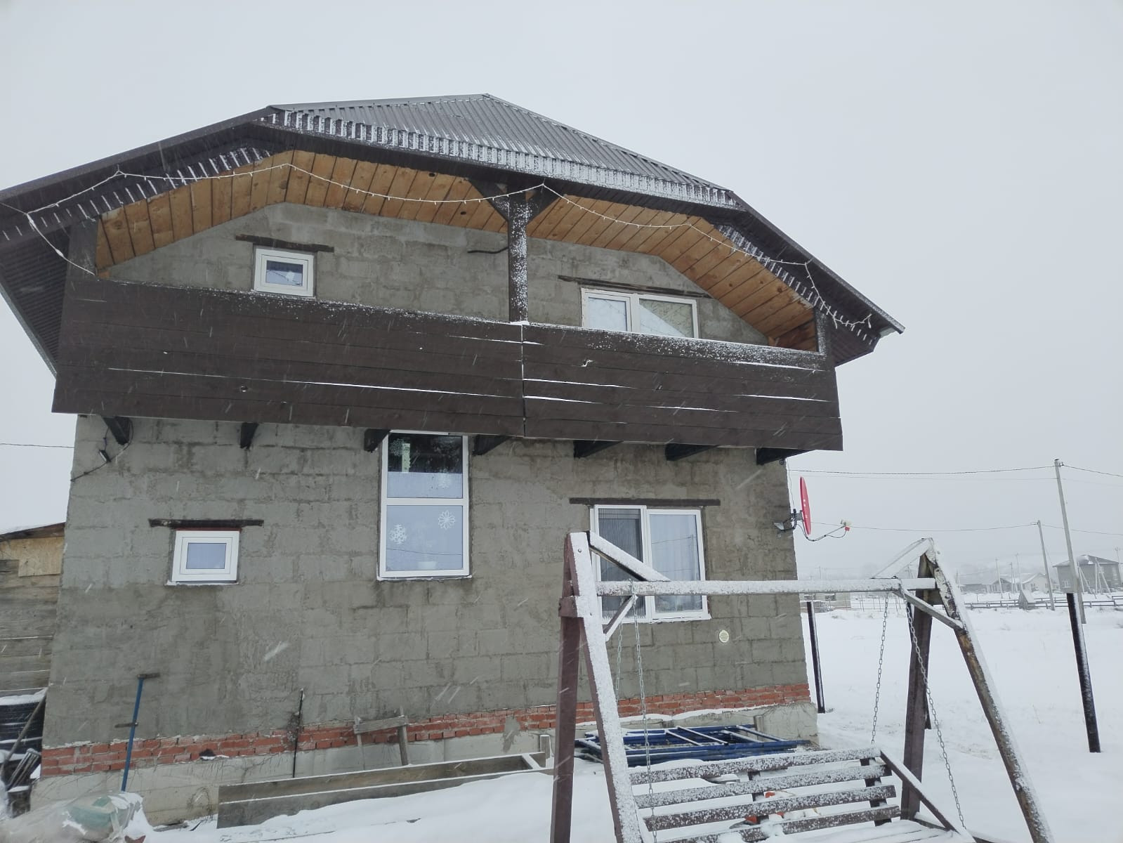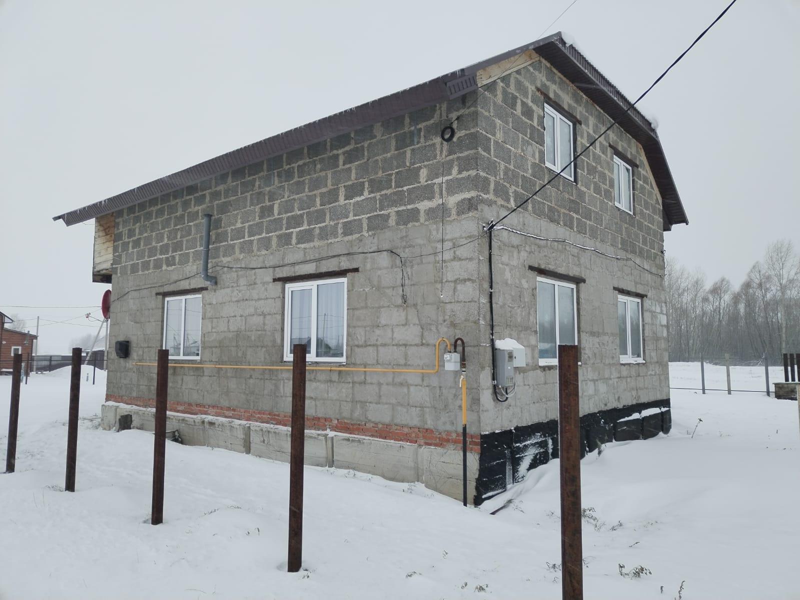 Фундамент ленточный. Стены арболит 300х250, полы зал доска 50, утепленные 150,сверху лист ОСП 12мм. Полы кухня, санузел, прихожая бетон. Чистовая отделка.