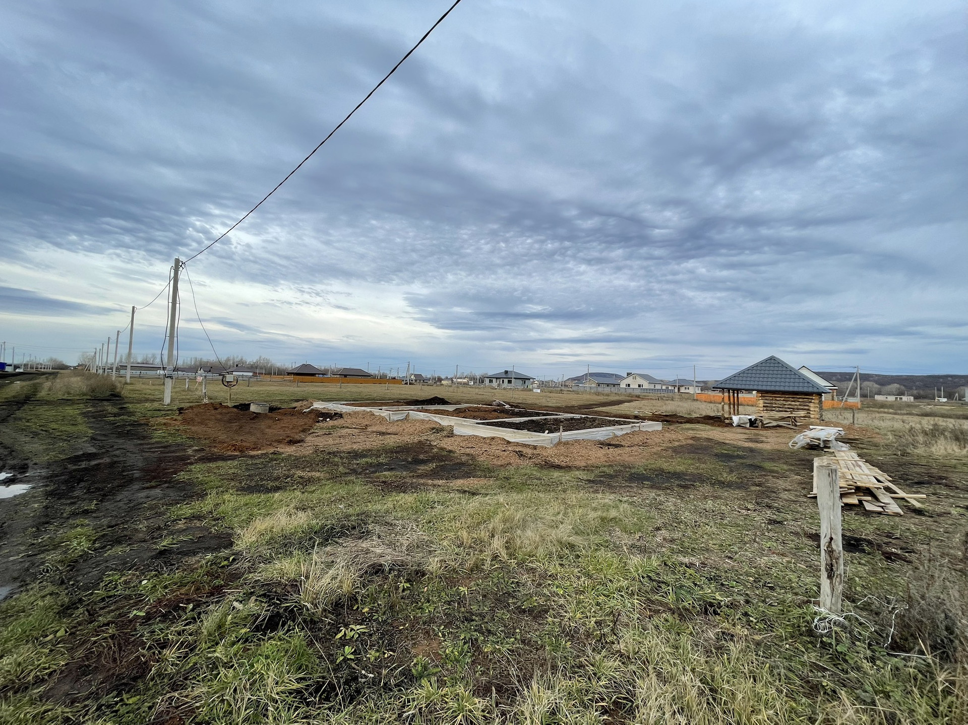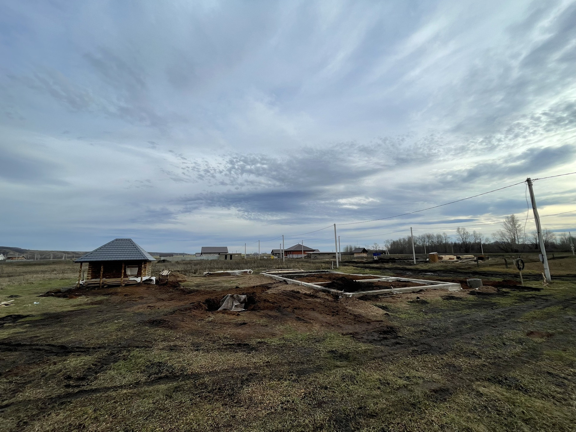 8 соток, баня 5х5 выступ, фундамент под дом 16,8х8,9 (150 квадратных метров) глубокий 1,5 метра, можно поставить 2х этажный дом,