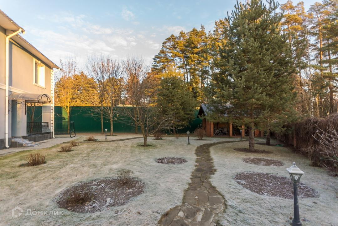 На прилегающем участке проведены ландшафтные работы, высажены газон, кустарники, растут деревья, построены гараж и беседка.
