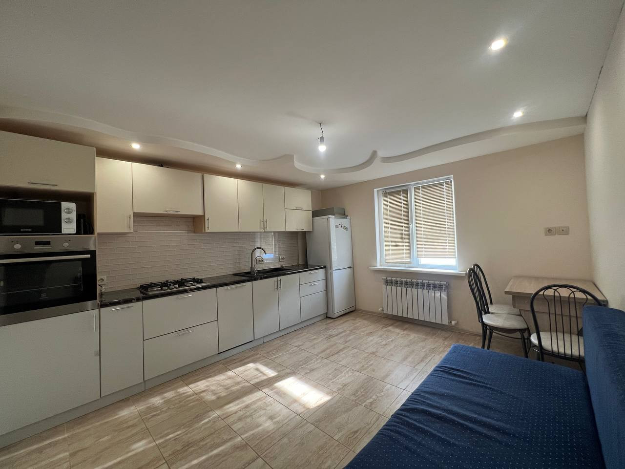 В доме сделан качественный ремонт: на кухне, в прихожей, в ванной и туалете система тёплый пол из керамогранита. В зале и спальне утеплённые полы, покрытые качественным линолеумом. Потолки двухуровневые из гипсокартона. Кухня новая, со встроенной новой, современной техникой (посудомоечная машина, варочная панель газовая, духовой шкаф электрический, микроволновая печь). В ванной стиральная машина, полотенцесушитель. Сантехника дорогая и качественная. Санузел раздельный. В спальне встроенный шкаф-купе с освещением. Стеклопакеты качественные с 3ым остеклением, с гарантией 10л.