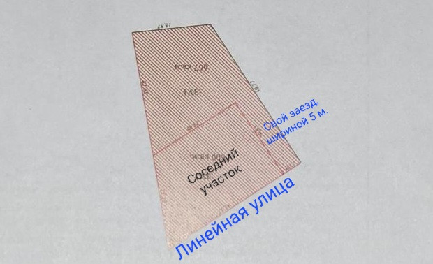 Свой заезд с Линейной улицы шириной 5 метров и длиной ок. 21 метра т.е. 1,0 сотка.