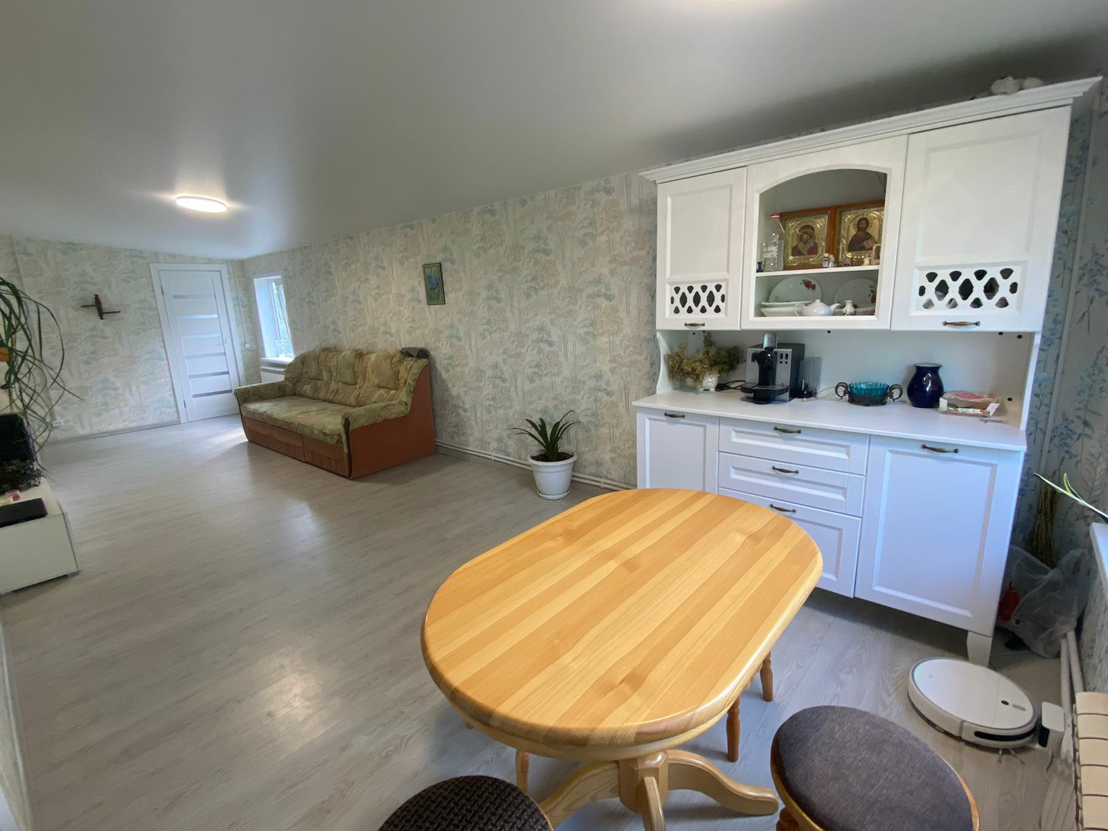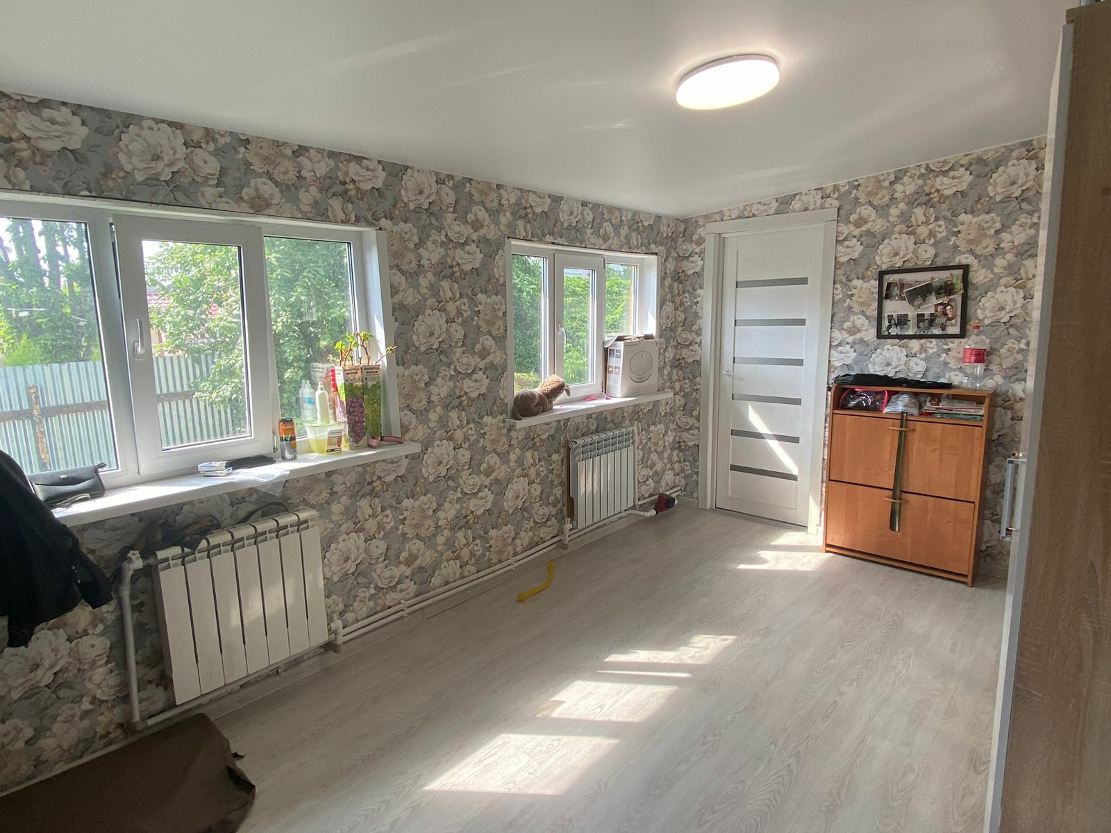 Внутренняя отделка всего дома выполнена качественными материалами, стены обшиты влагостойким гипсокартоном и поклеены обои, потолки натяжные(матовые), встроенные диодные светильники. Большую часть мебели оставляем по согласованию. Кухонный гарнитур, детская мебель, спальный гарнитур.Второй этаж без отделки, это мы оставляем вам как будущему покупателю испробовать свои дизайнерские фантазии. планировка дома уникальная и необычная, комнаты: детская, спальня родителей, кухня-столовая, коридор, бойлерная. На первом этаже санузел с душевой. Все оборудование в санузле оставляем.