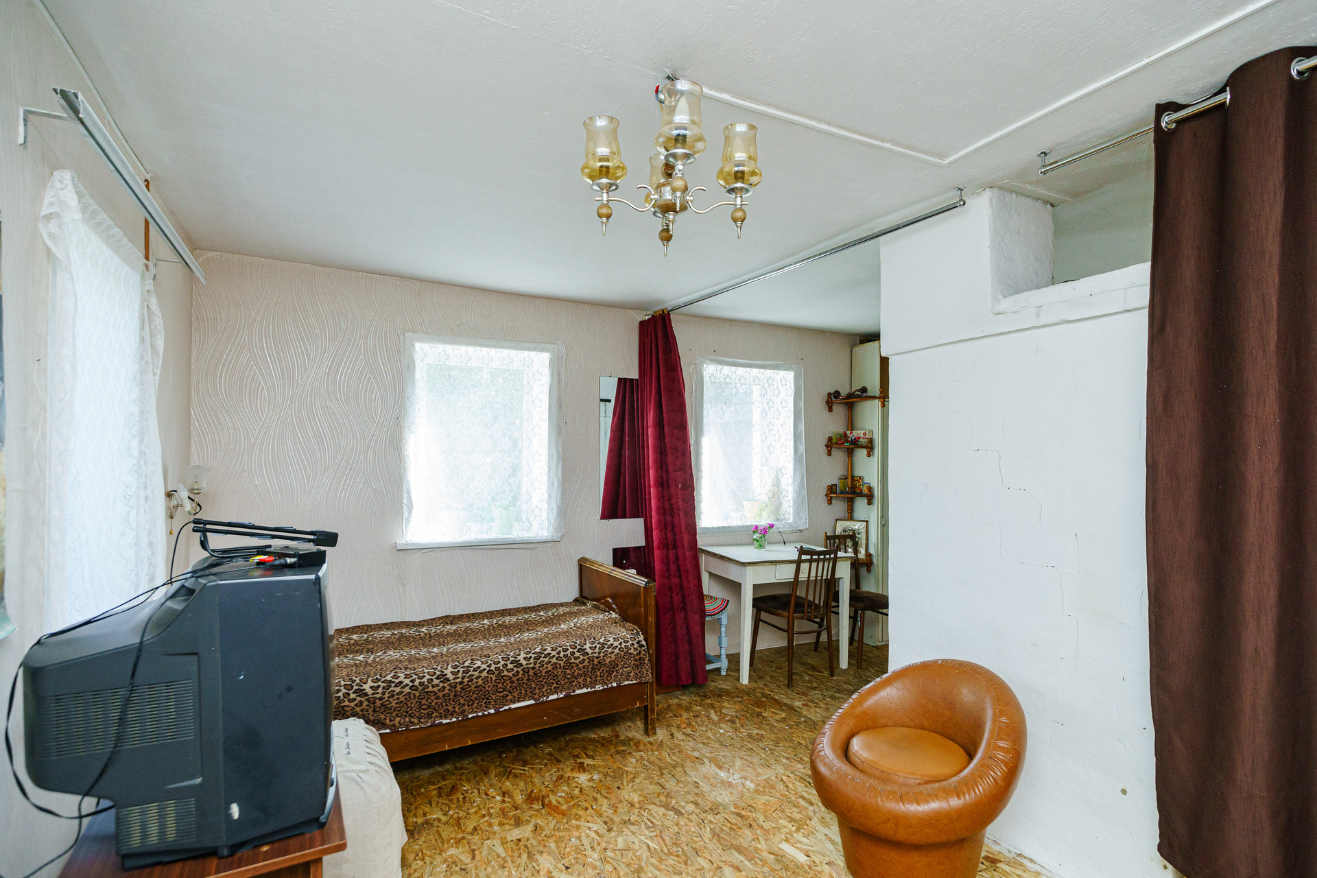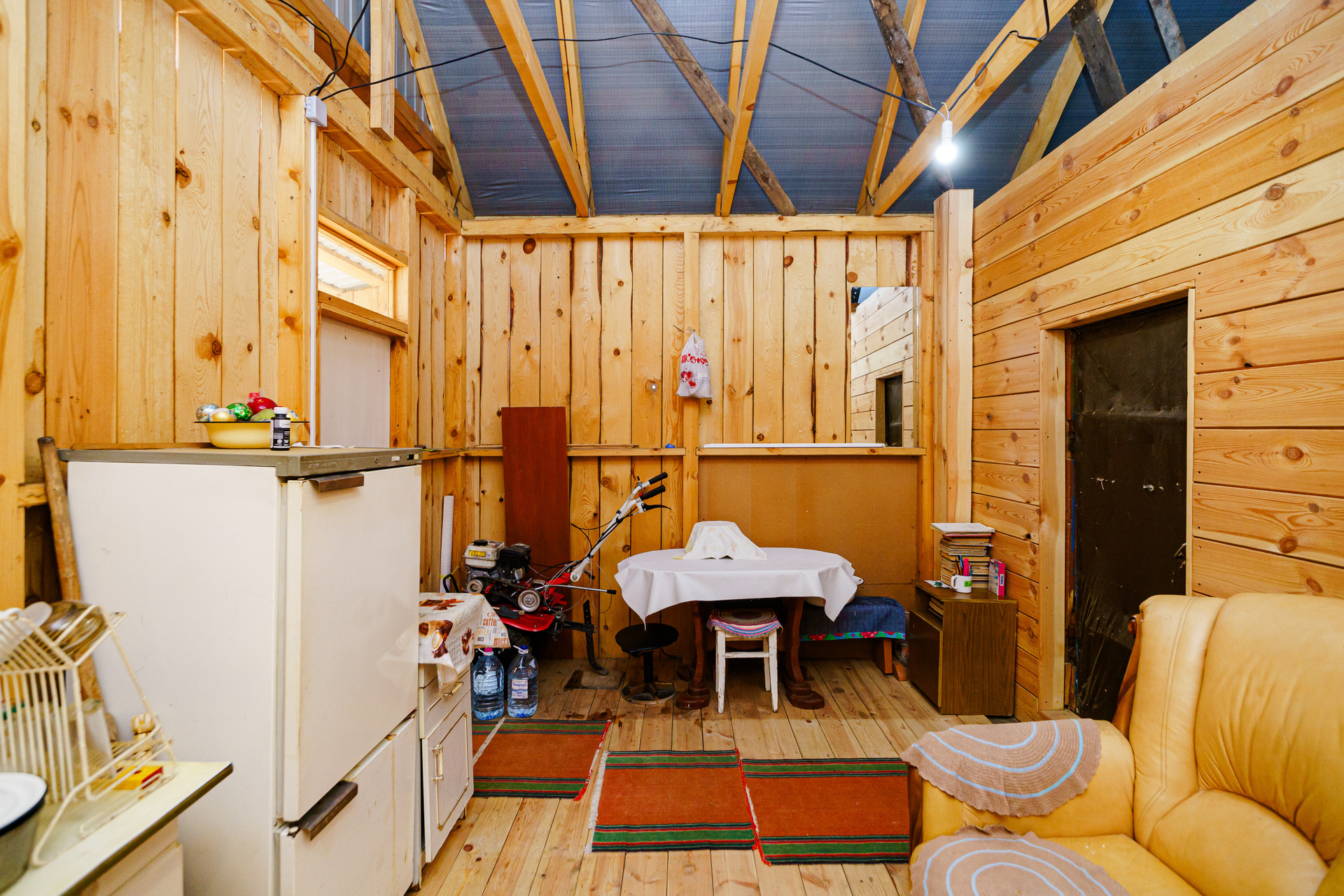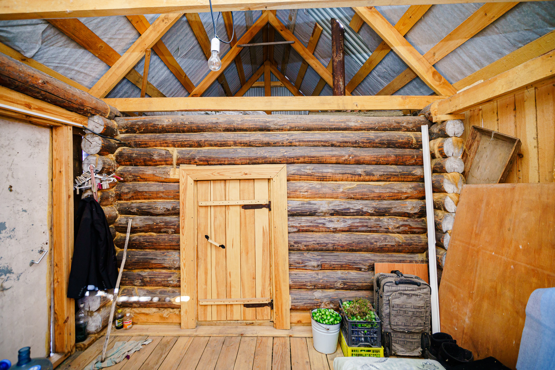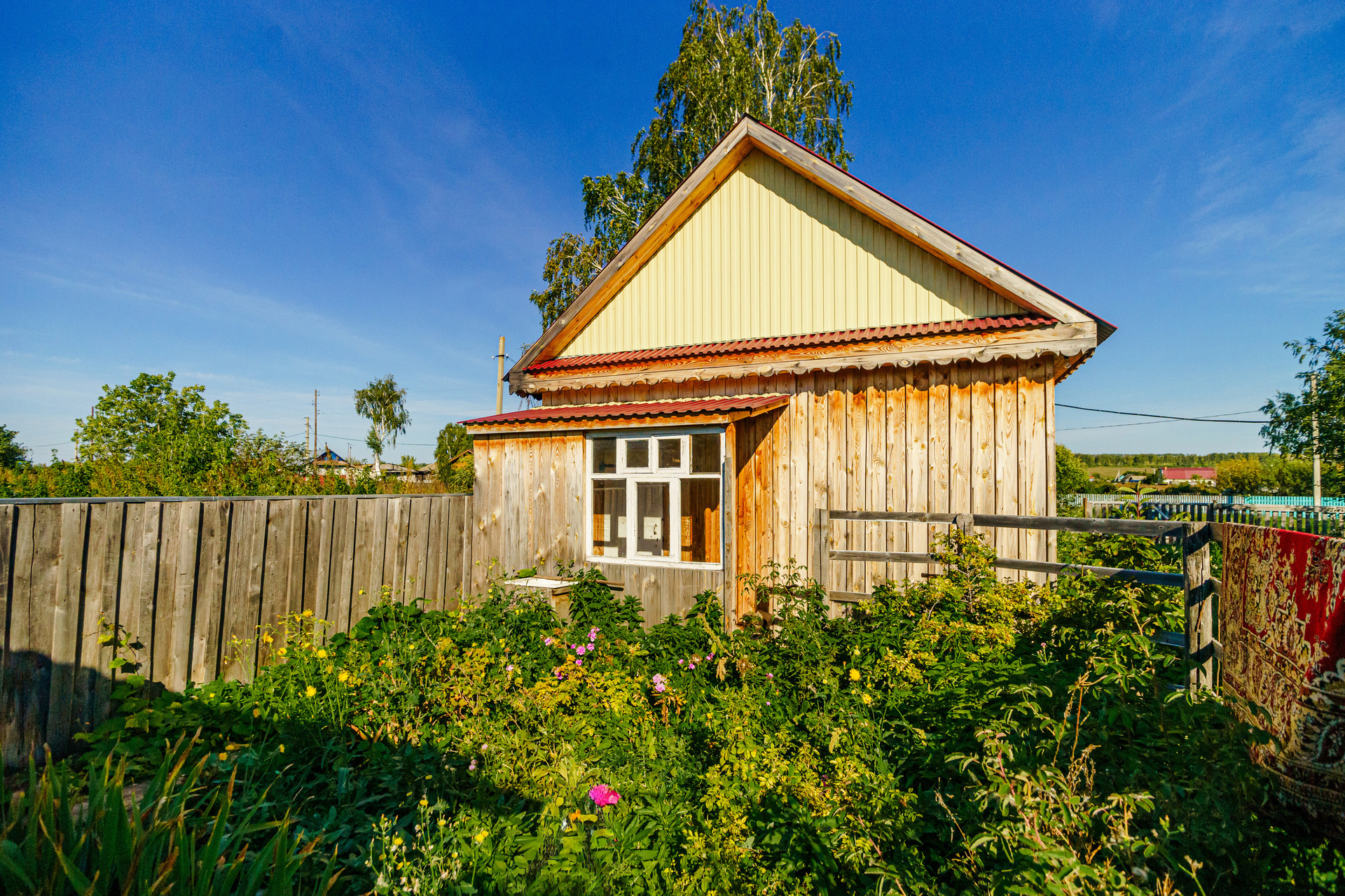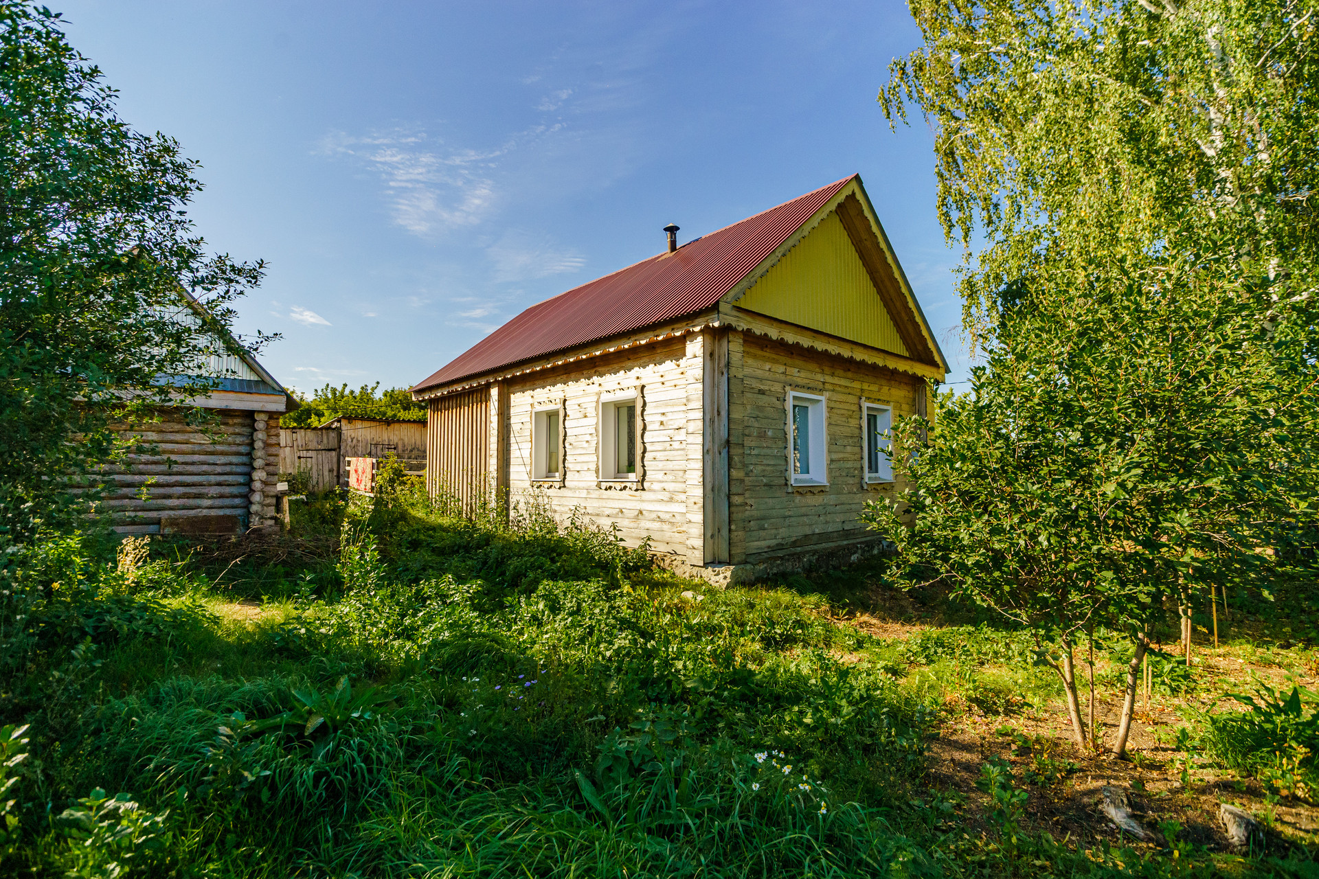 Дом построен из цельного бревна, крыша из металлического профильного листа, окна пластиковые, внутри имеется огромный тамбур, который можно обустроить под полноценную гостиную.