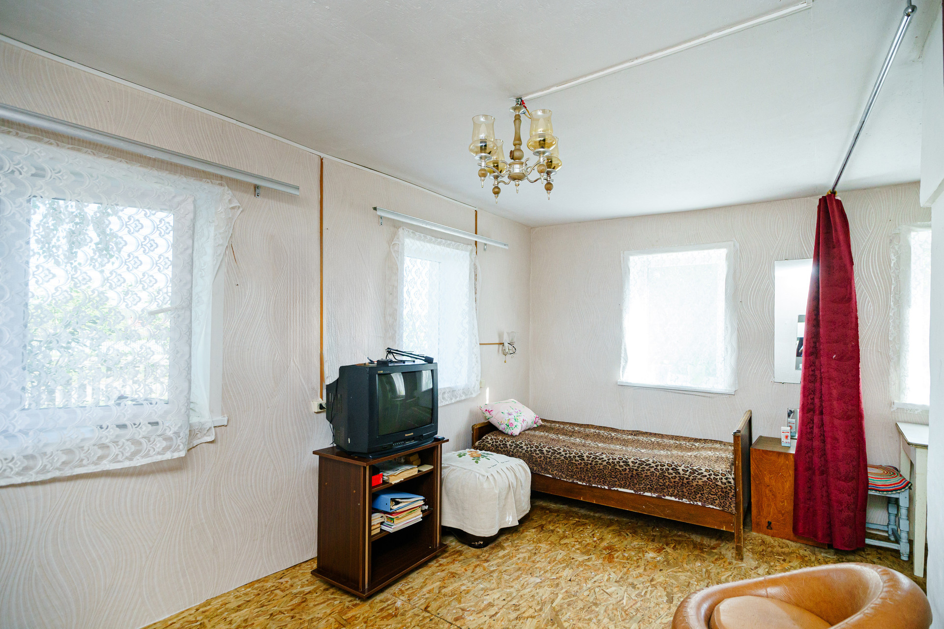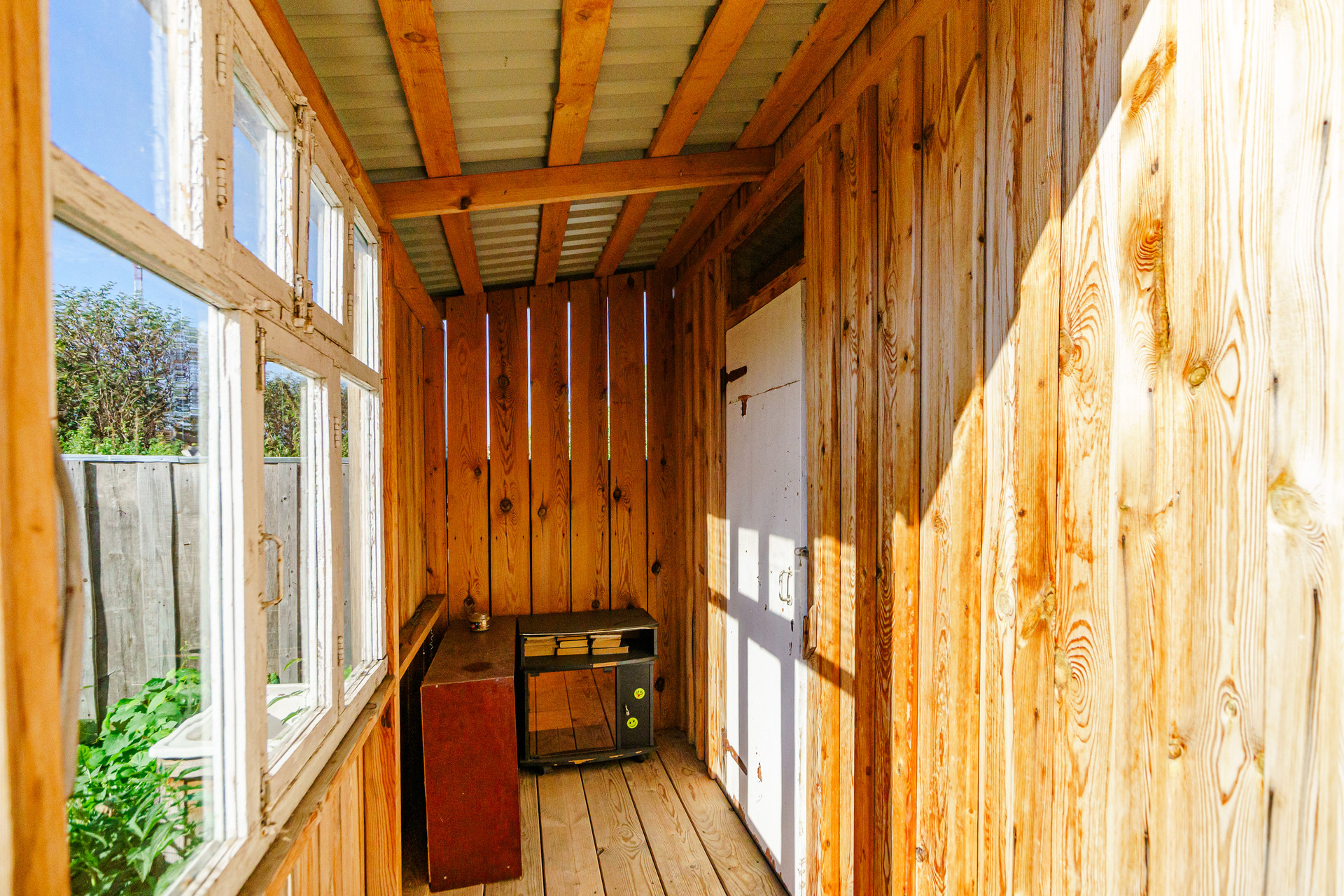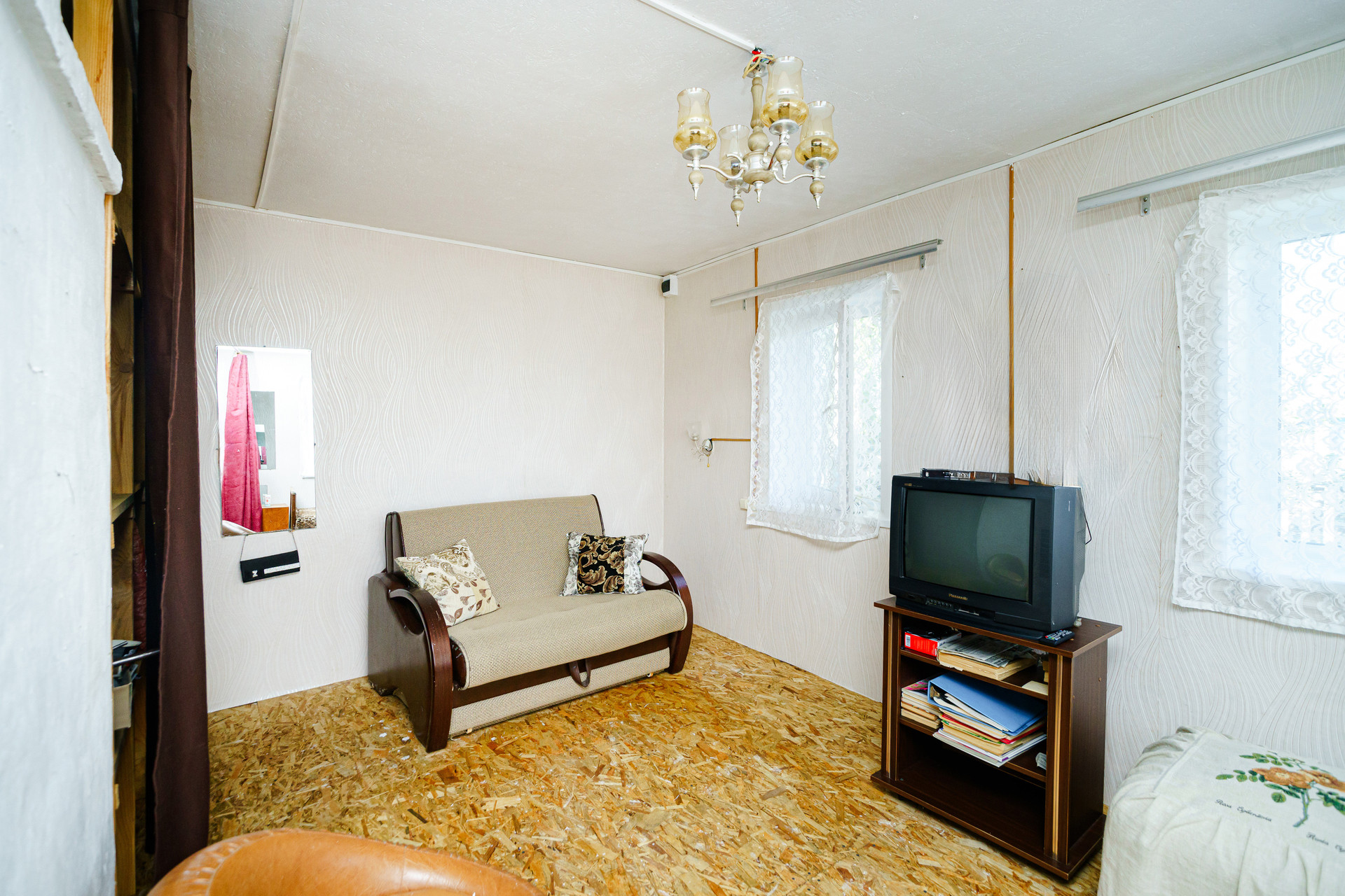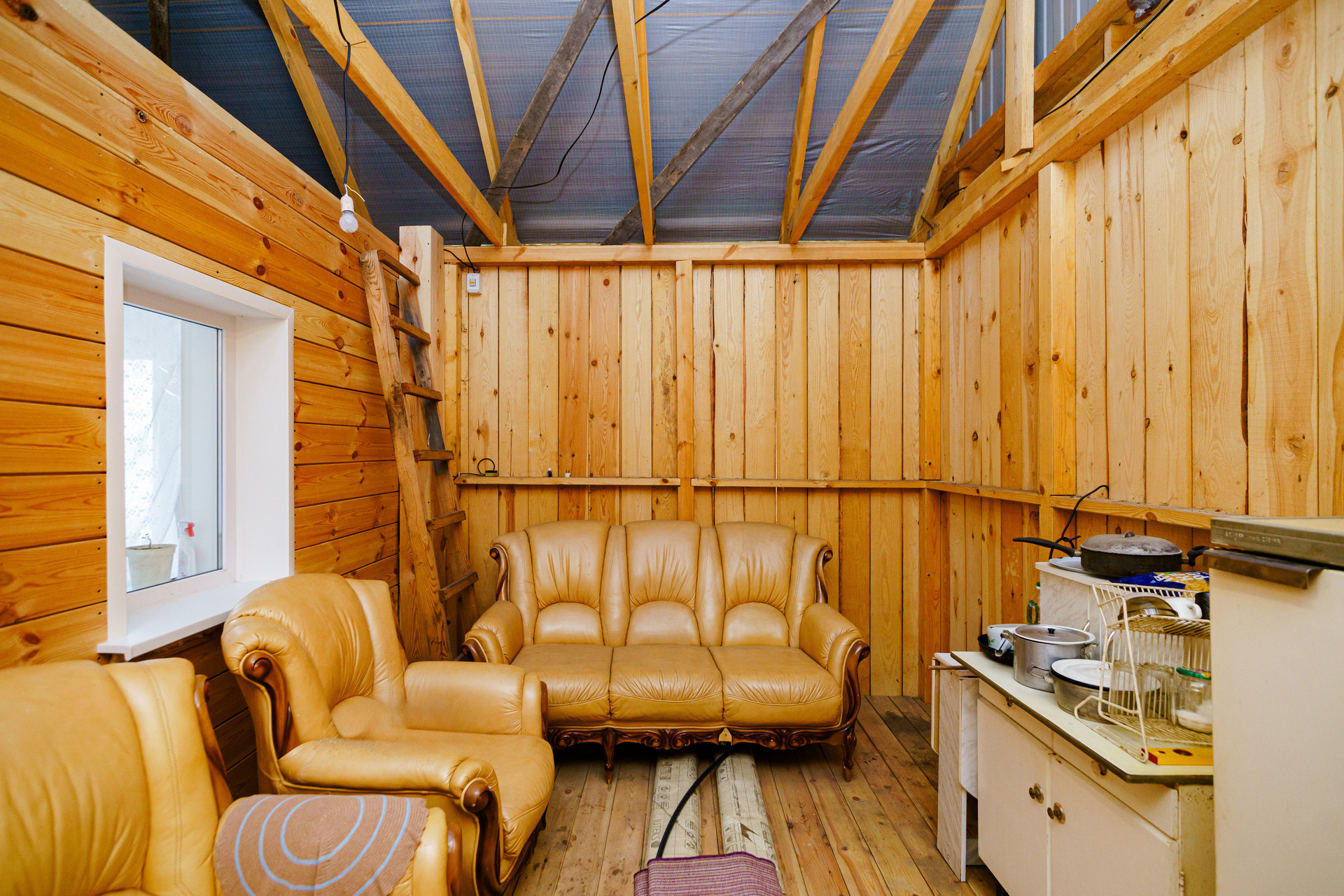 Дом построен из цельного бревна, крыша из металлического профильного листа, окна пластиковые, внутри имеется огромный тамбур, который можно обустроить под полноценную гостиную.