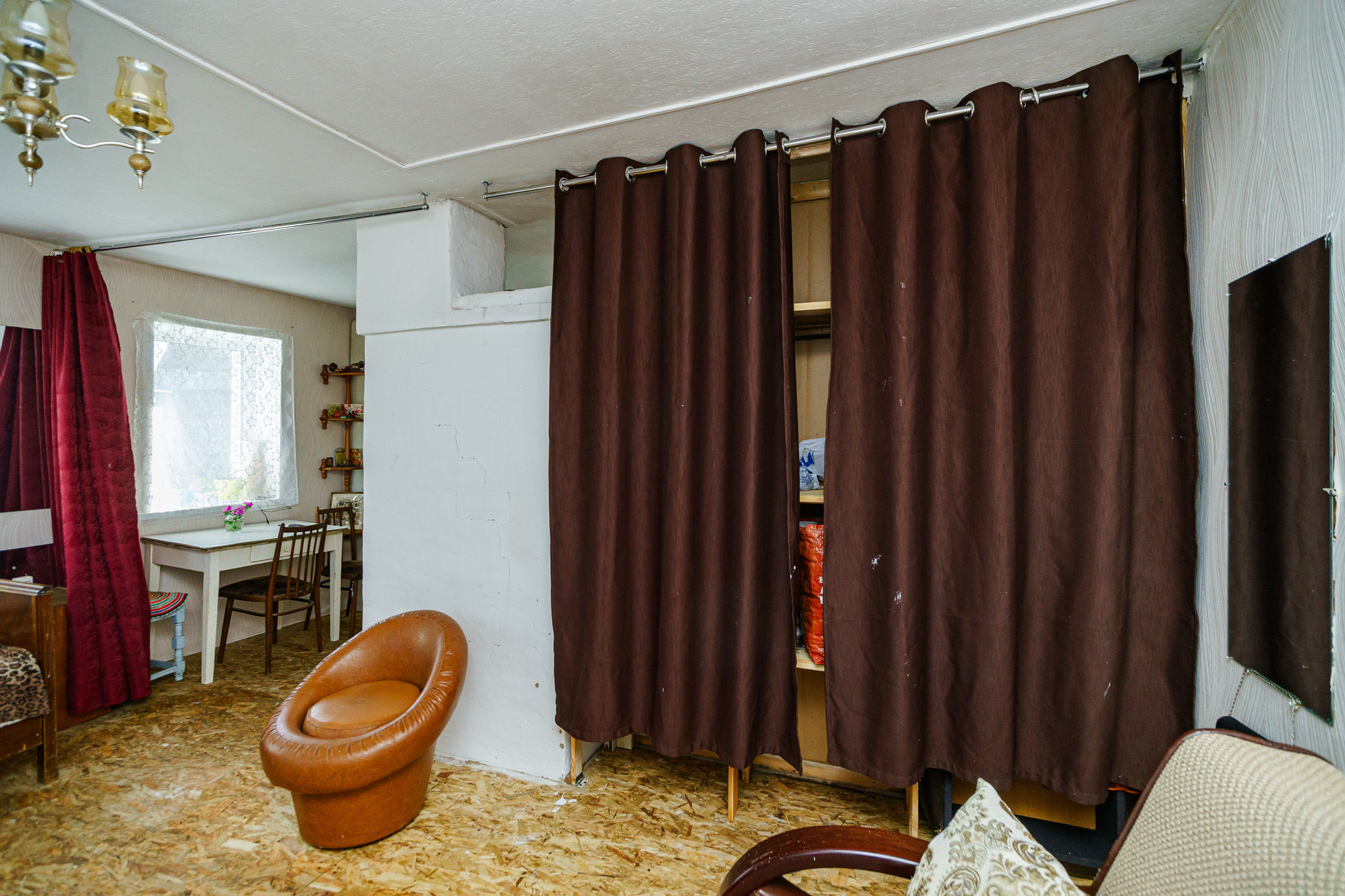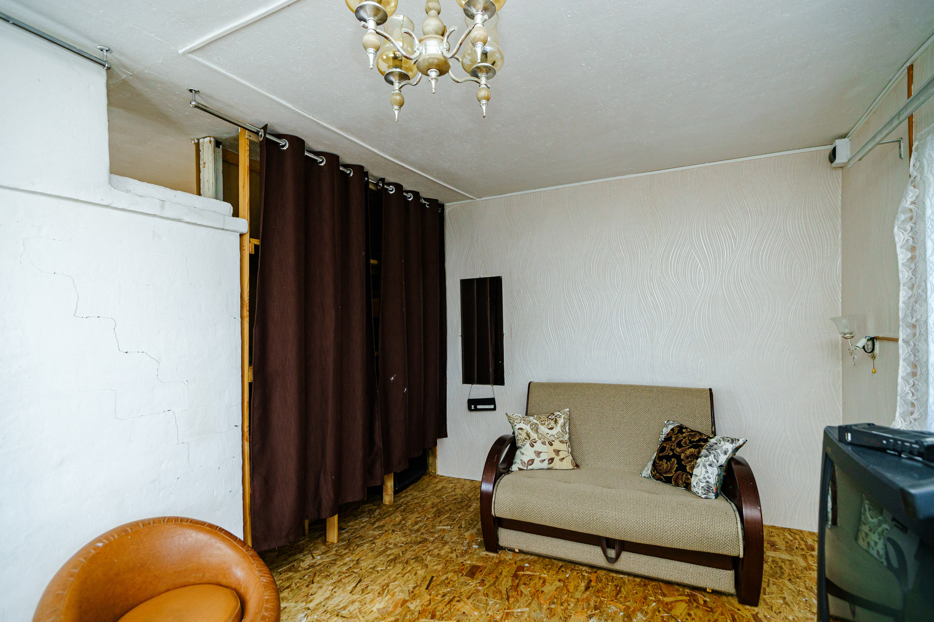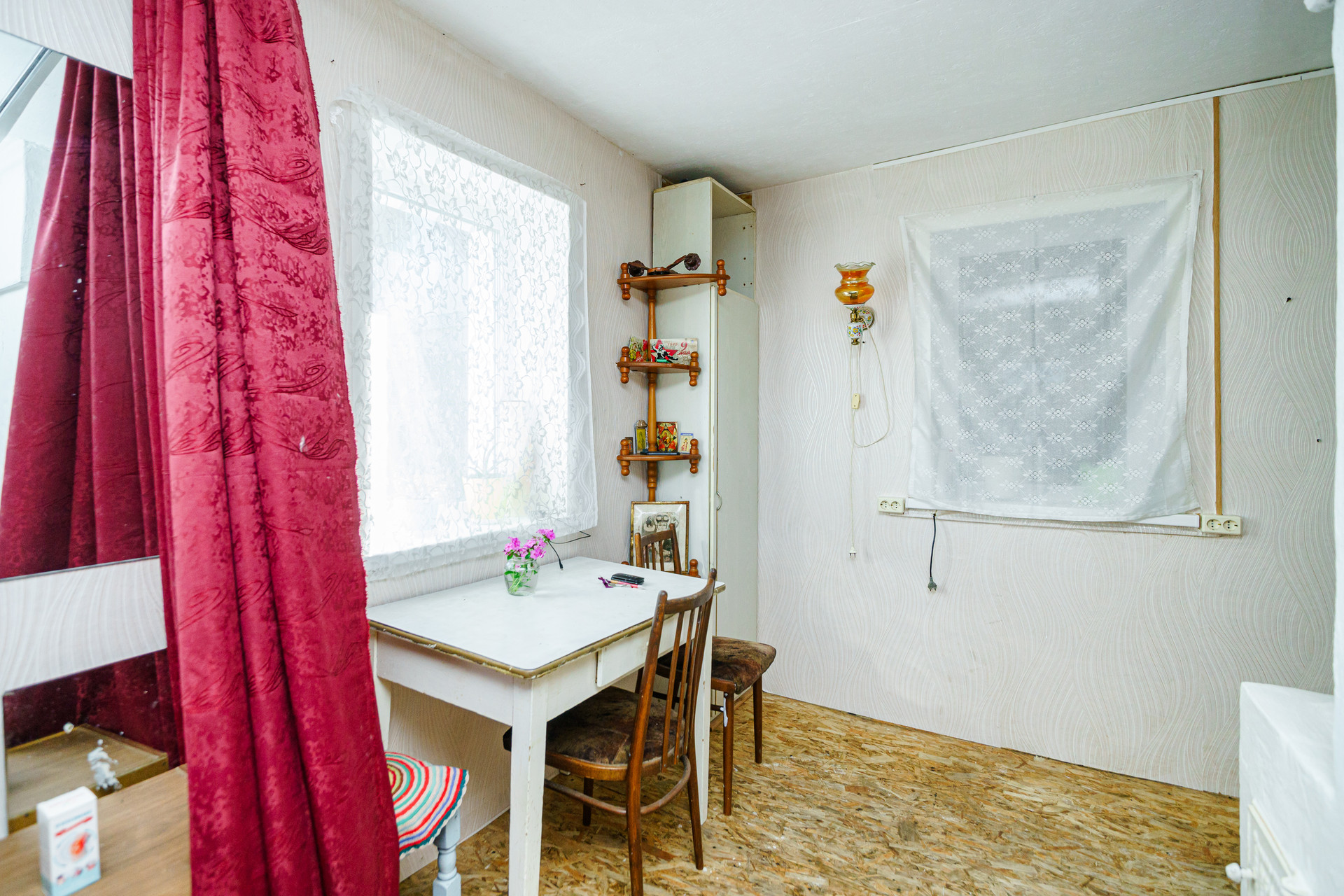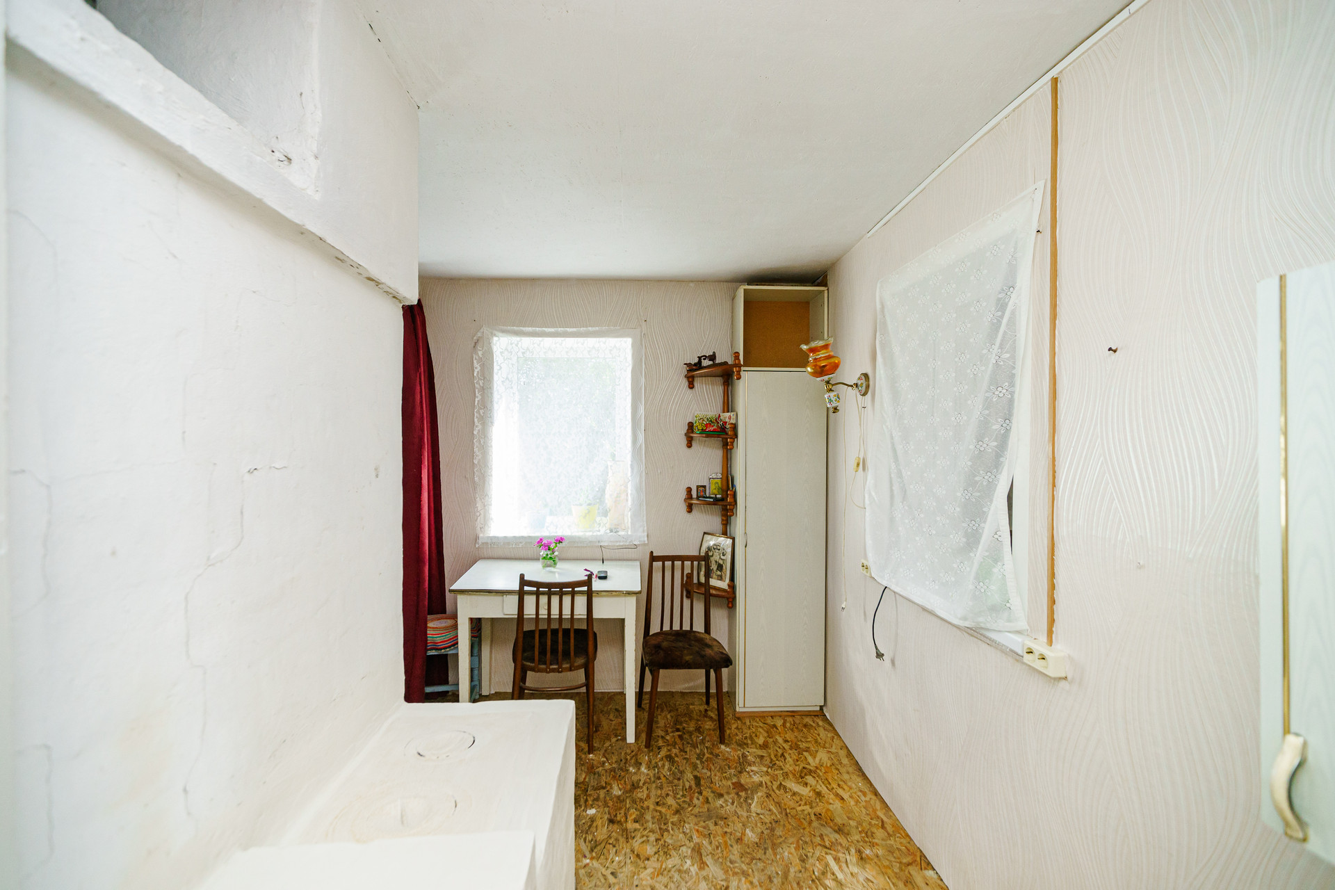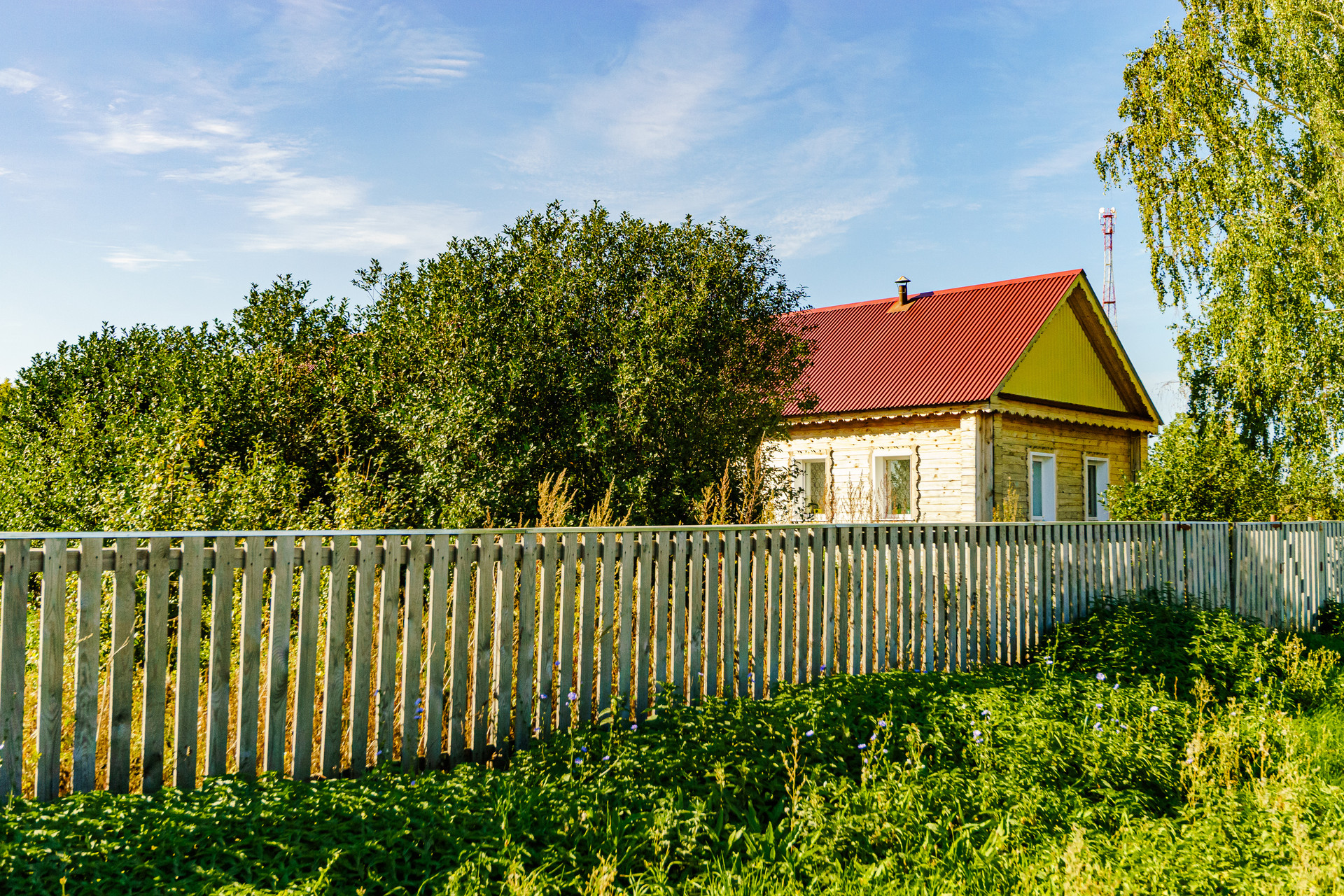 Дом построен из цельного бревна, крыша из металлического профильного листа, окна пластиковые, внутри имеется огромный тамбур, который можно обустроить под полноценную гостиную.