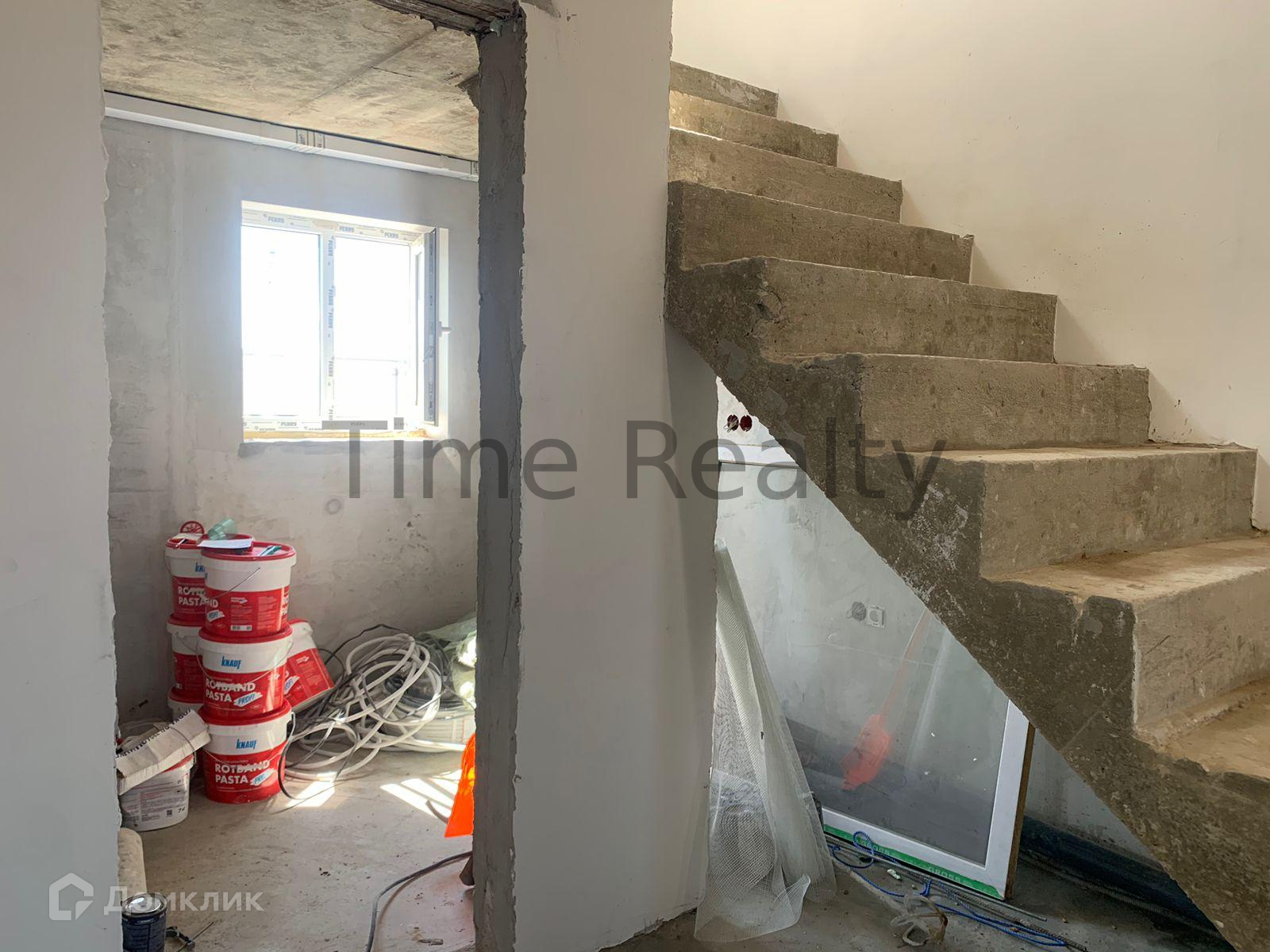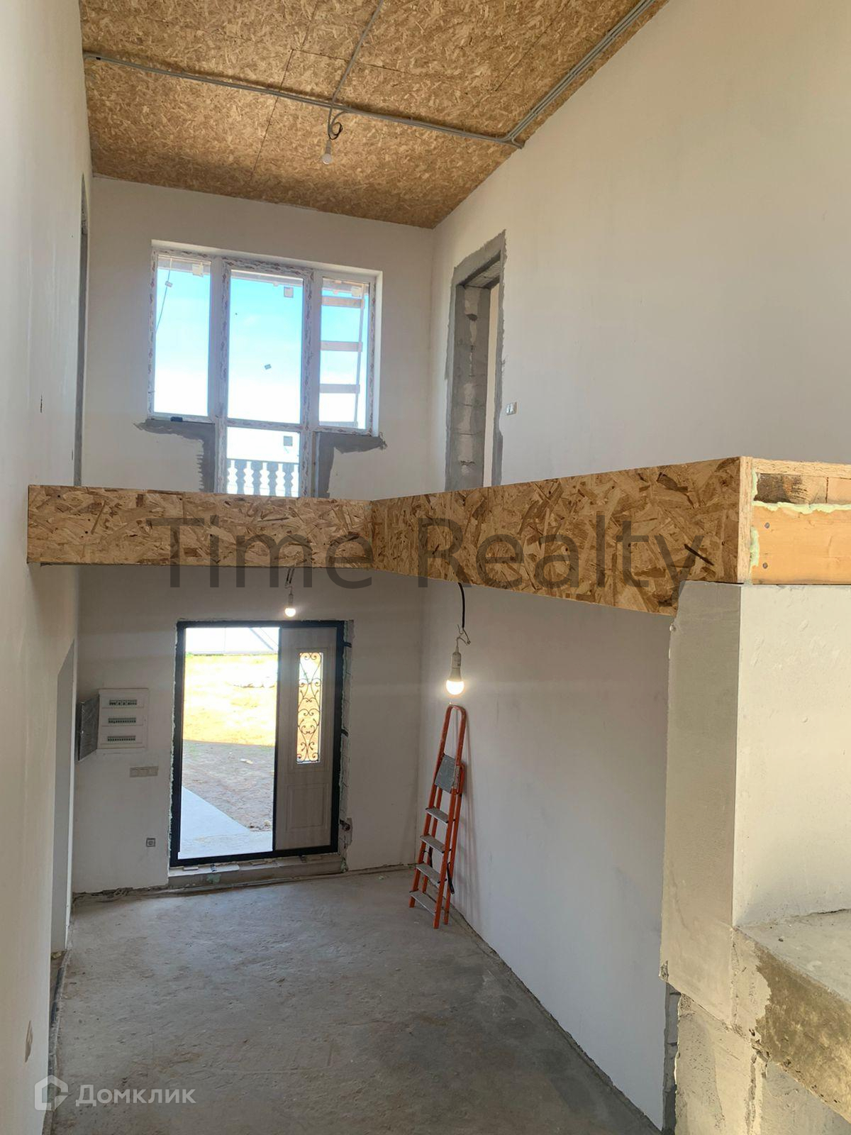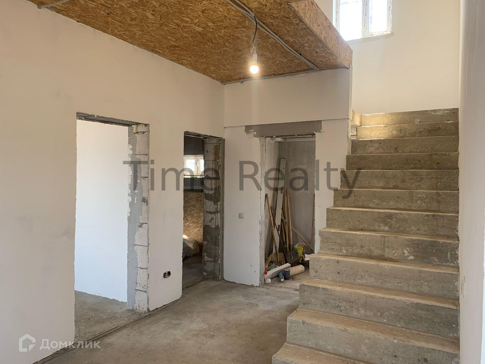 Первый этаж высотой 3,2 метра. На первом этаже расположены кухня-гостиная 26 кв.м. включает кухонную зону, изолированная комната 15,7 кв.м., просторная прихожая 20 кв.м., а также совмещенный санузел 10 кв.м., котельная (помещение под лестницей) 5,4 кв.м.. Удобная широкая бетонная лестница ведёт на второй этаж, на лестничной площадке между 1 и 2 этажами расположено окно.