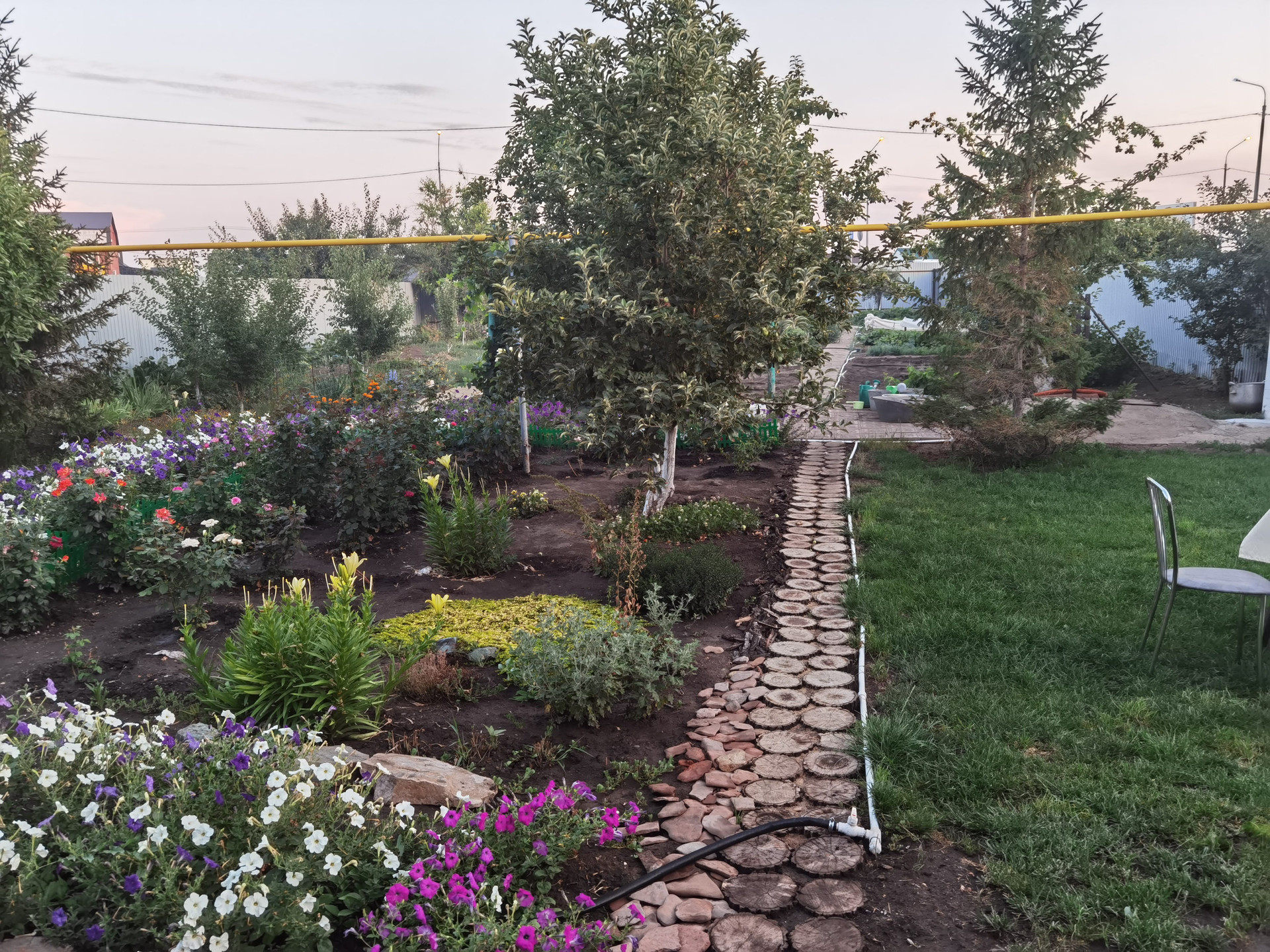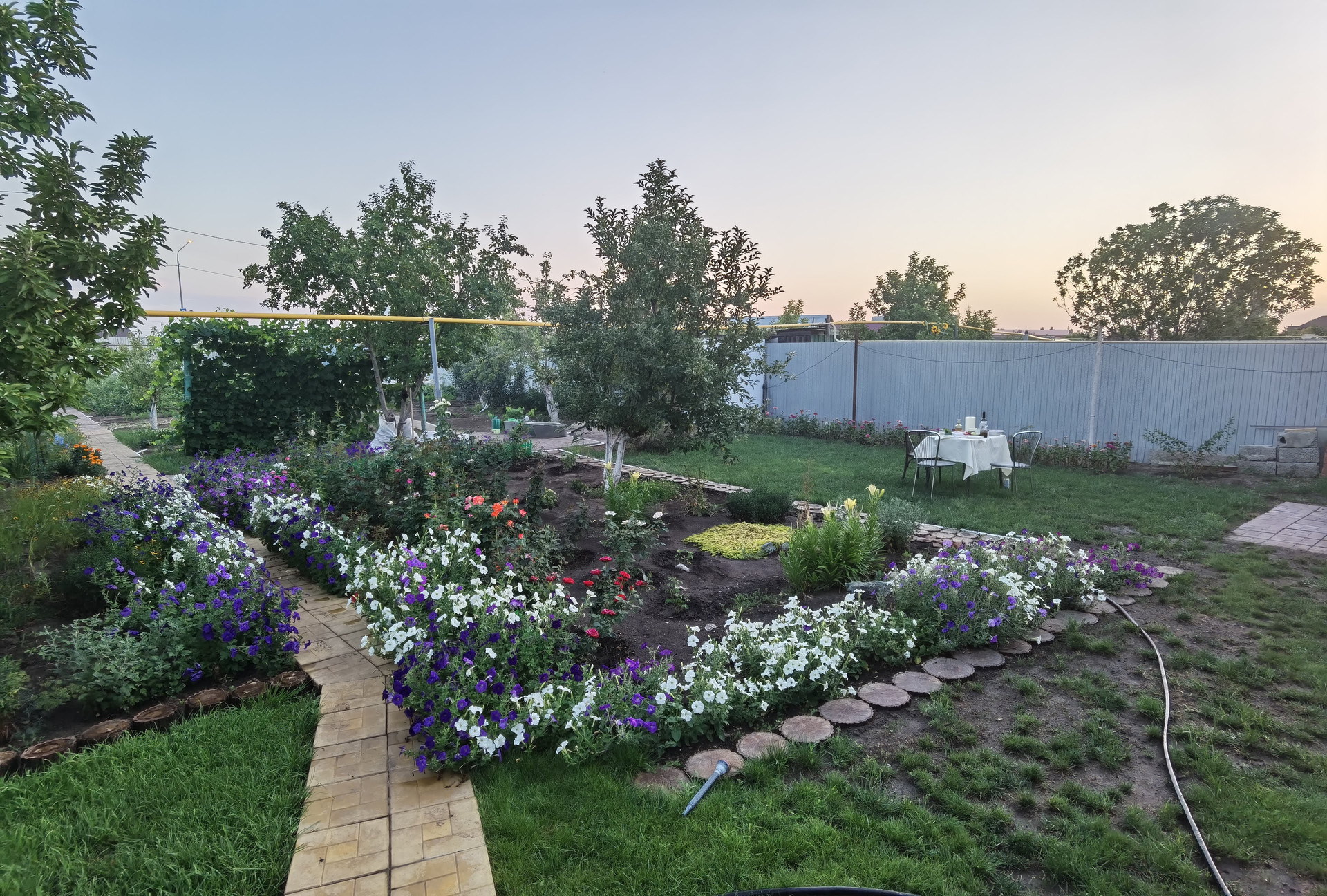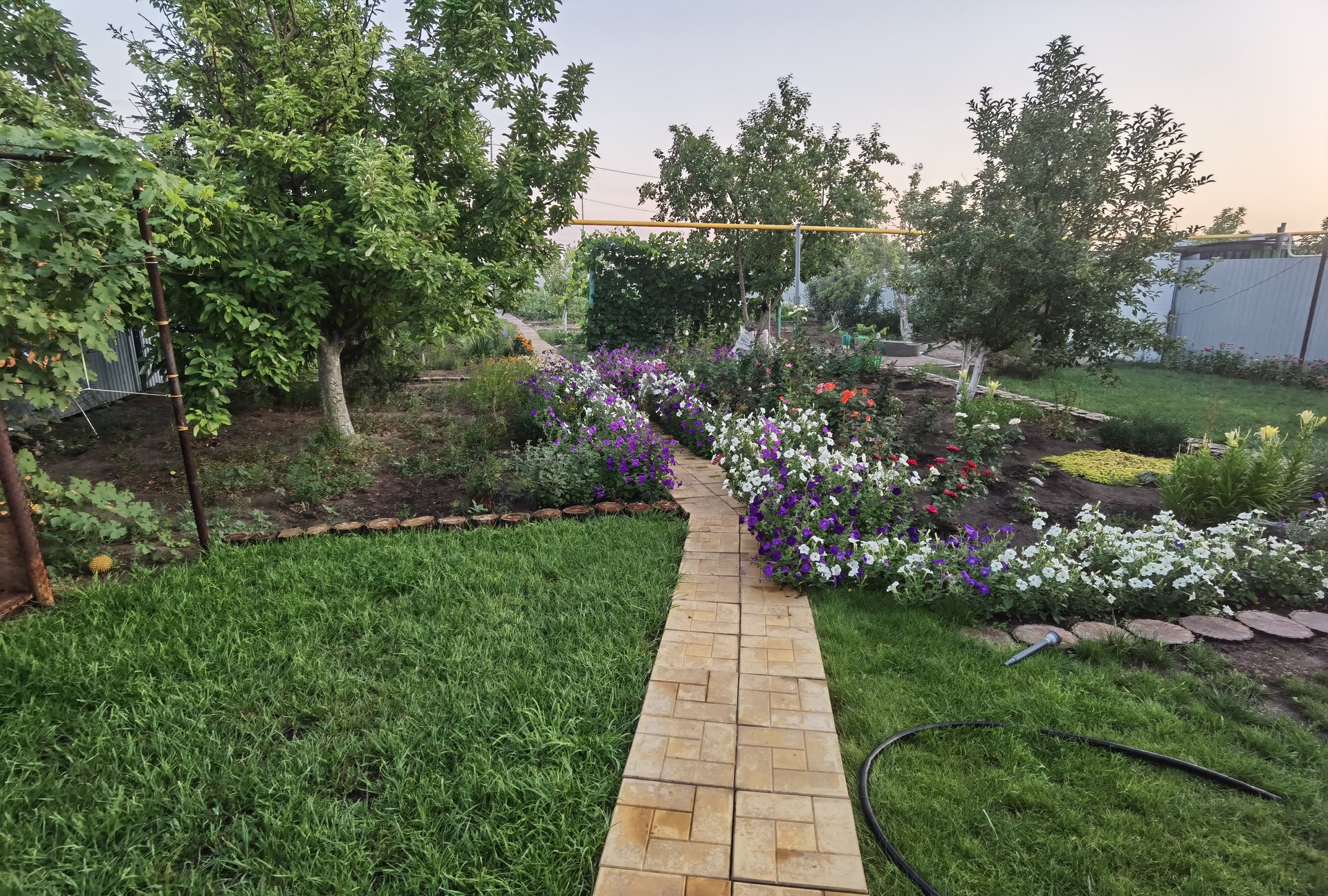 На территории высажены деревья, цветы, газон, тропинка мощеная кругляком.