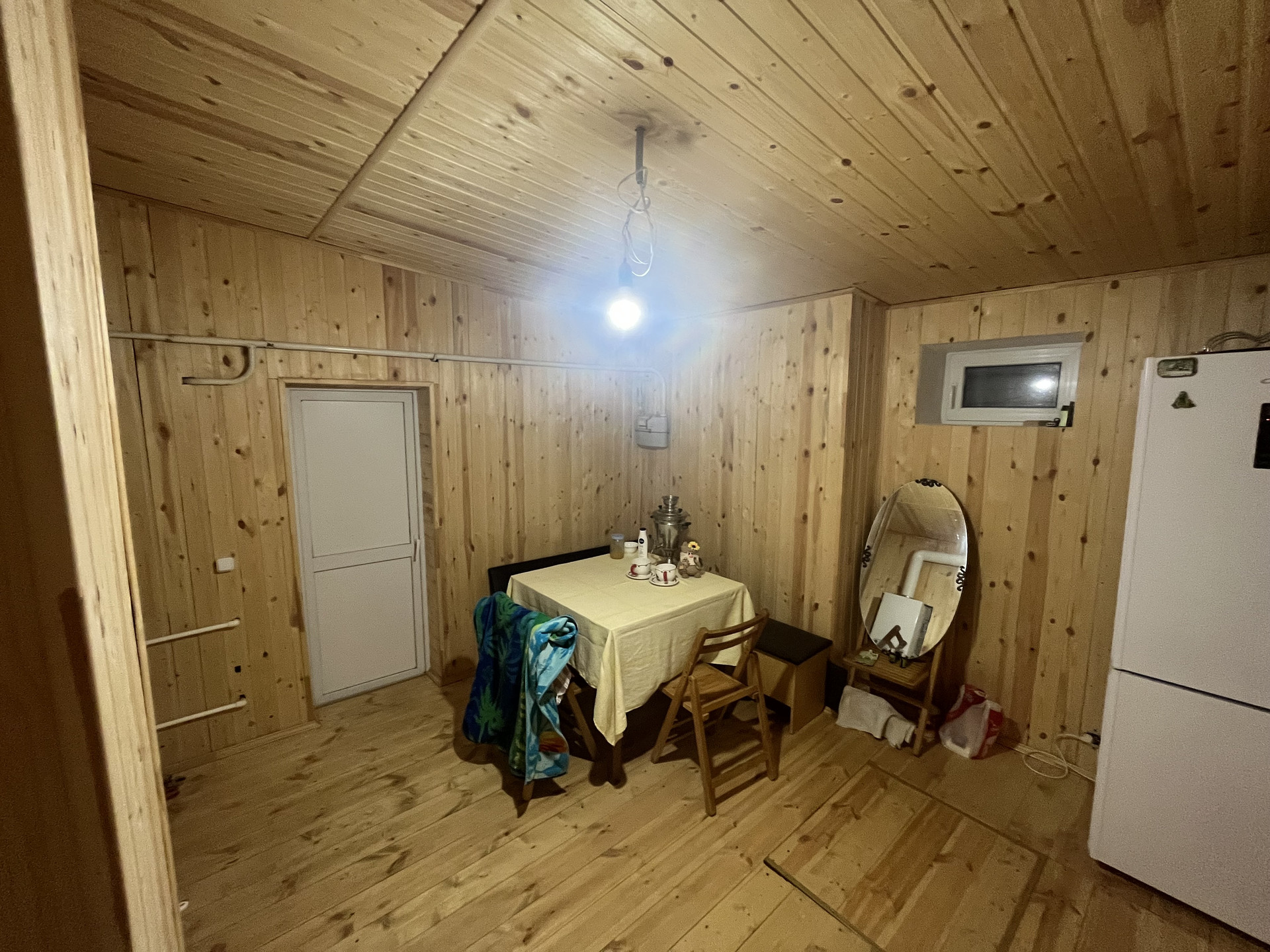 1 этаж: комната с камином, спальня, кухня и санузел.