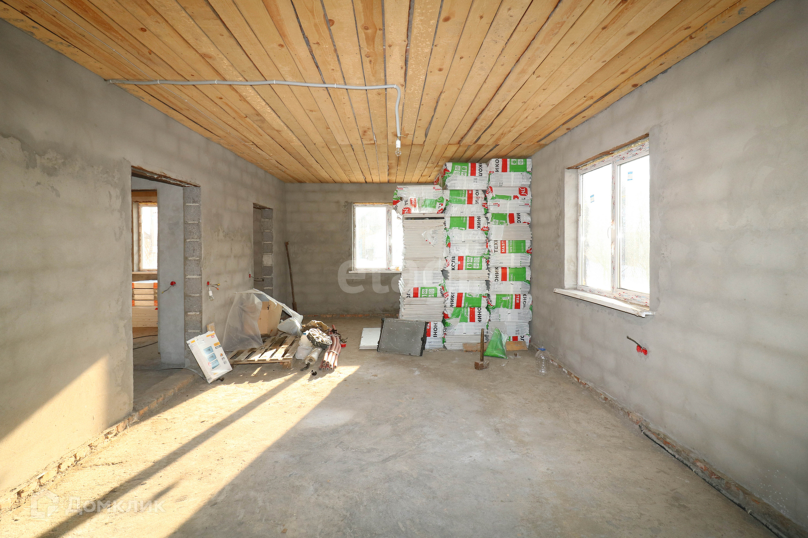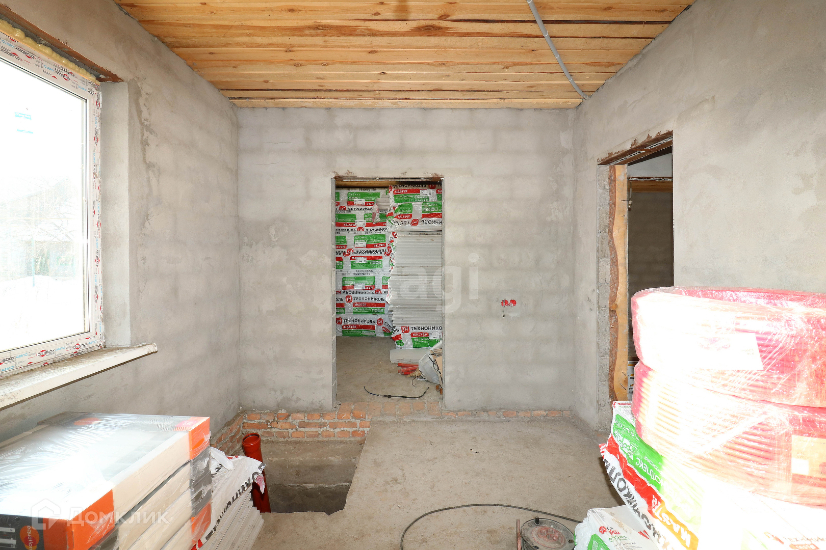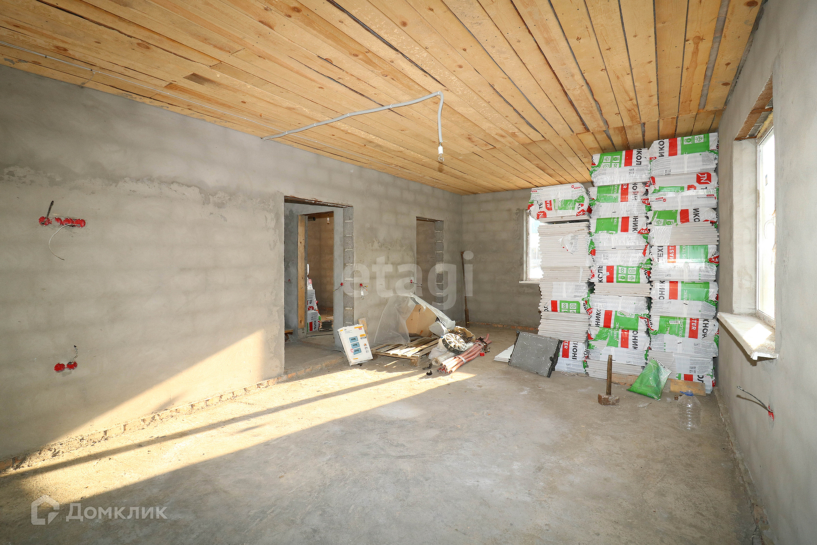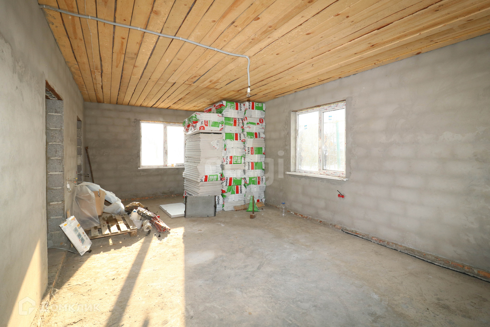 Дом построен из керамзитоблока, закуплен утеплитель Теплониколь. Деревянные плиты перекрытия.