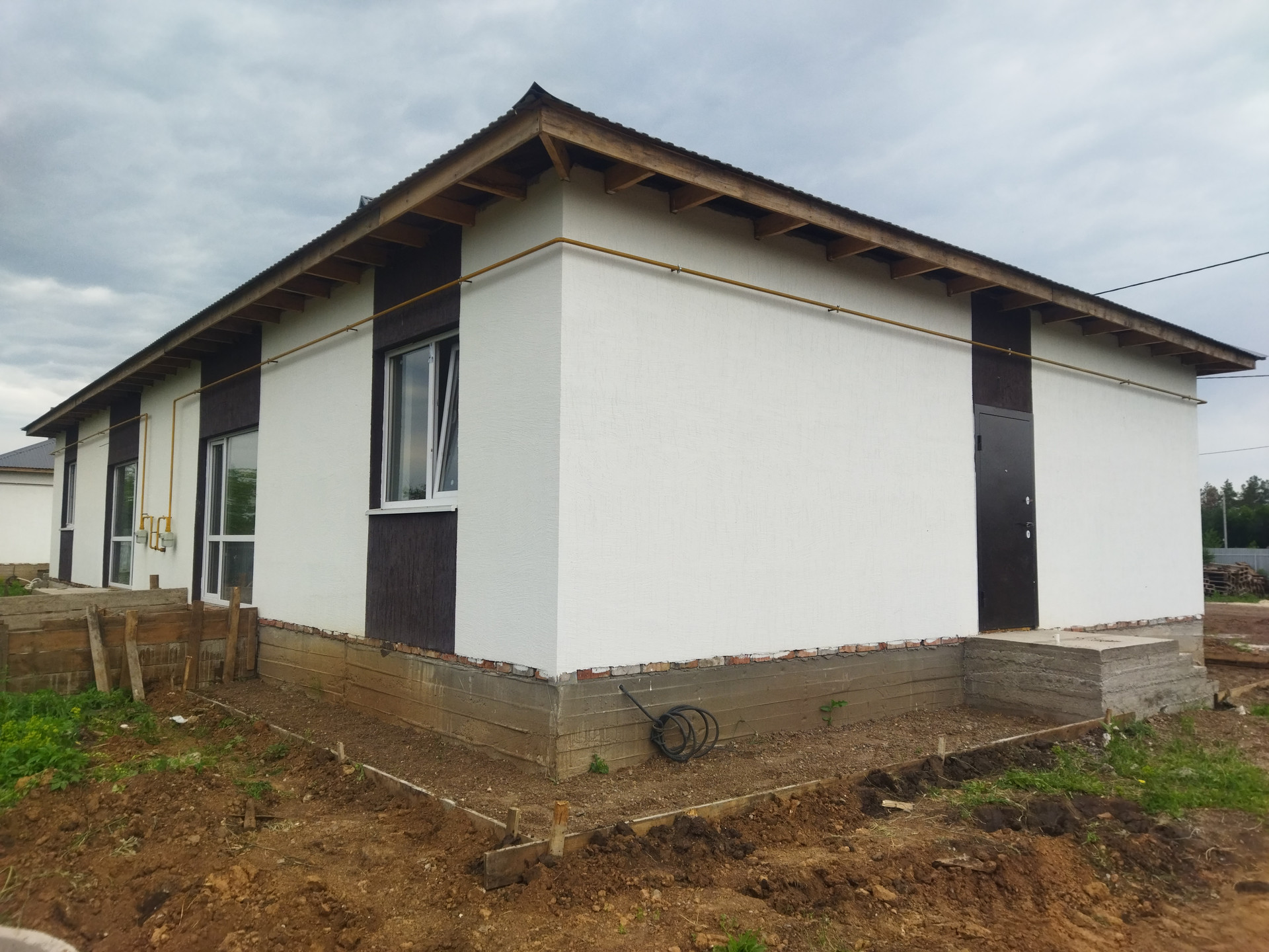 Стены дома - керамзитоблок, утеплитель, фасад - короед. Кровля - металлочерепица.