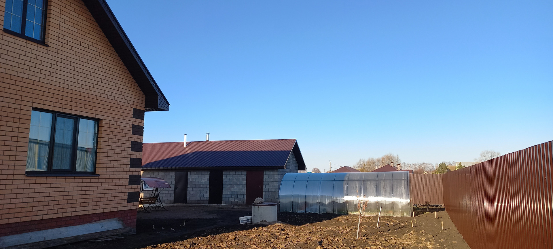Участок огорожен забором по всему периметру. На участке гараж,баня,хоз. постройки. Длина 22 м. Во дворе имеется колодец, теплица, качели.