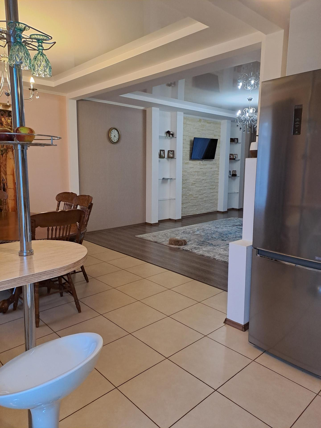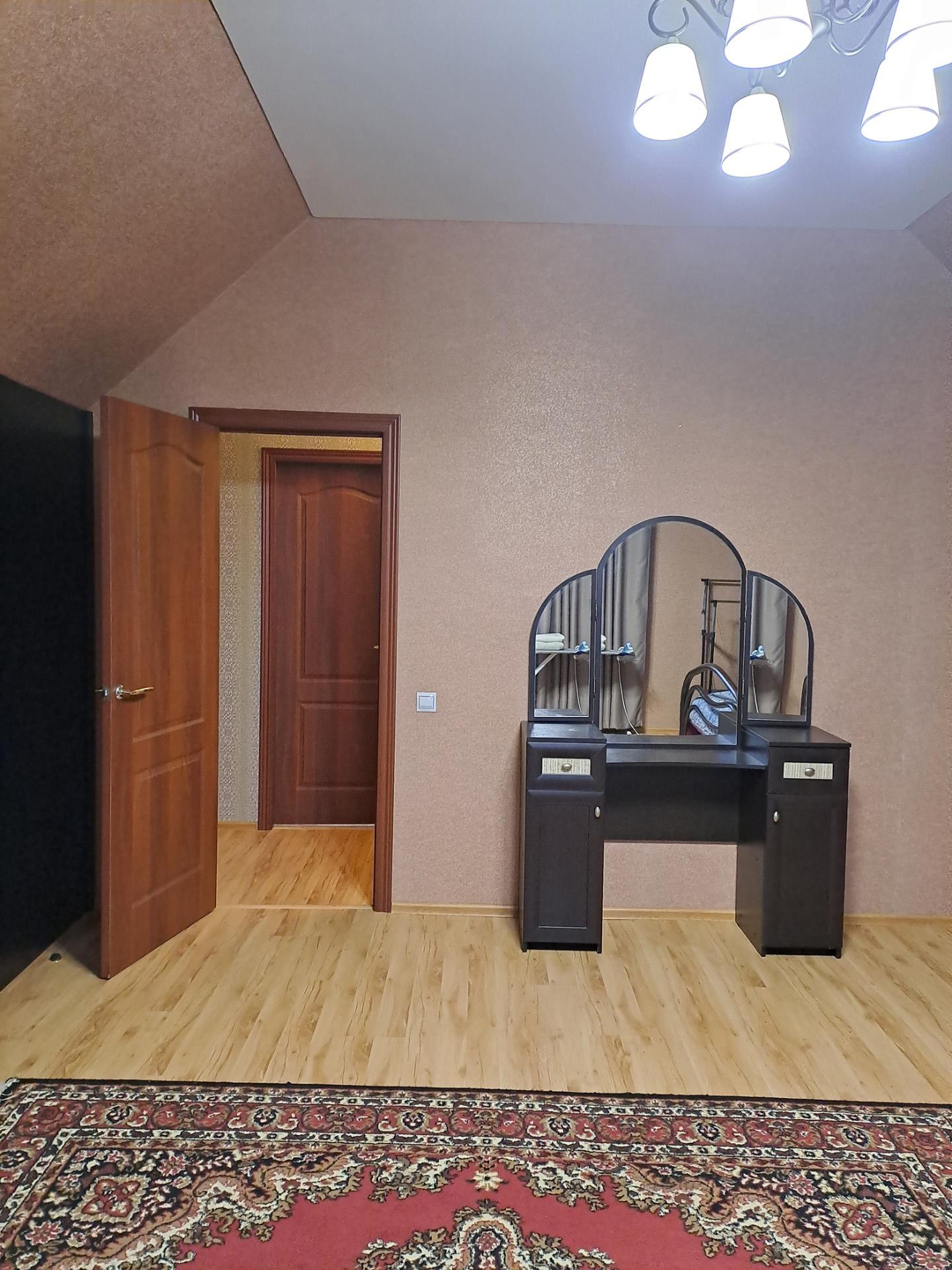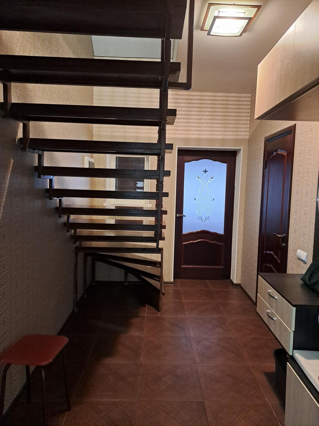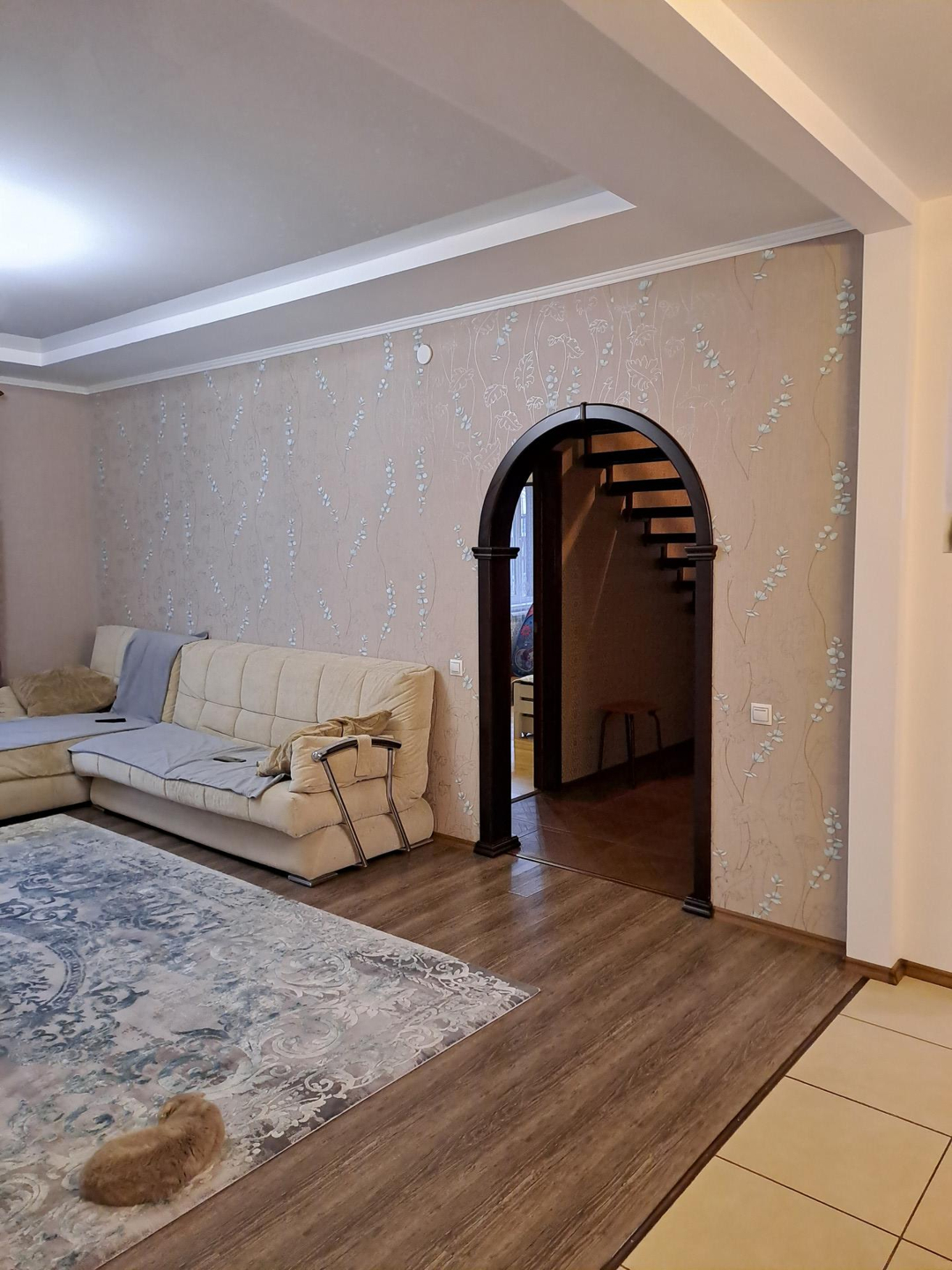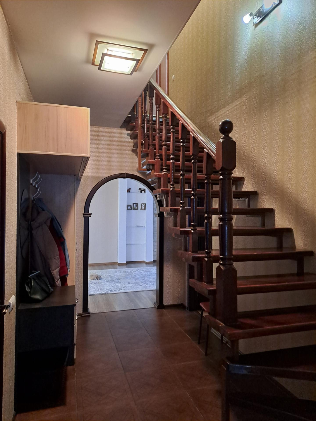 Ремонт выполнен в спокойных, светлых тонах, вся отделка из качественных, дорогих материалов. В санузле установлена качественная сантехника, положена плитка высокого класса, фото не передает всей красоты) Лестница на второй этаж выполнена из натурального дерева, очень удачно вписывается в интерьер дома. На полах ламинат 33 класса.