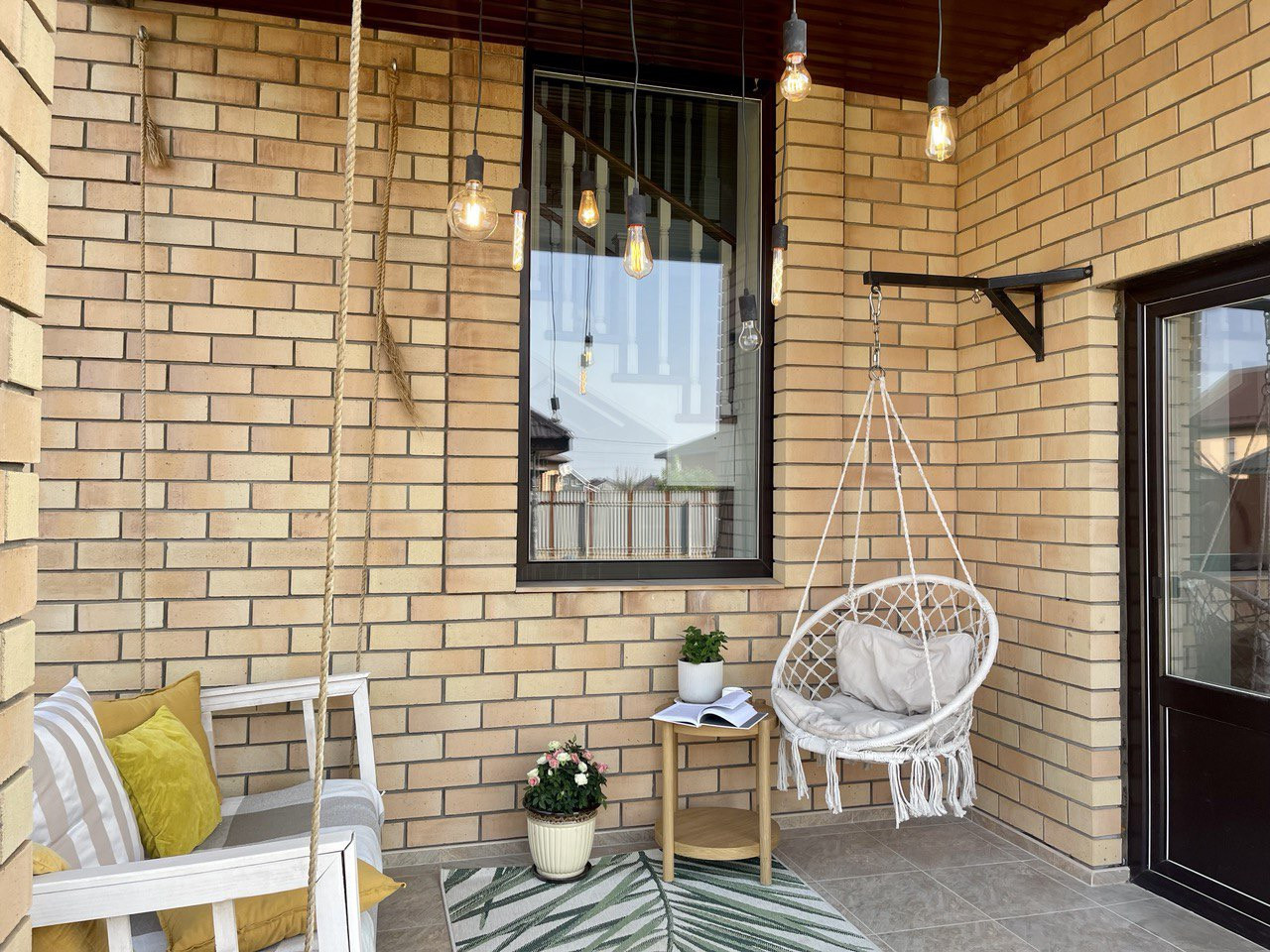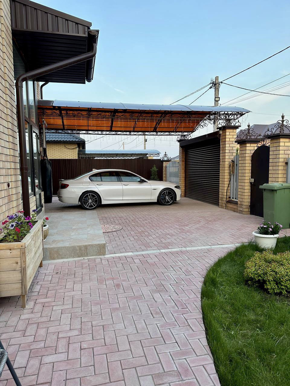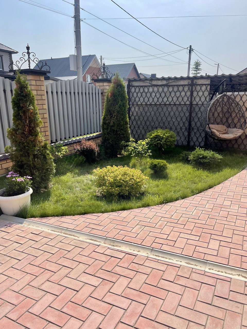 Двор вымощен брусчаткой, постелен рулонный газон, везде имеется автоматическая система полива, по таймеру осуществляется полив всех растений.