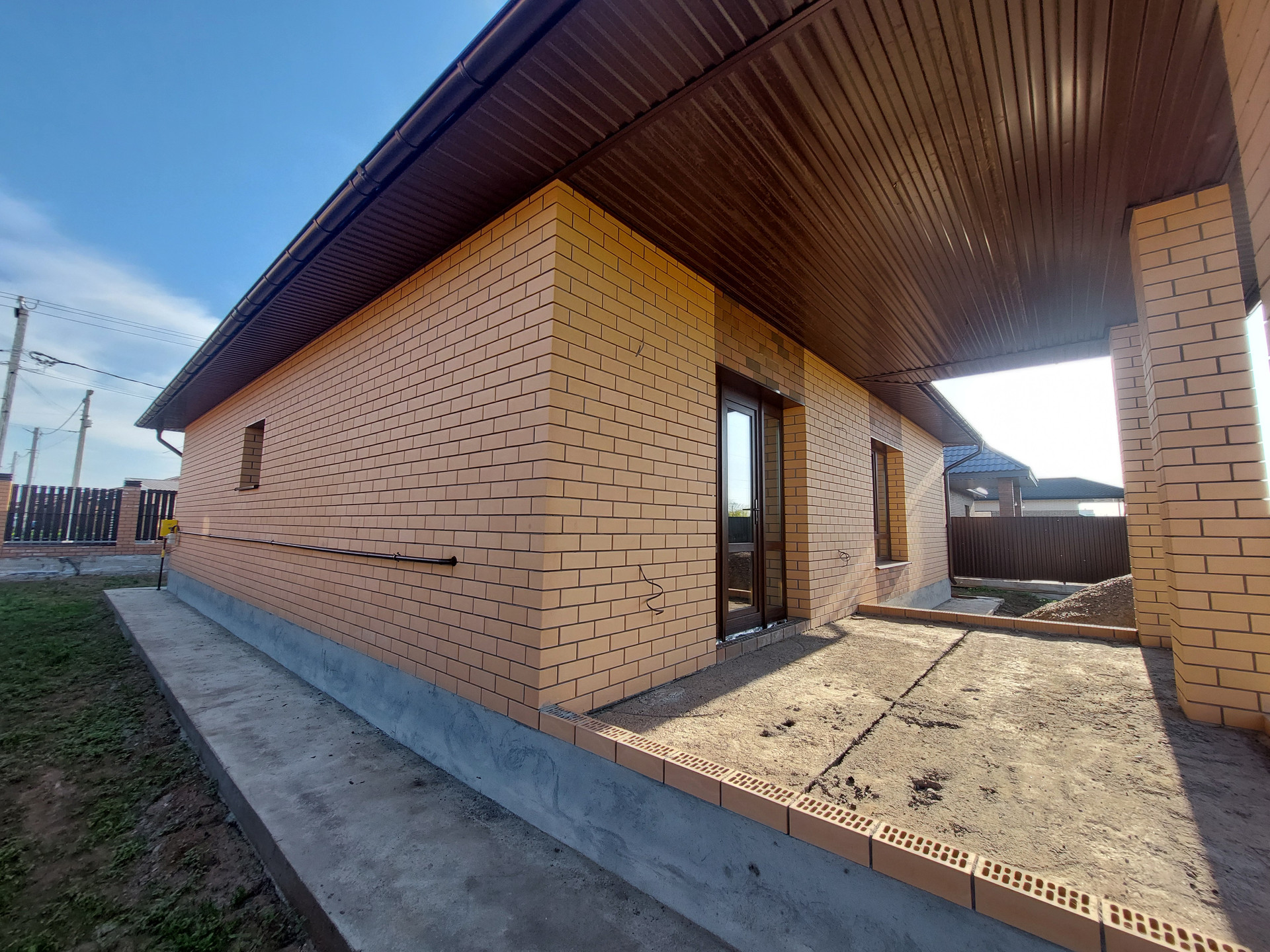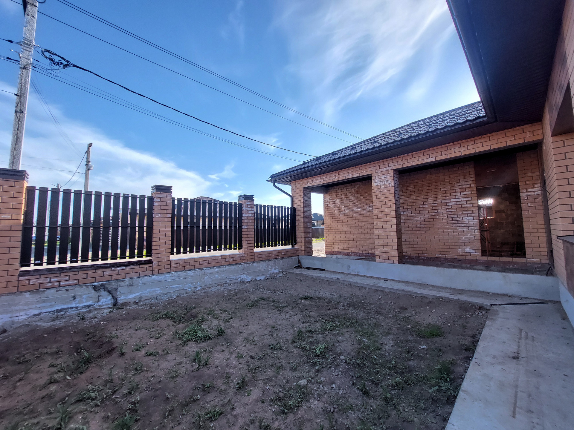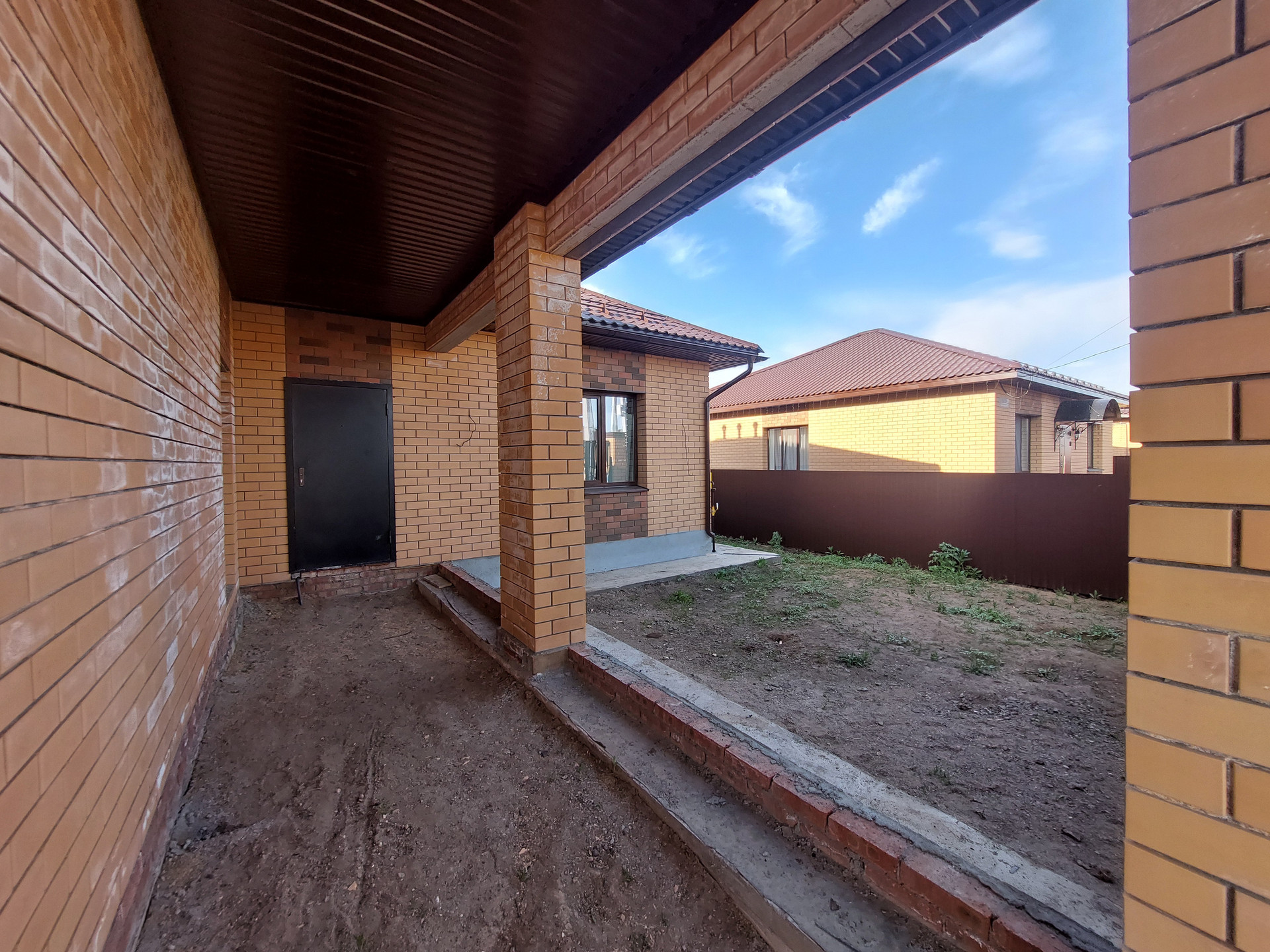 Благоустройство территории - есть. Сделана отмостка. Установлена дренажная система для отвода дождевой воды. Во двор завезен чернозем. На заднем дворе есть пути для подьезда купной и легковой техники. На заднем дворе соседей нет. За задним забором природоохранная зона, соответственно строительство больше вестись не будет.