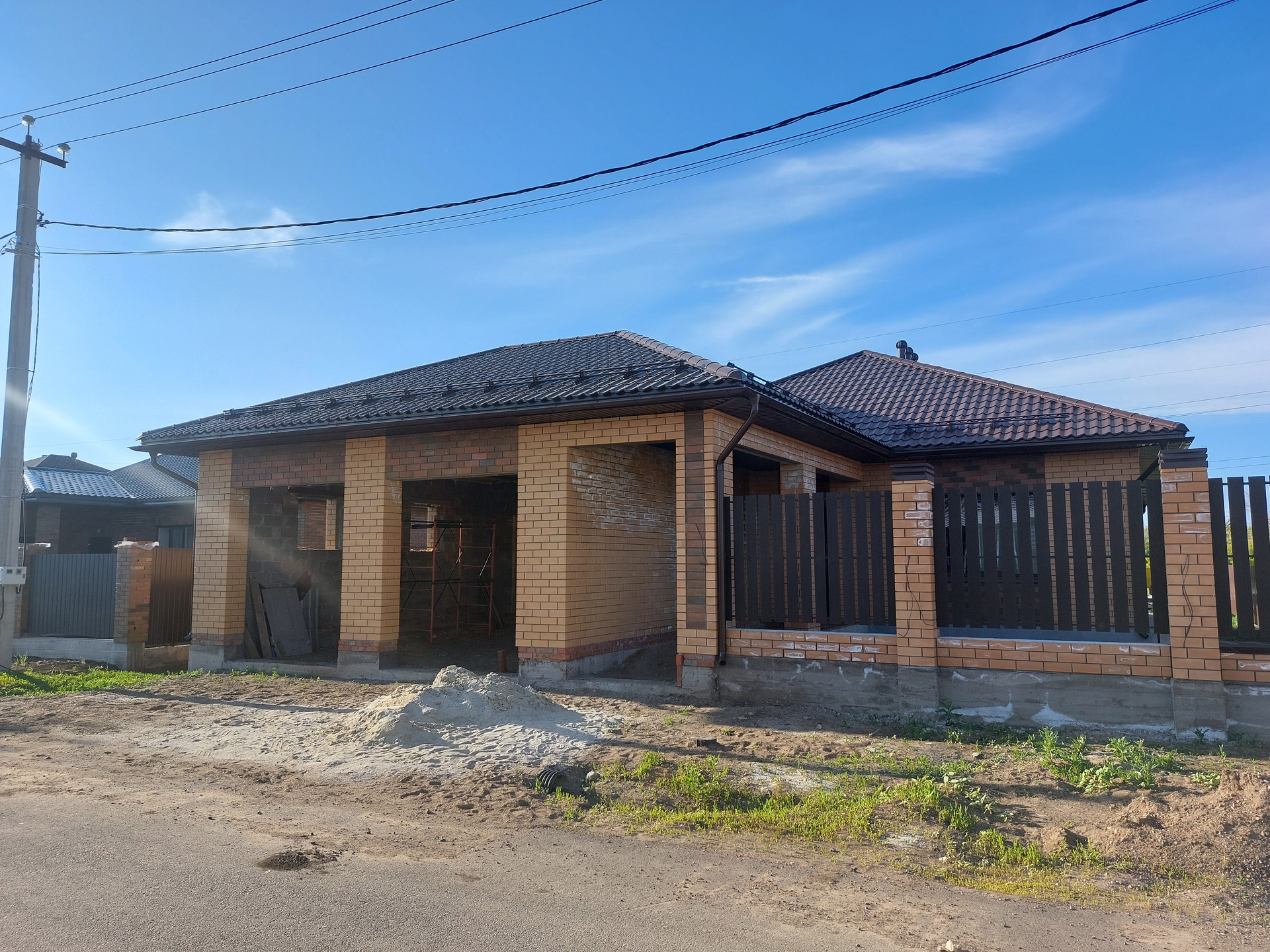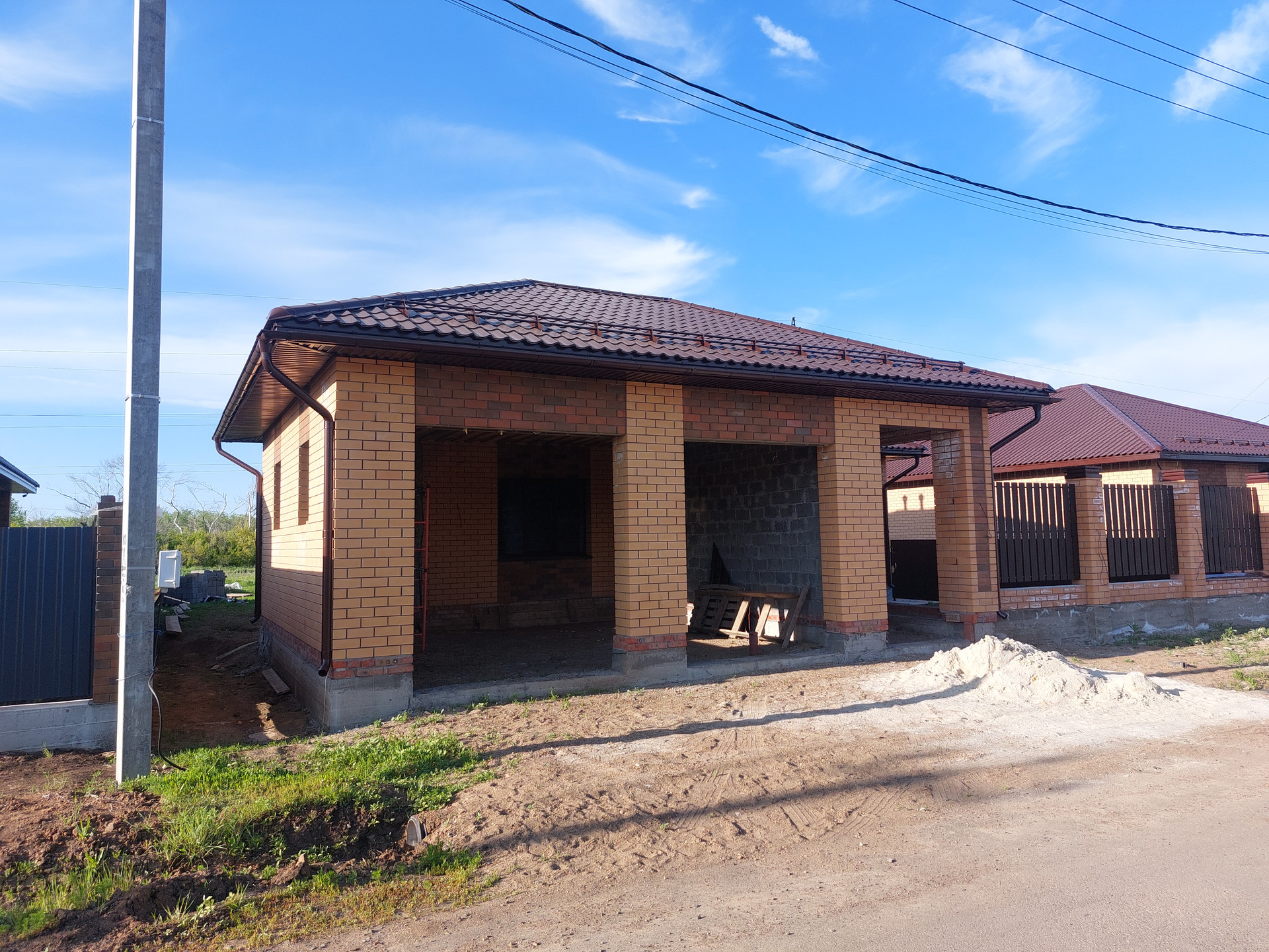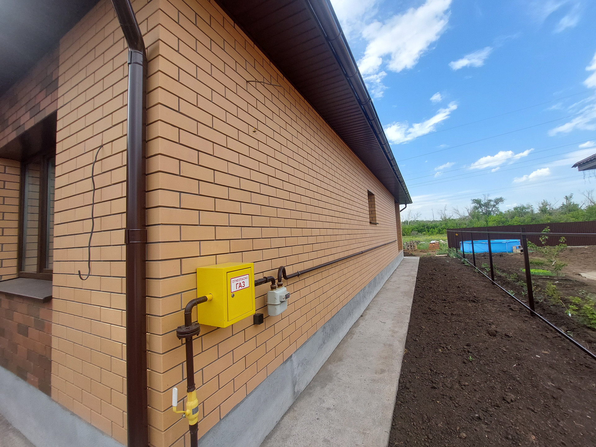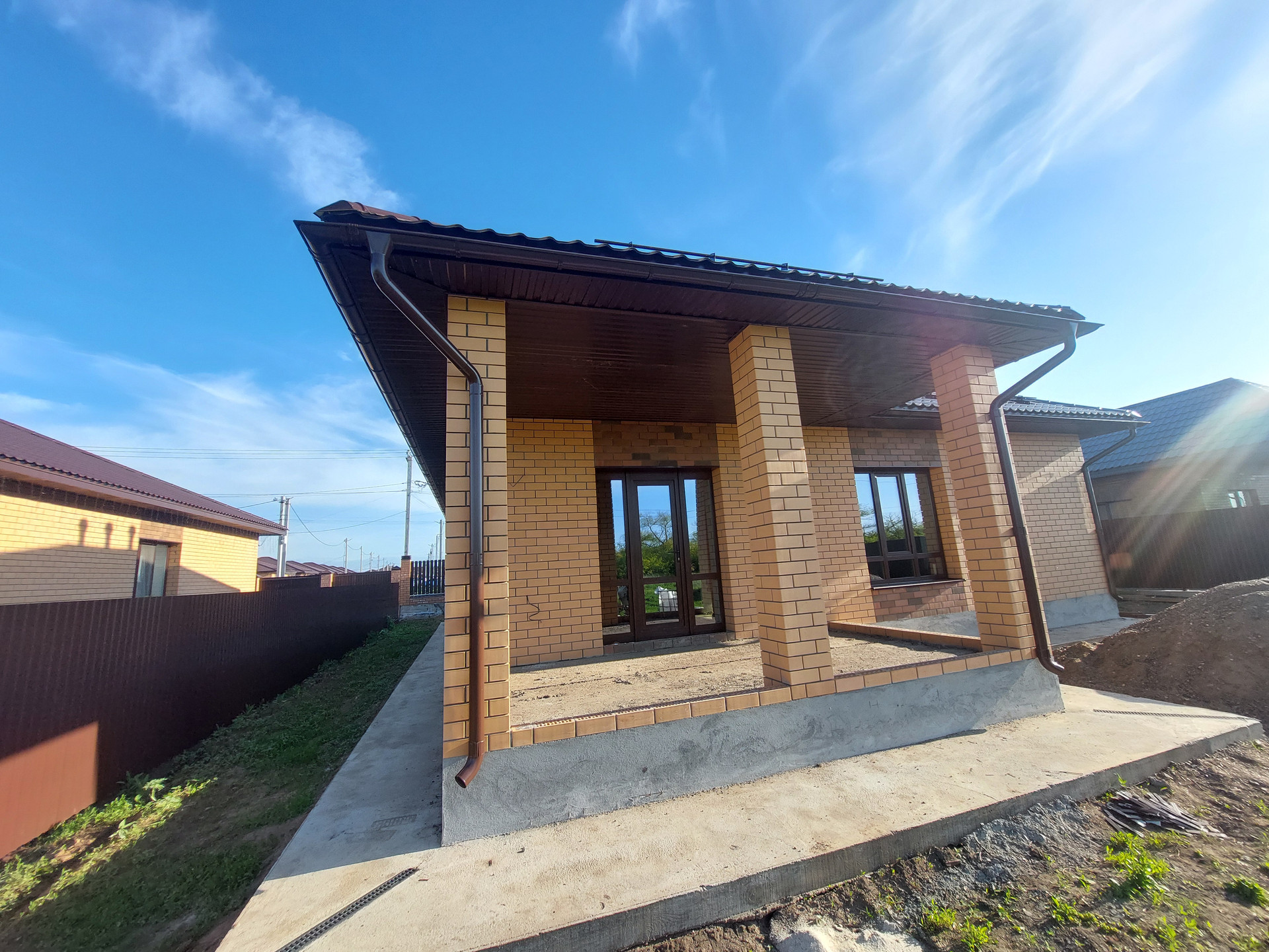 Благоустройство территории - есть. Сделана отмостка. Установлена дренажная система для отвода дождевой воды. Во двор завезен чернозем. На заднем дворе есть пути для подьезда купной и легковой техники. На заднем дворе соседей нет. За задним забором природоохранная зона, соответственно строительство больше вестись не будет.