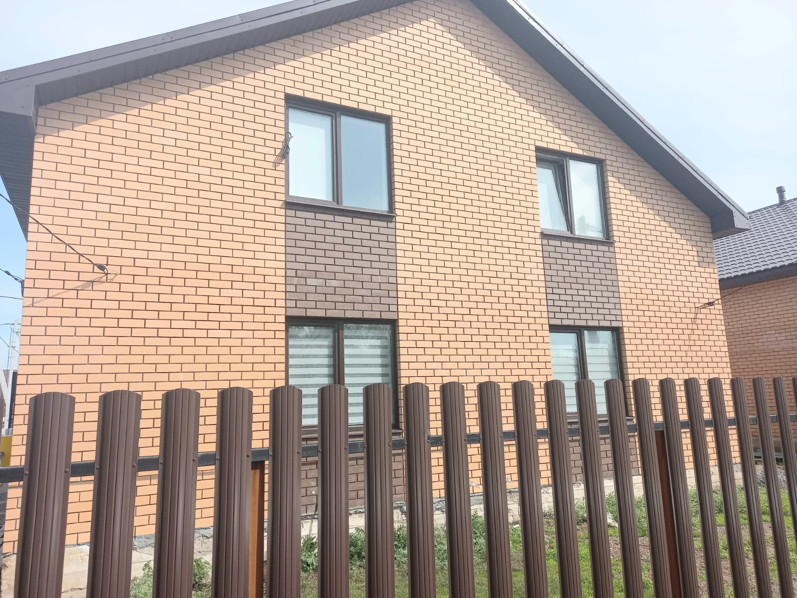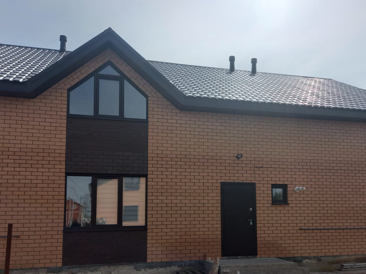 Дом построен из заводского газобетонного блока и облицован керамическим кирпичом.