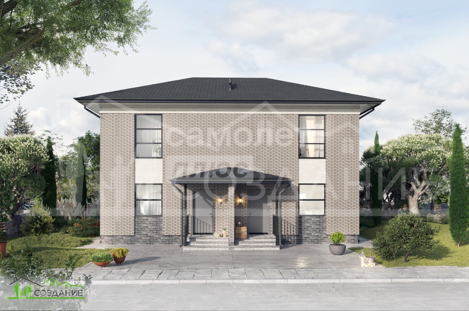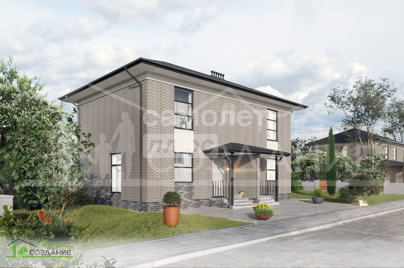 Таунхаус построен из заводского газобетонного блока КОТТЕДЖ, фасад облицован керамическим кирпичом. Установлены качественные ПВХ окна с двойным мультифункциональным стеклопакетом и надежная металлическая дверь с терморазрывом. В качестве кровельного покрытия выбрана двухслойная гибкая черепица Shinglas от компании ТЕХНОНИКОЛЬ, карниз подшит металлическими софитами, смонтирована водосточная система производства ТЕХНОНИКОЛЬ.