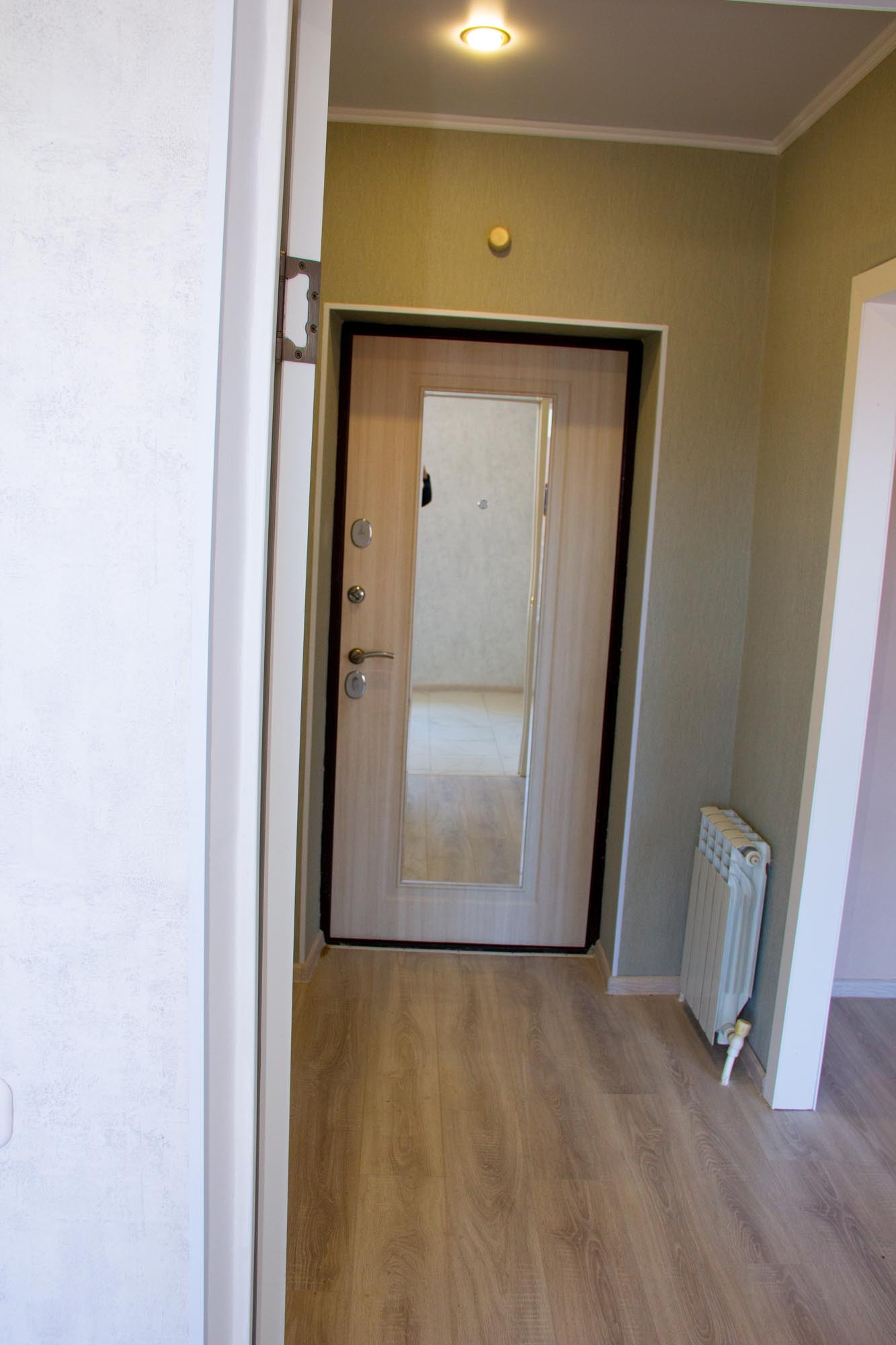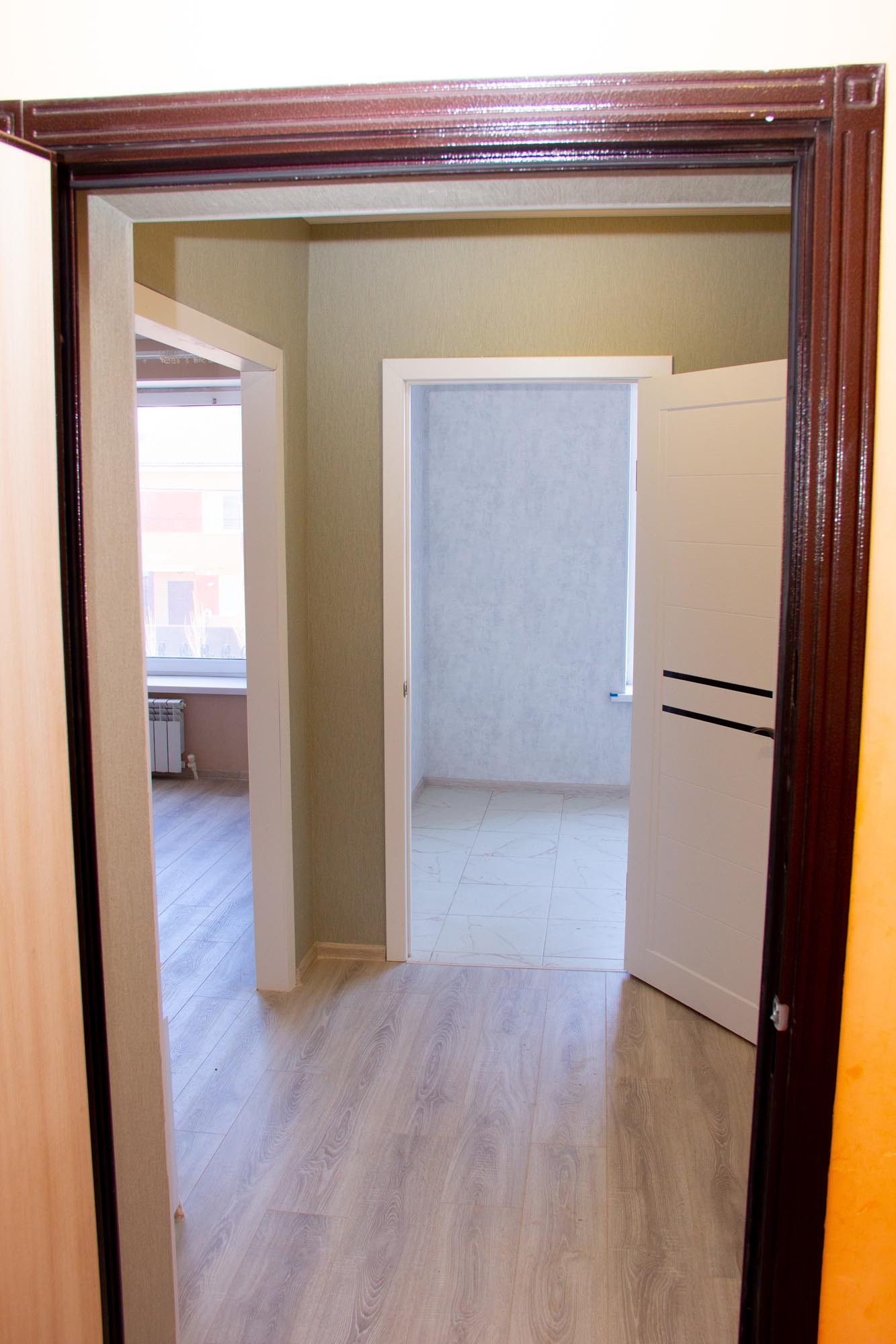 На полу в прихожей и кухне плитка, в комнате ламинат, ванная комната в кафеле.