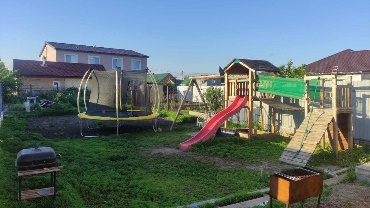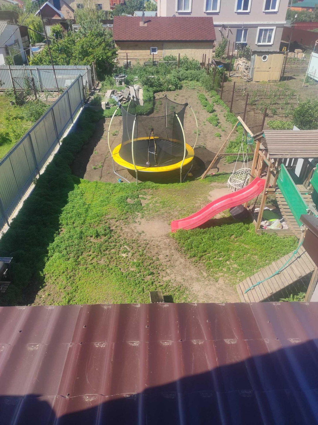 Участок 5.5 соток, правильной формы, по периметру забор. Передний двор заасфальтирован до дороги. На заднем дворе залит фундамент под баню.