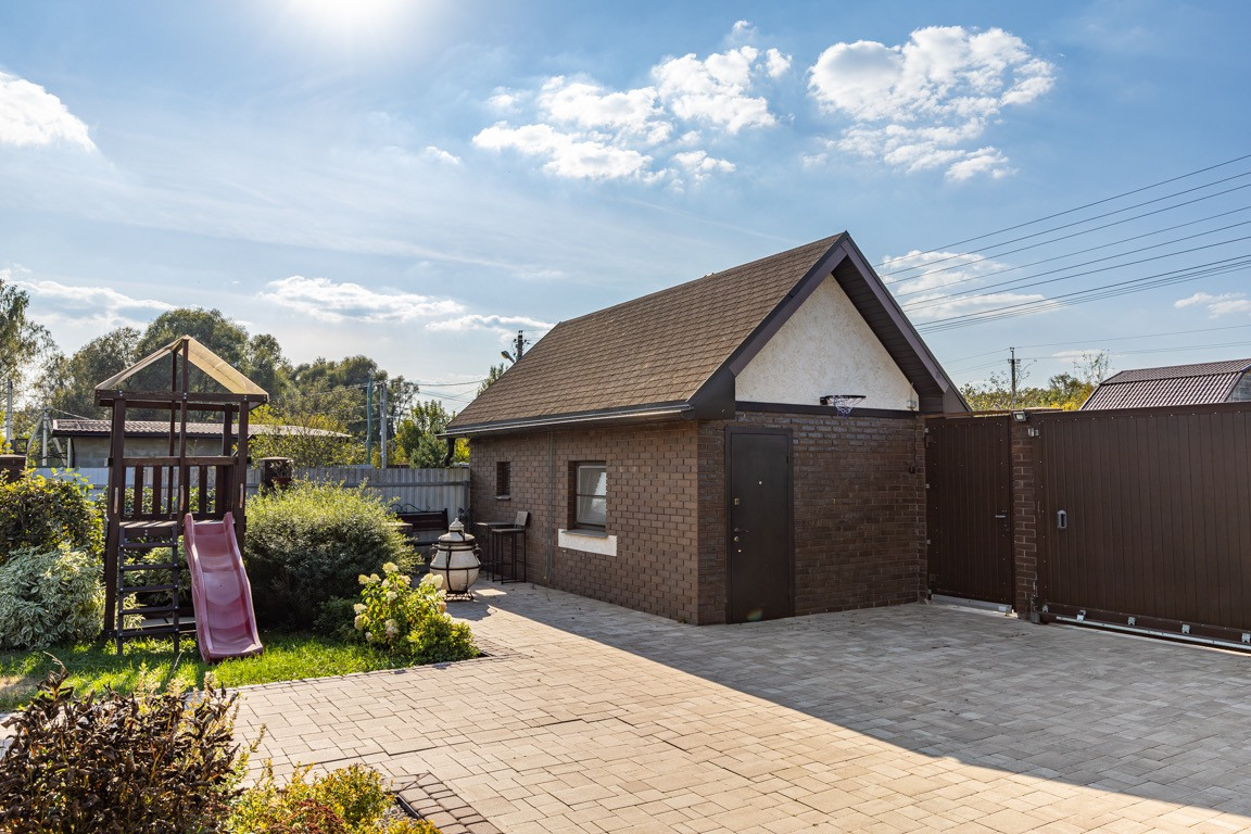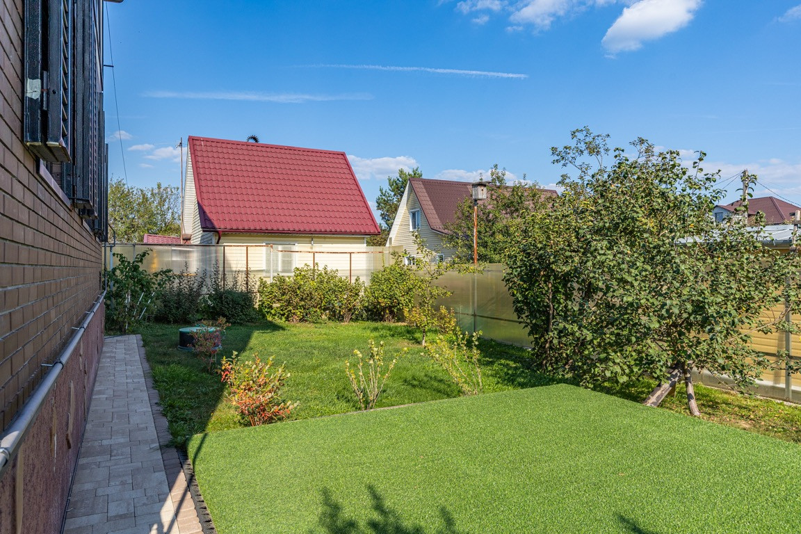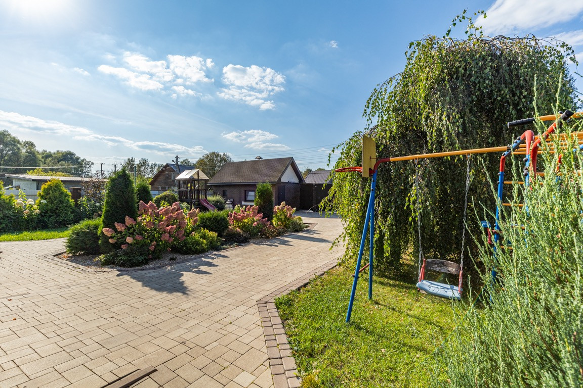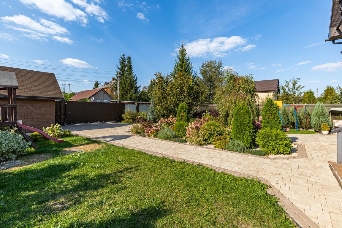 Участок правильной формы, ландшафтный дизайн, много зелени( цветы, деревья, красивые кусты, хвойные деревья и много другого) . На участке расположена баня на дровах, детская площадка, зона отдыха, зона для барбекю, парковка.