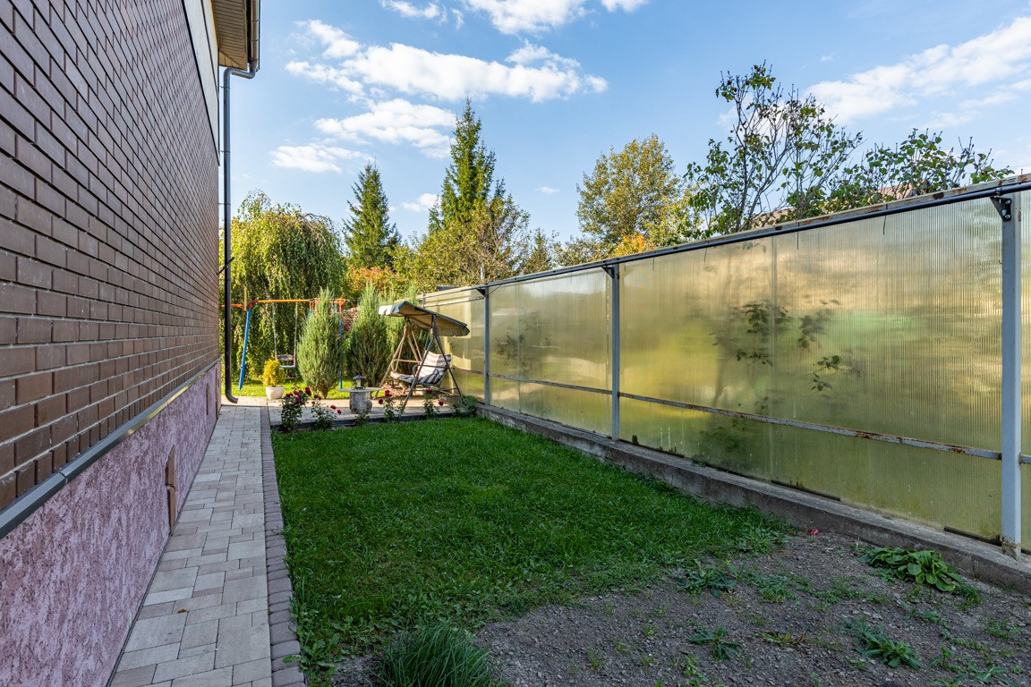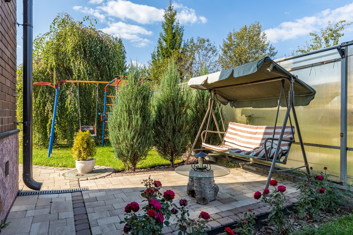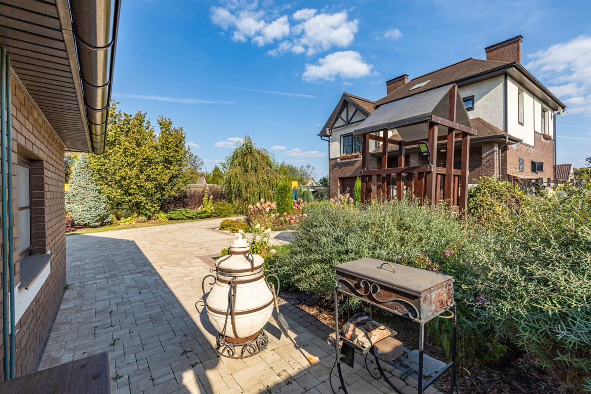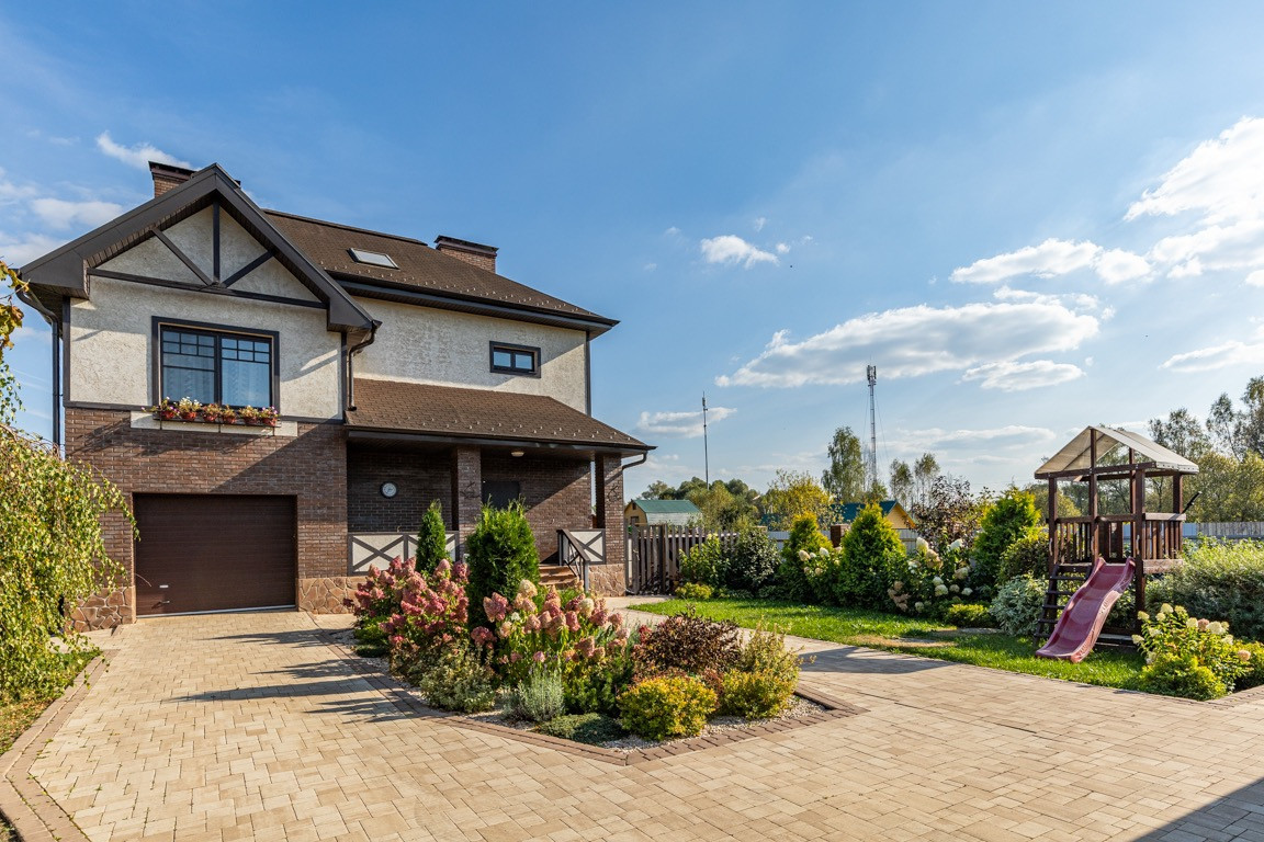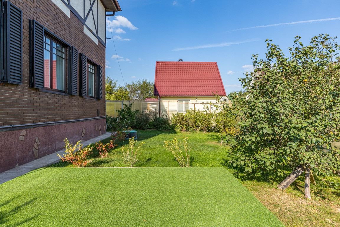 Участок правильной формы, ландшафтный дизайн, много зелени( цветы, деревья, красивые кусты, хвойные деревья и много другого) . На участке расположена баня на дровах, детская площадка, зона отдыха, зона для барбекю, парковка.