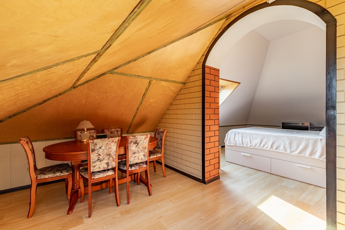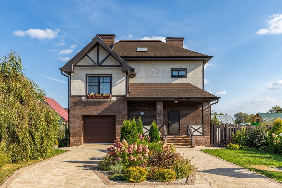 Трехэтажный кирпичный качественно построенный дом с цоколем и мансардным жилым этажом и теплым гаражом с выходом в дом.