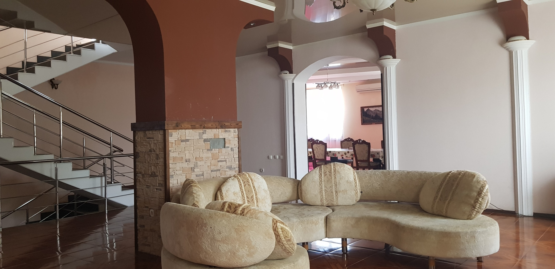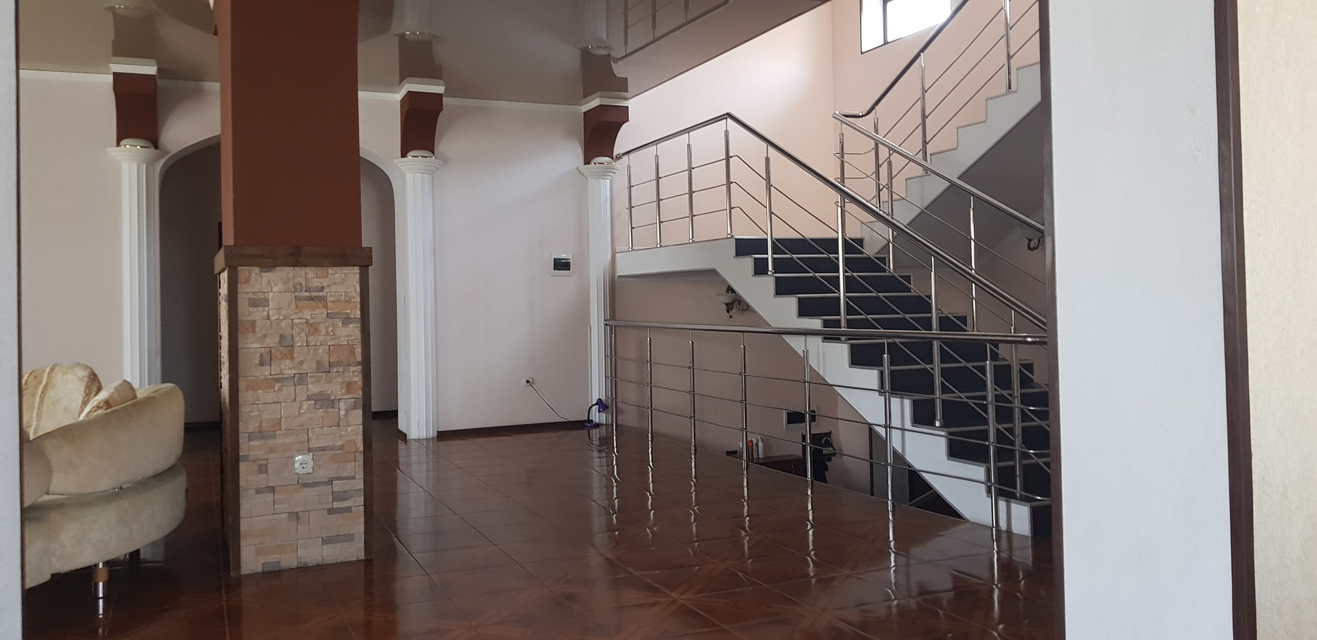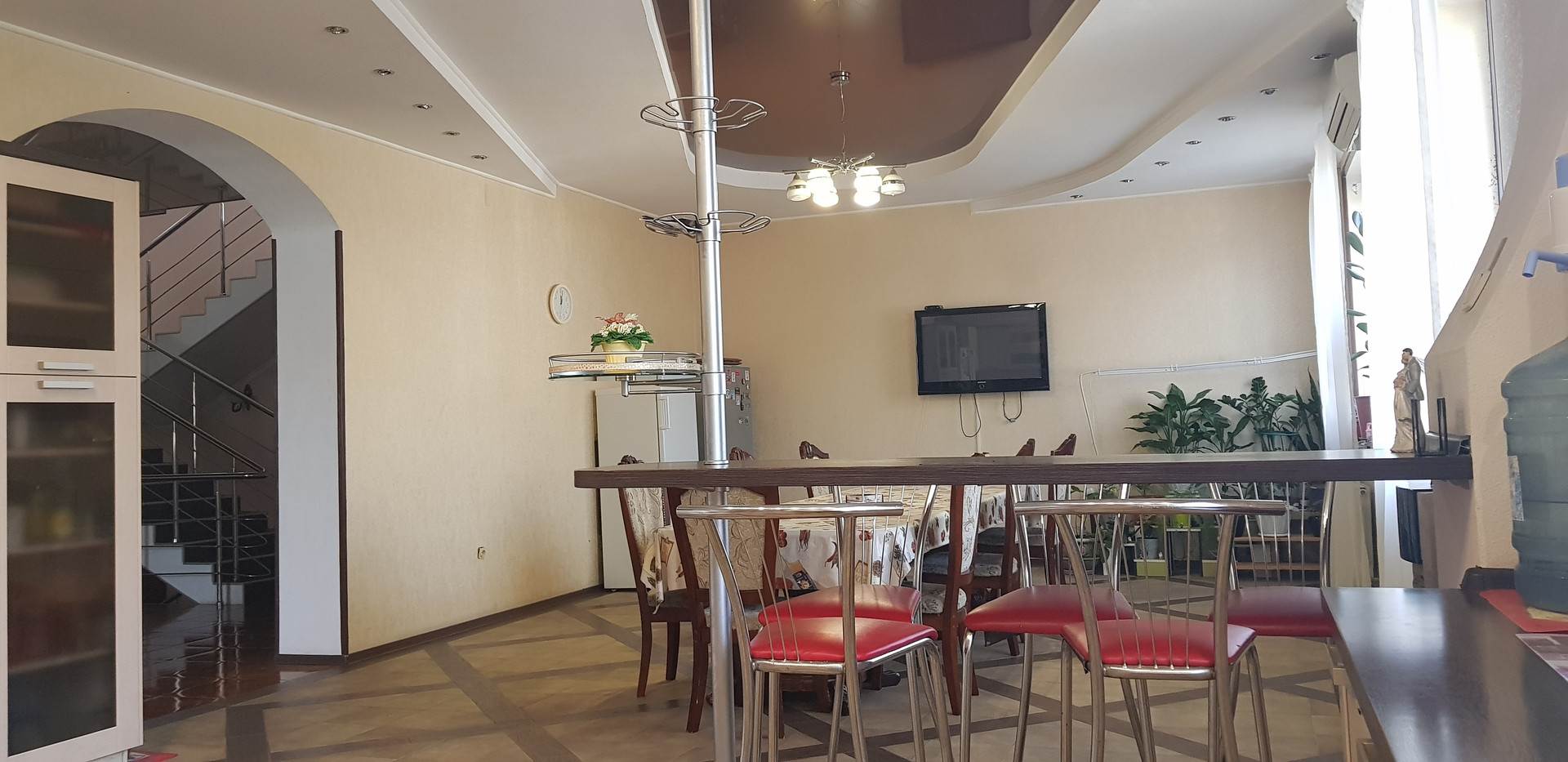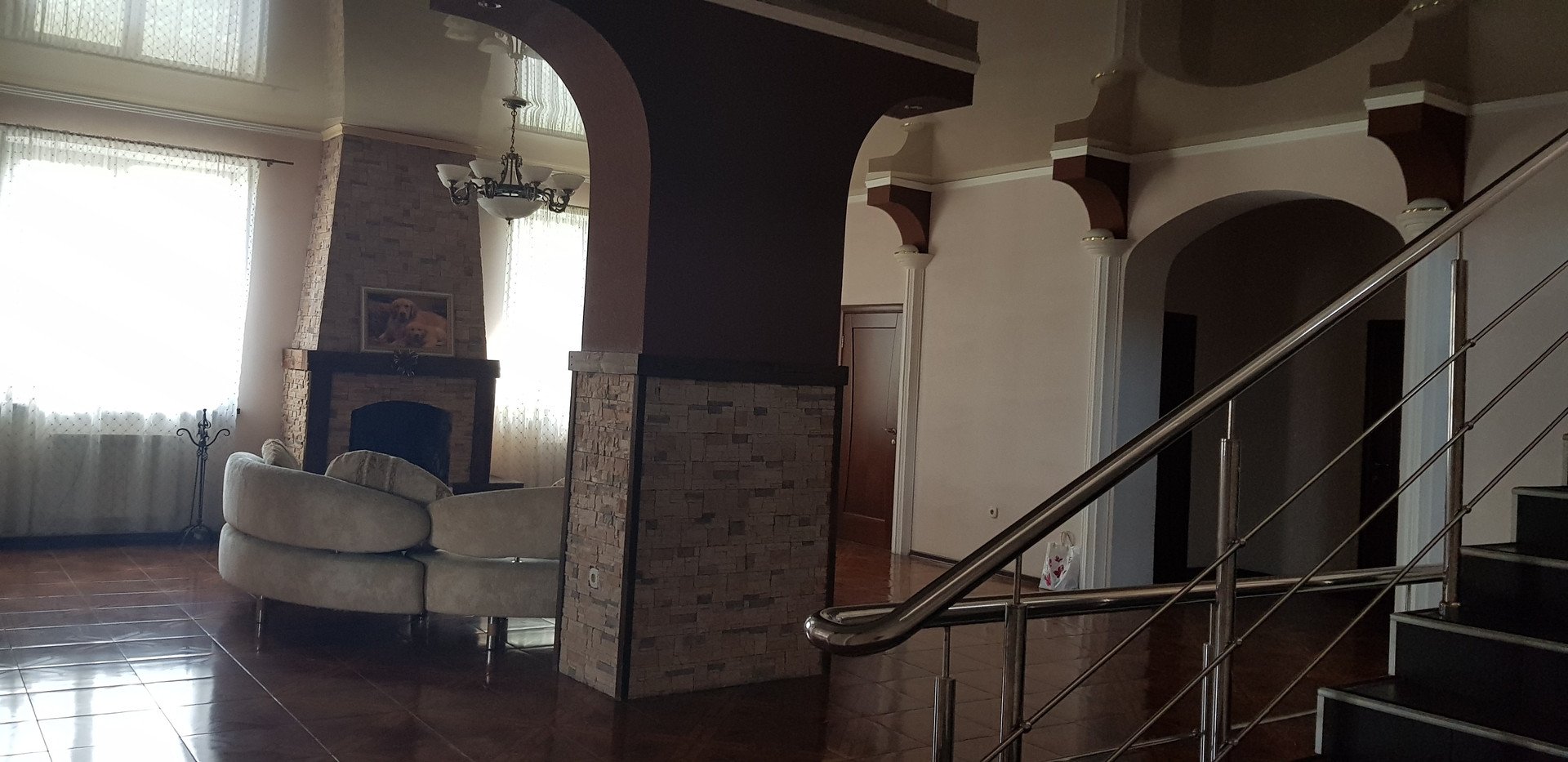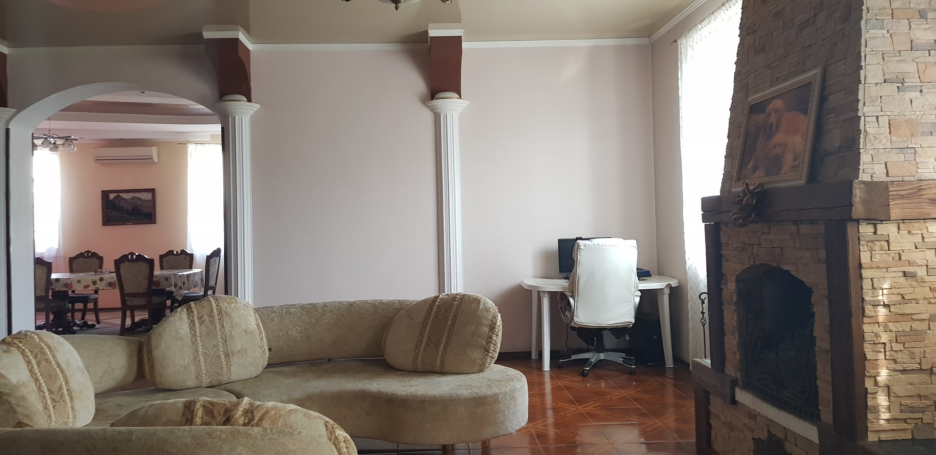 Дом - 4 этажа, первый с большим холлом и камином, большая столовая и 3 спальни.