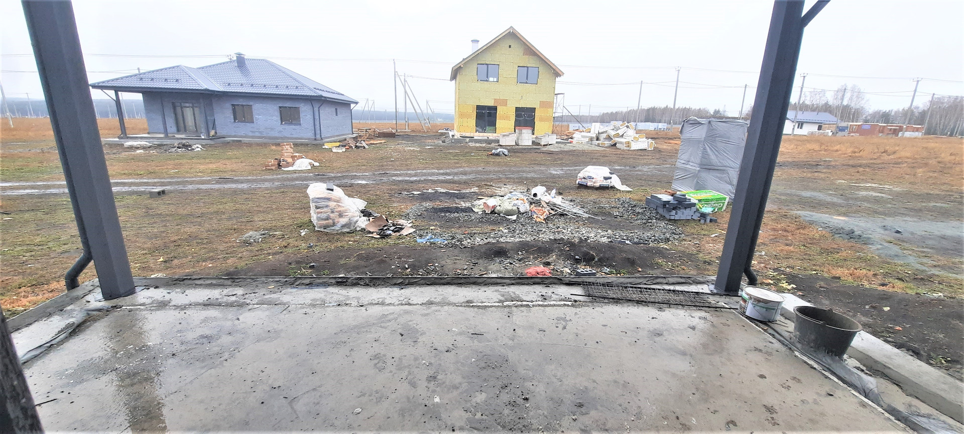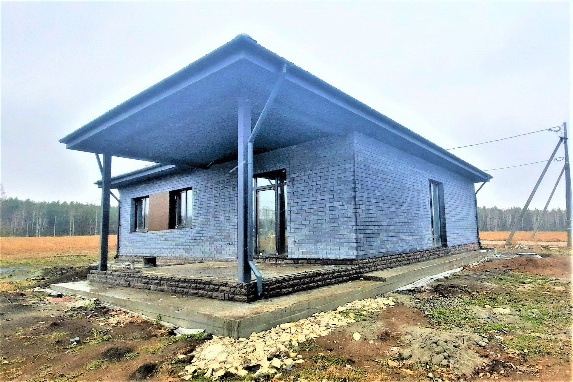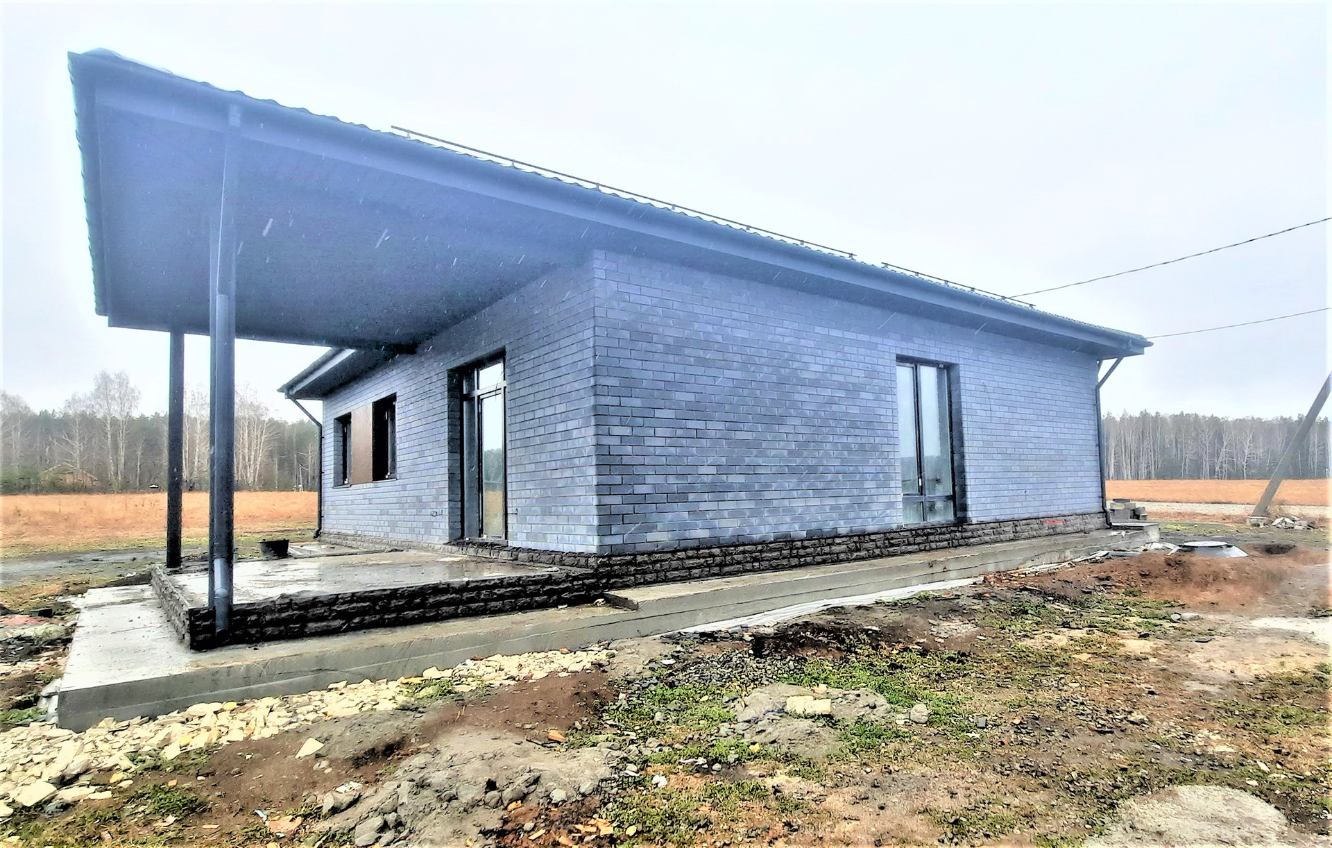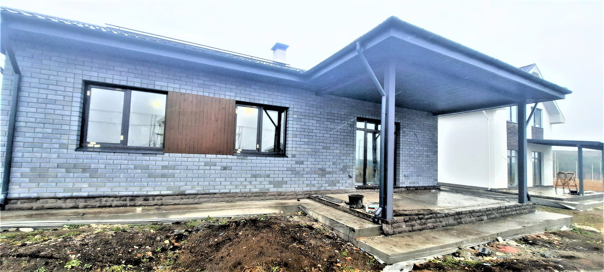 •    Монолитная плита со свайным ростверком. Сделана отмостка.