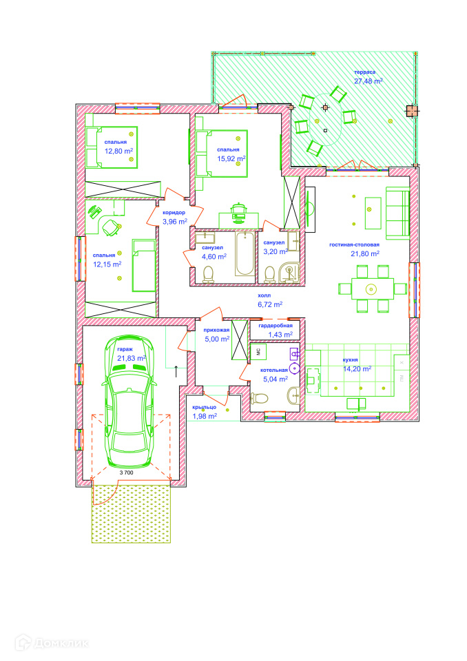 - 3 комнaты: 15.92 кв.м. (мастер-спальня), 12.15 кв.м. и 12.8 кв.м. (отделены от общего пространства);