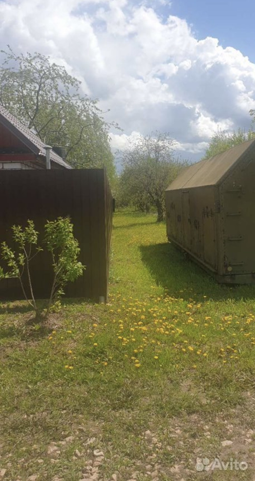 военный кунг 3*8 м,  в котором находится кухонька и спальные места. Есть плодоносящие деревья: яблони.