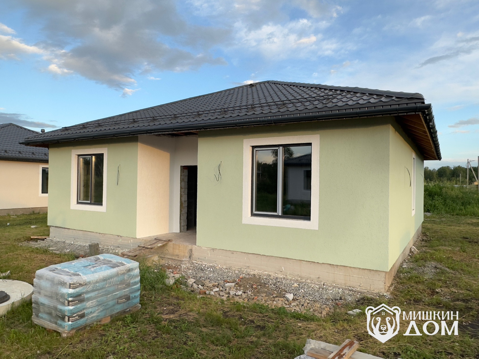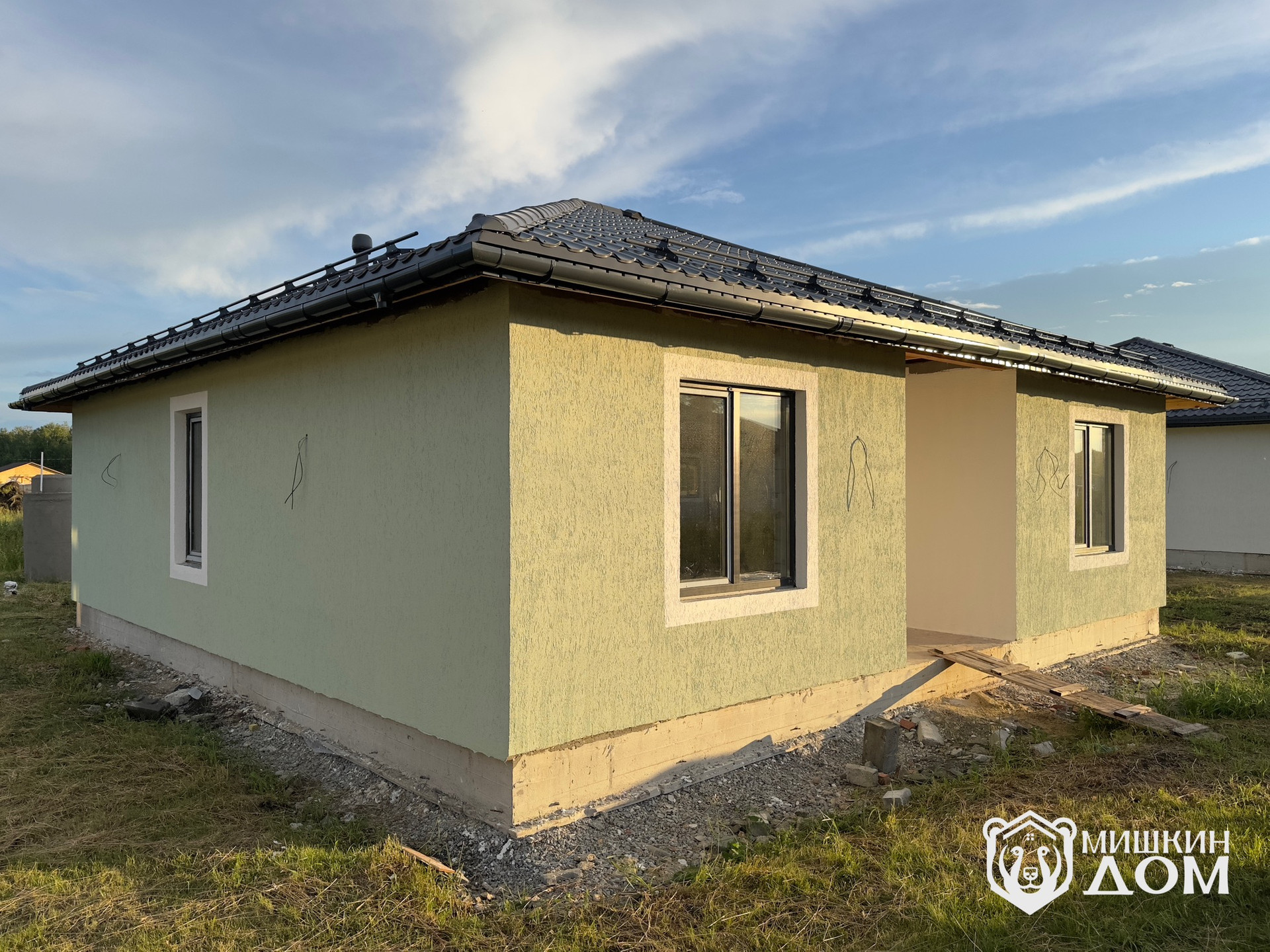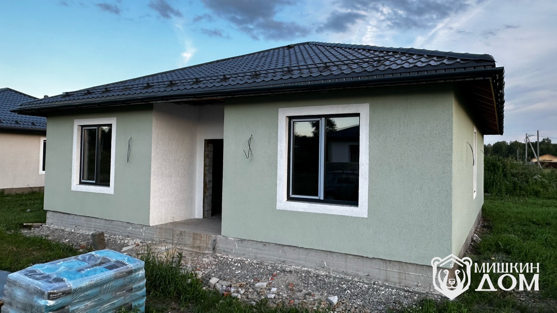 • По периметру дома будет выполнена отмостка и входная группа тротуарной плиткой «Старый город» от Челябинского завода «Урал Камень», Запланирован монтаж забора по периметру и дорогой лицевой зоной в стиле «жалюзи» горизонтальные ламели в тёмно-графитовом цвете согласно проекта. Будет выполнена планировка участка.
