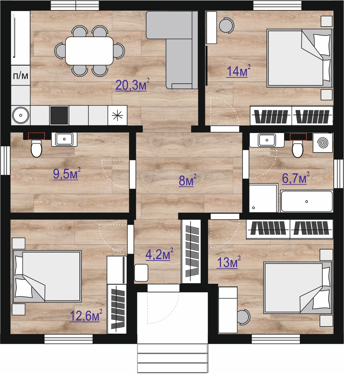 • 3 спальни (мастер спальня большей площади + две просторные спальни);