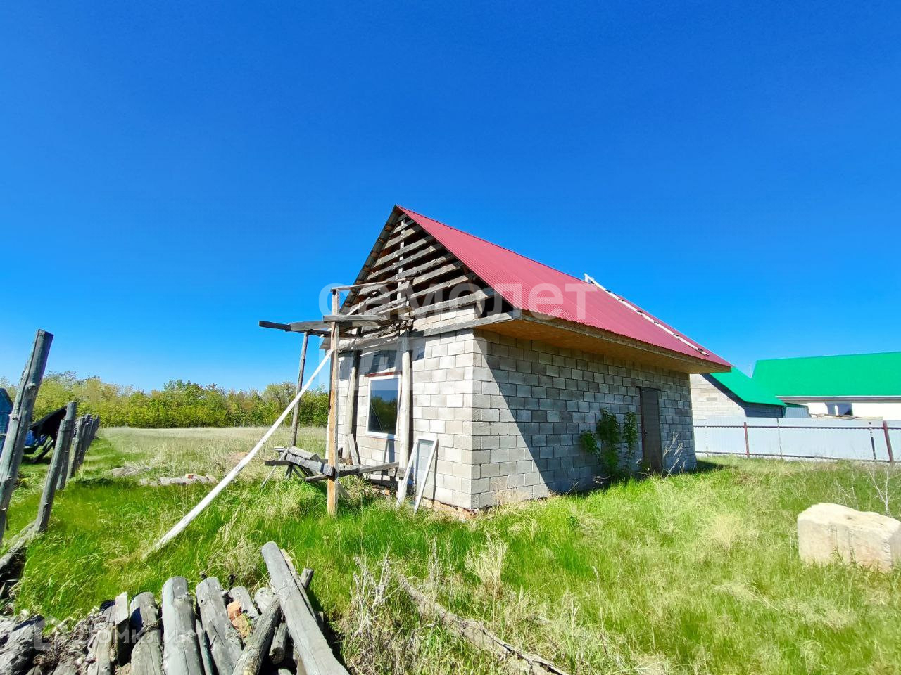 На участке имеется баня из керамзитоблока площадью 40 кв.м., шамбо под баню 3,5 м., колодец глубиной 39 метров,  фундамент под дом 9х8 м. выложен из блоков в 2 ряда. Есть стройматериалы : кирпич б/у 3 000  штук и щебень 3 куба.