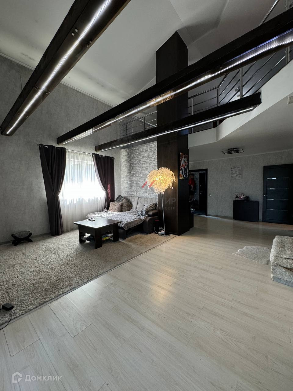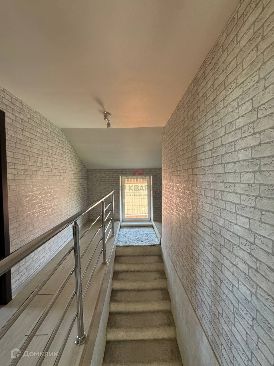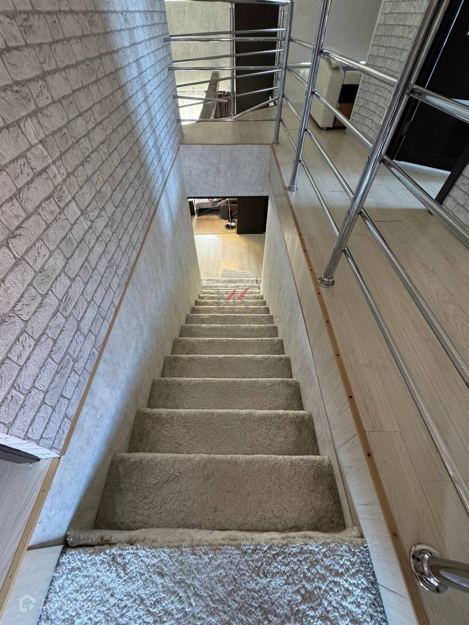 светлый коридор с лестницей и перилами переходящий в зону релакса-кинотеатра (!!!) ,