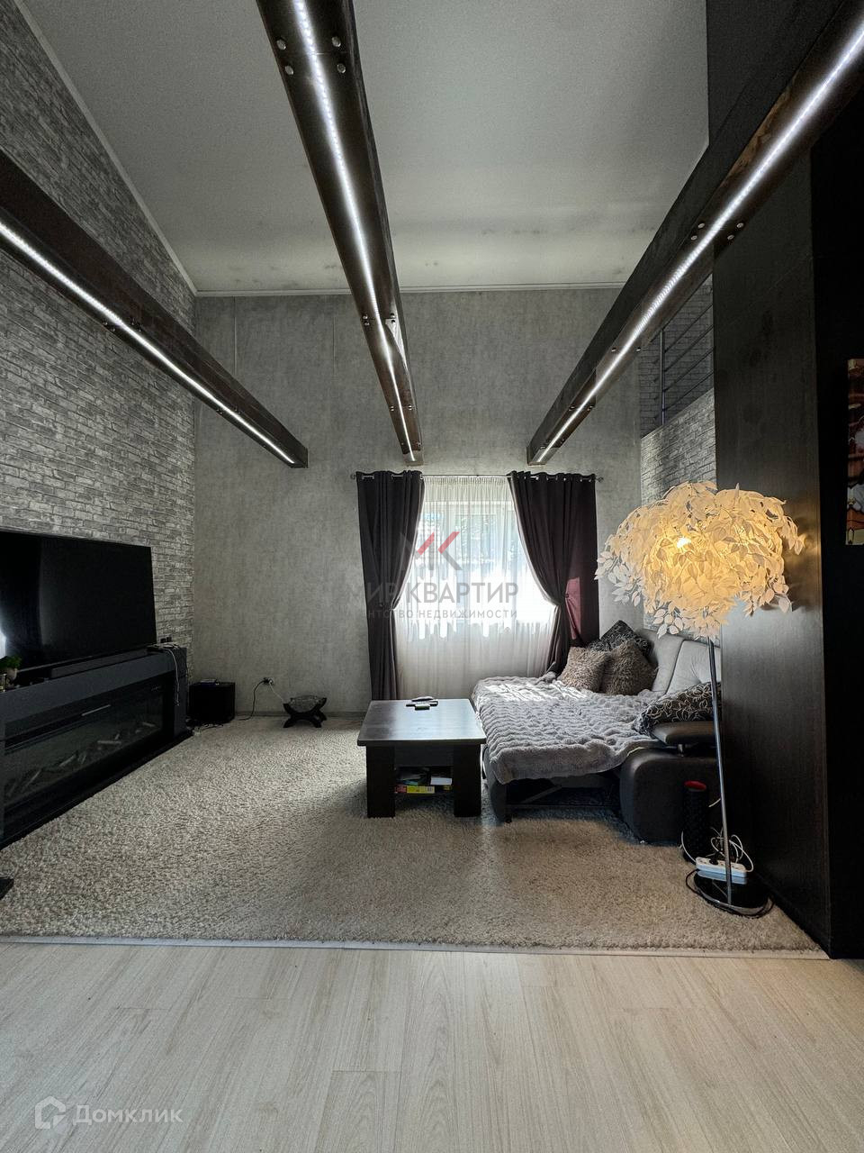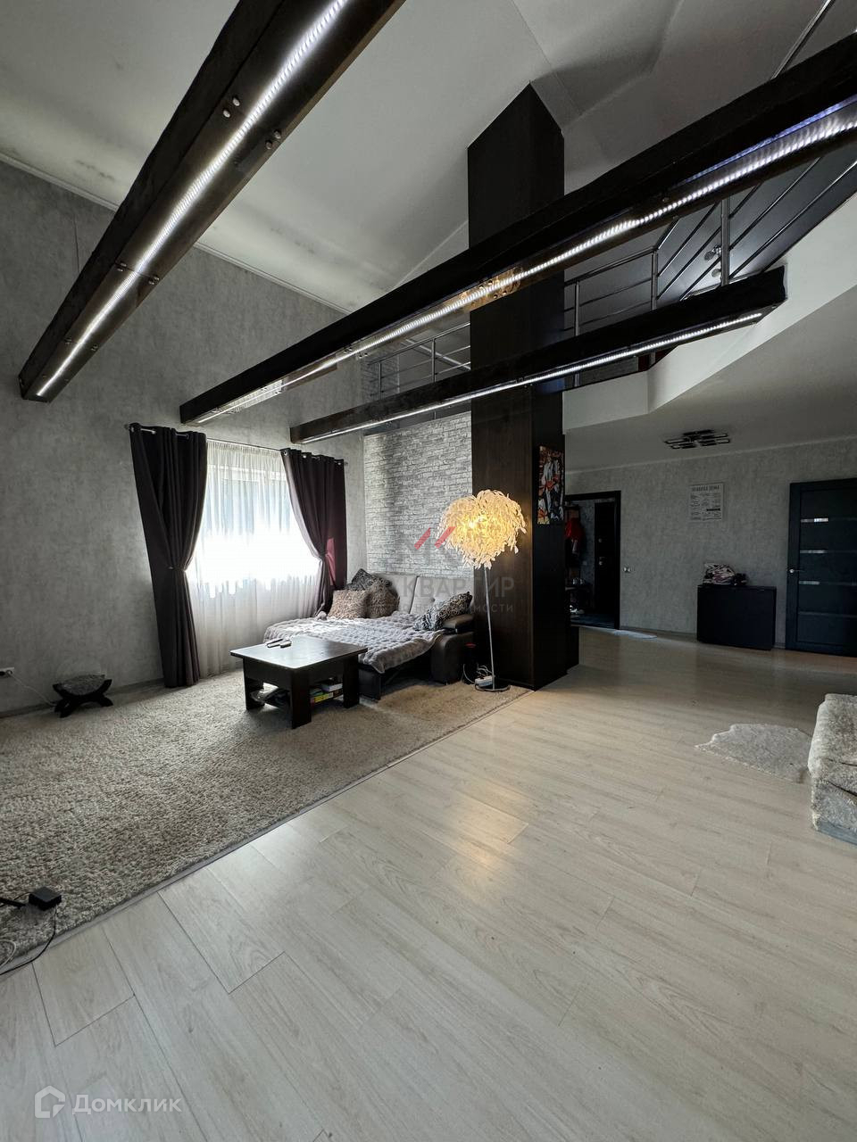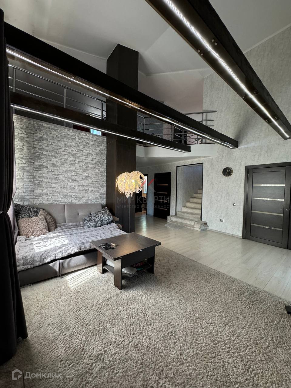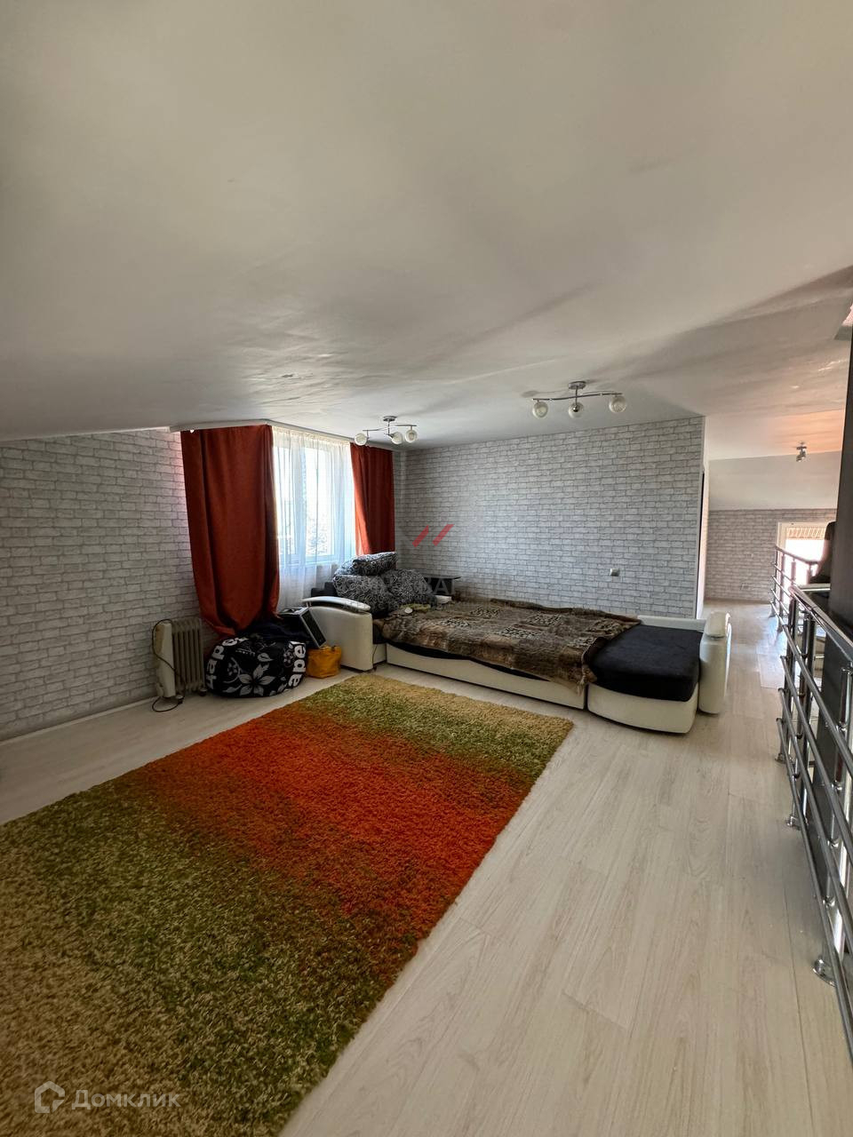светлый коридор с лестницей и перилами переходящий в зону релакса-кинотеатра (!!!) ,