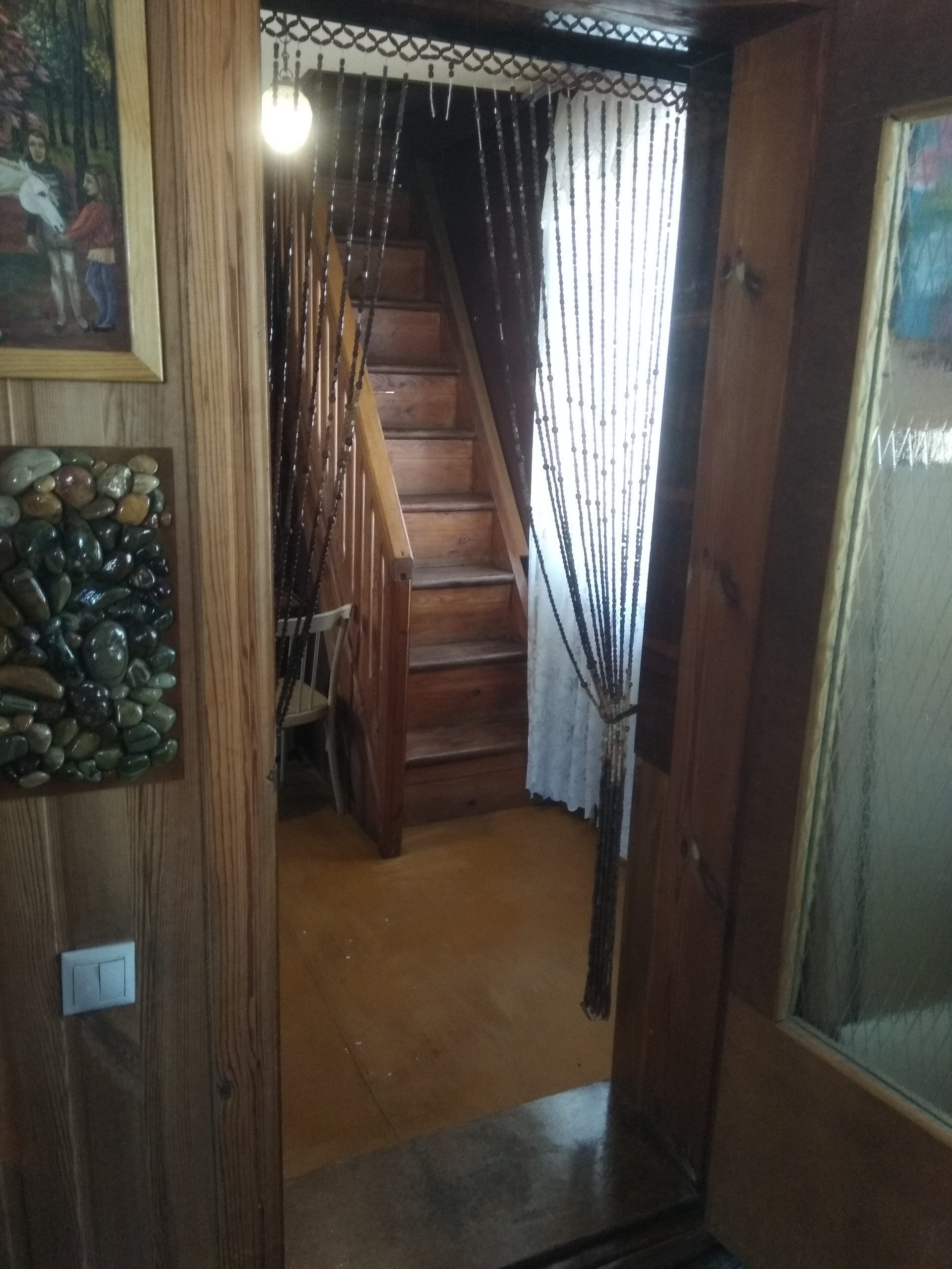 Деревянная лестница в доме ведет на мансардный этаж, на котором настелен пол из досок.