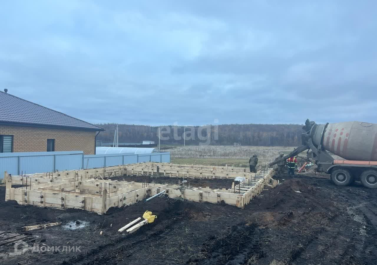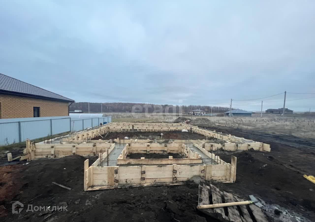 Участок уже подготовлен к строительству: заложен фундамент размерами 10 на 12 метров плюс тамбур 3 на 2 метра. Готовый проект дома уже есть.
