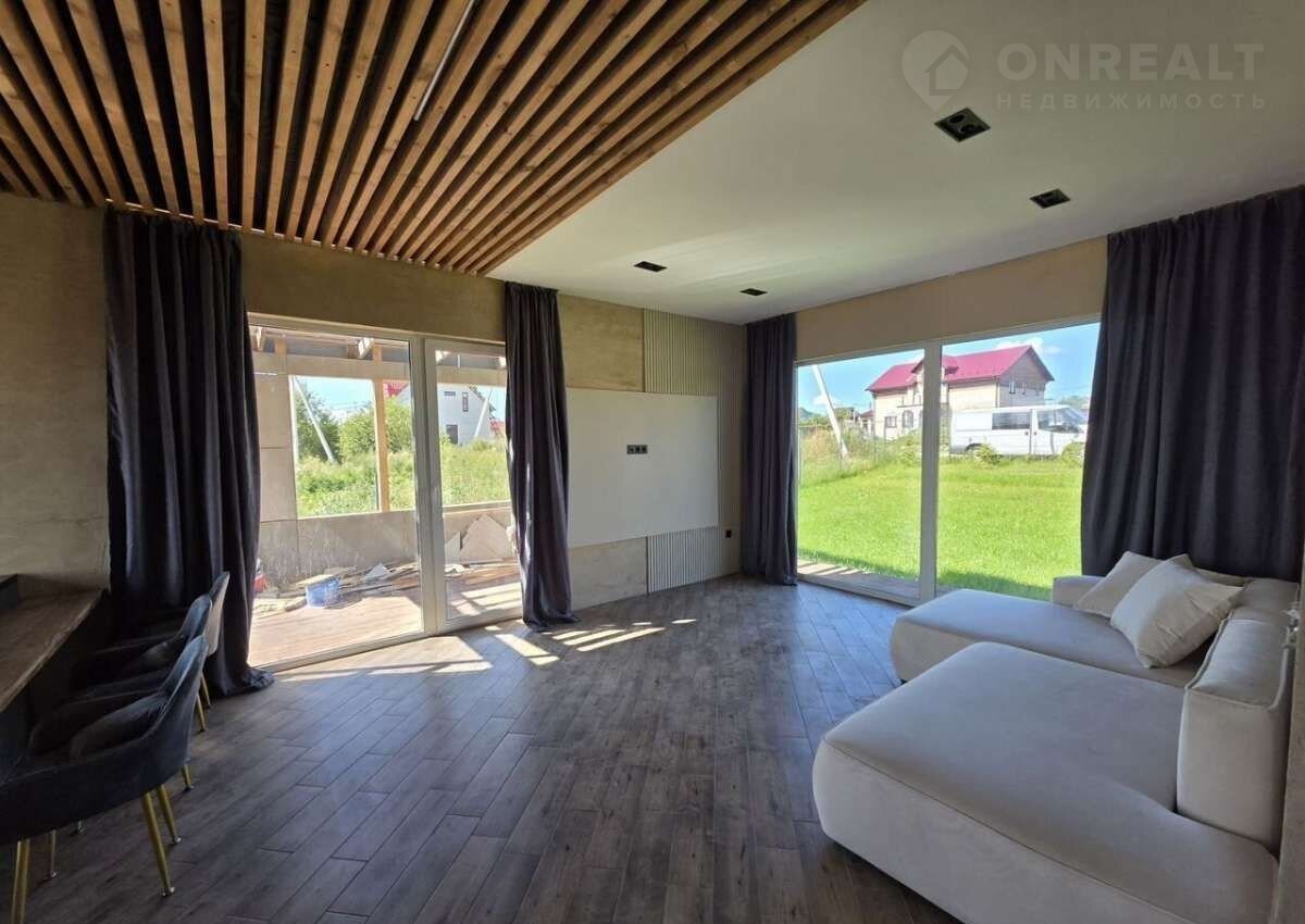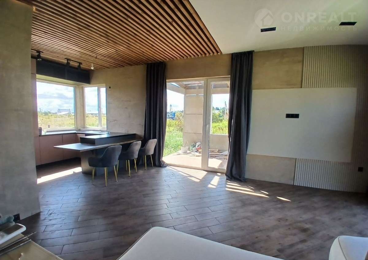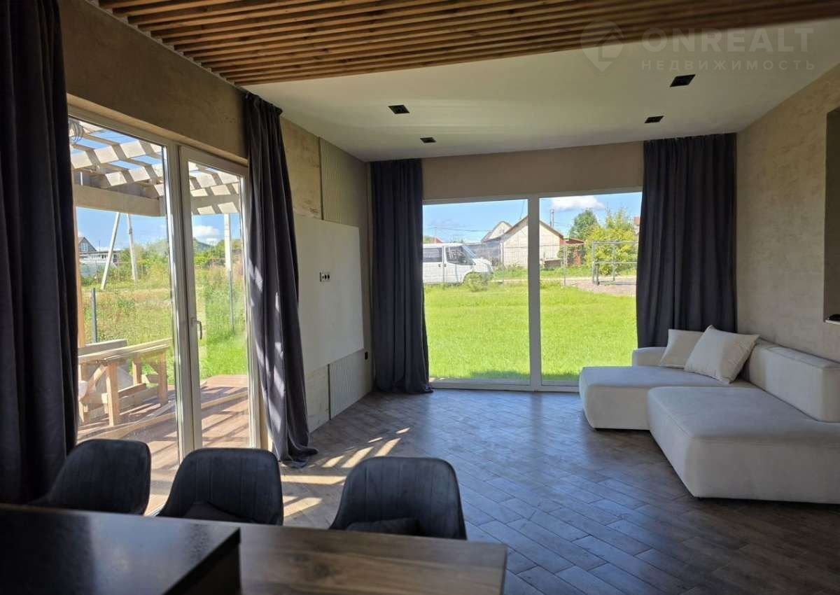В доме уютная кухня гостиная. 3 спальных комнаты, сан узел и котельная. В доме большие окна благодаря этому дом всегда наполнен светом. Высокие потолки в гостиной и светлая отделка. Визуально увеличивают пространство и наполняют его светом.