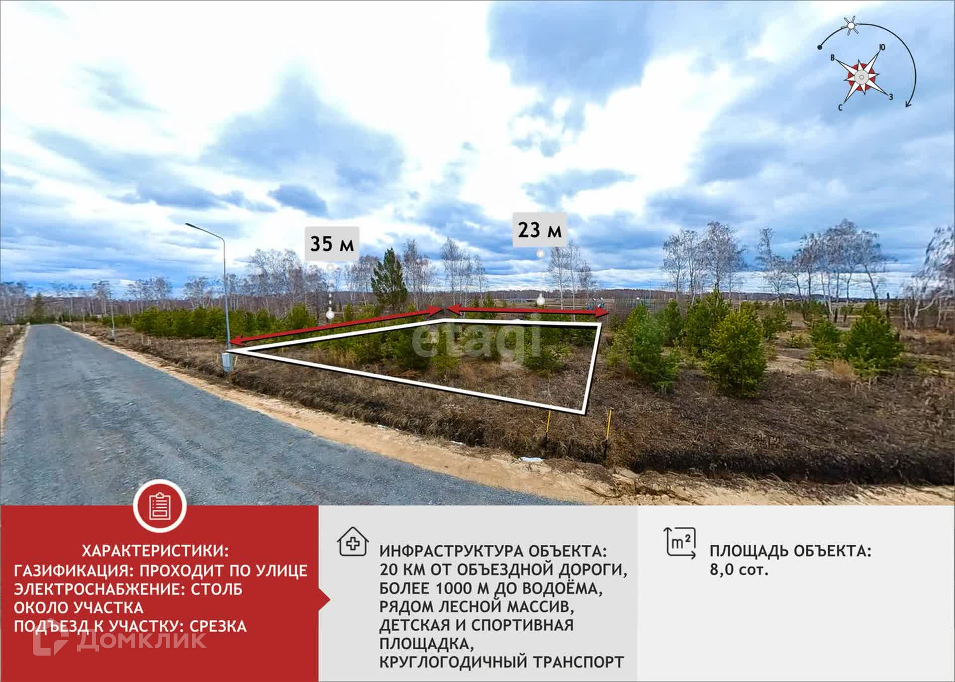 На участке много красивых сосенок, площадь участка - 8 соток, правильной формы, газ, электричество подведено, дороги асфальтная срезка.
