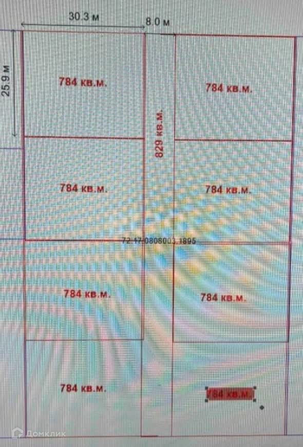 Легко делится на 8 участков по 7,84 соток (30,3 м. x 25,9 м.) + дорога шириной 8 м.
