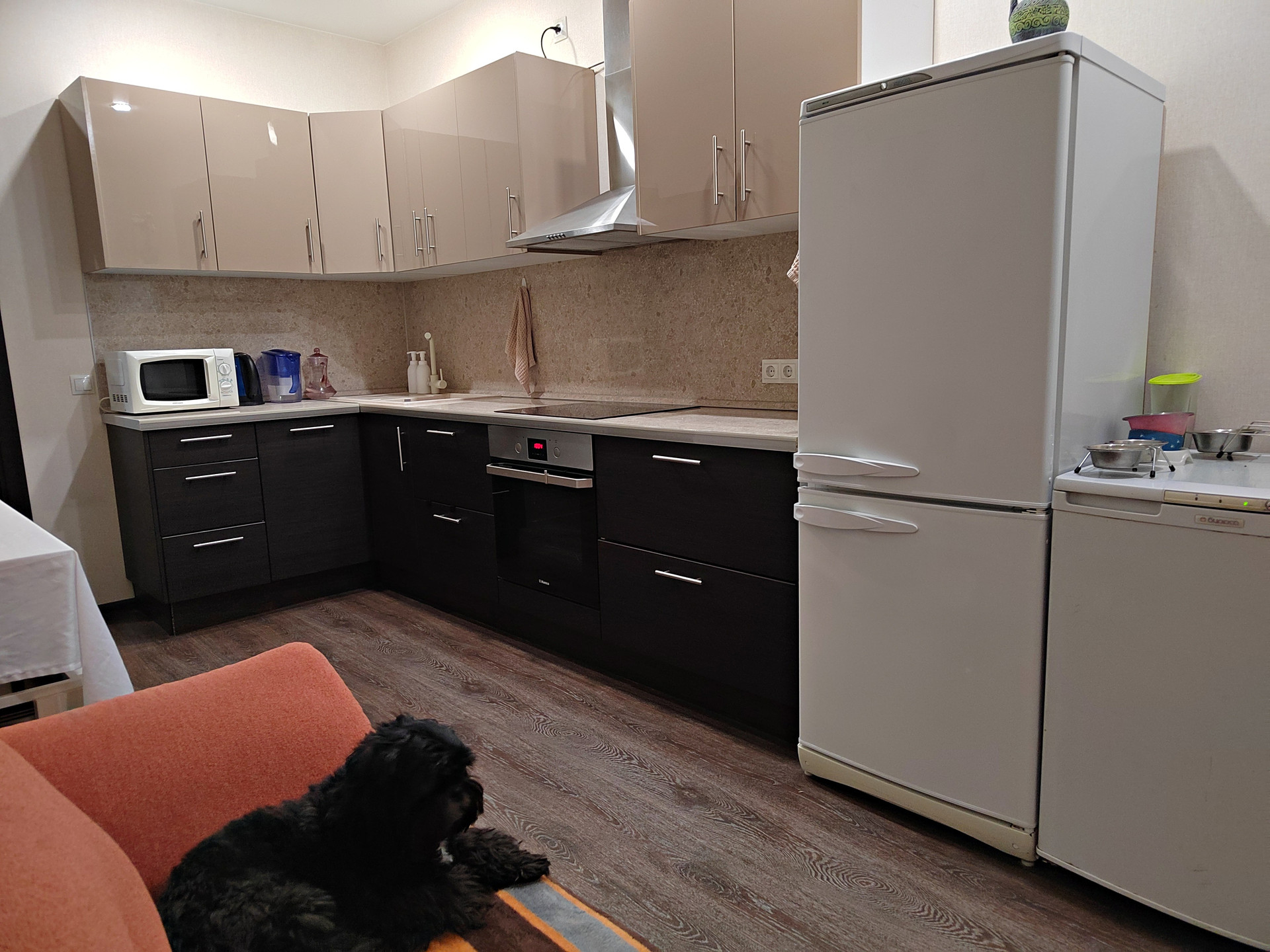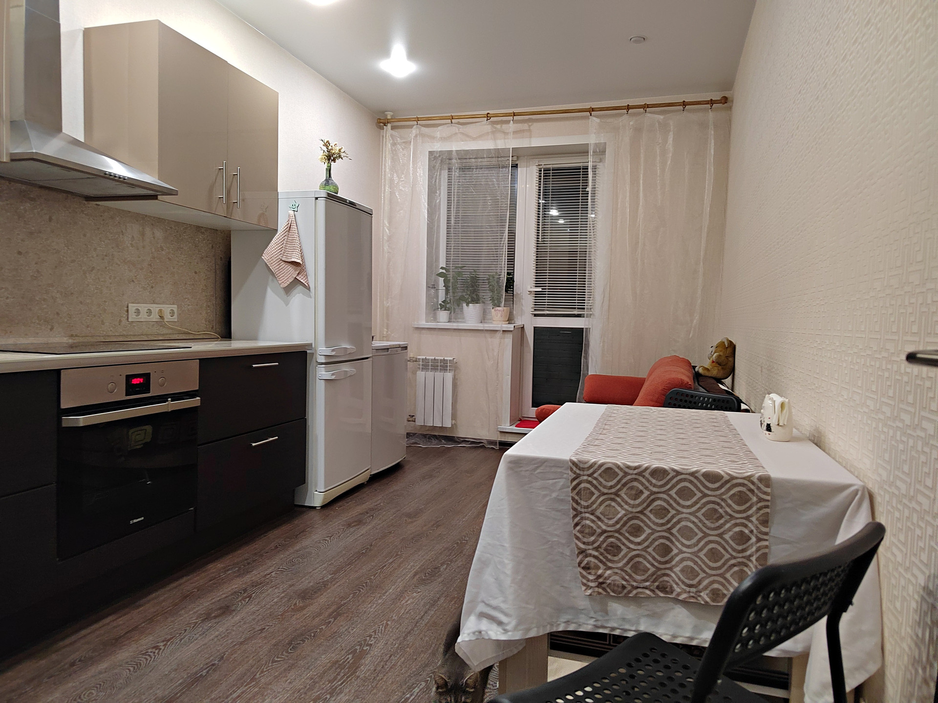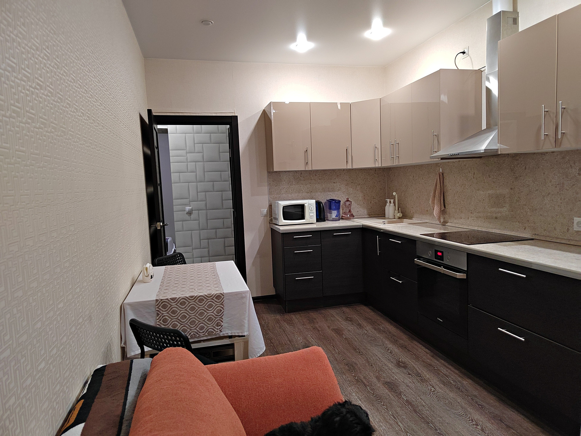 Кухня оборудована кухонным гарнитуром, варочной поверхностью, духовкой и посудомойкой. Вы сможете готовить вкусные блюда и проводить приятное время вместе с близкими и друзьями сразу же, вся мебель и техника на кухне останется вам (кроме холодильника).