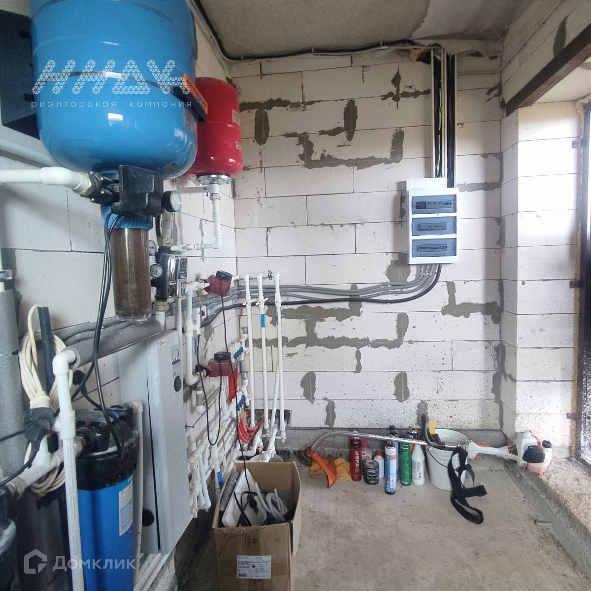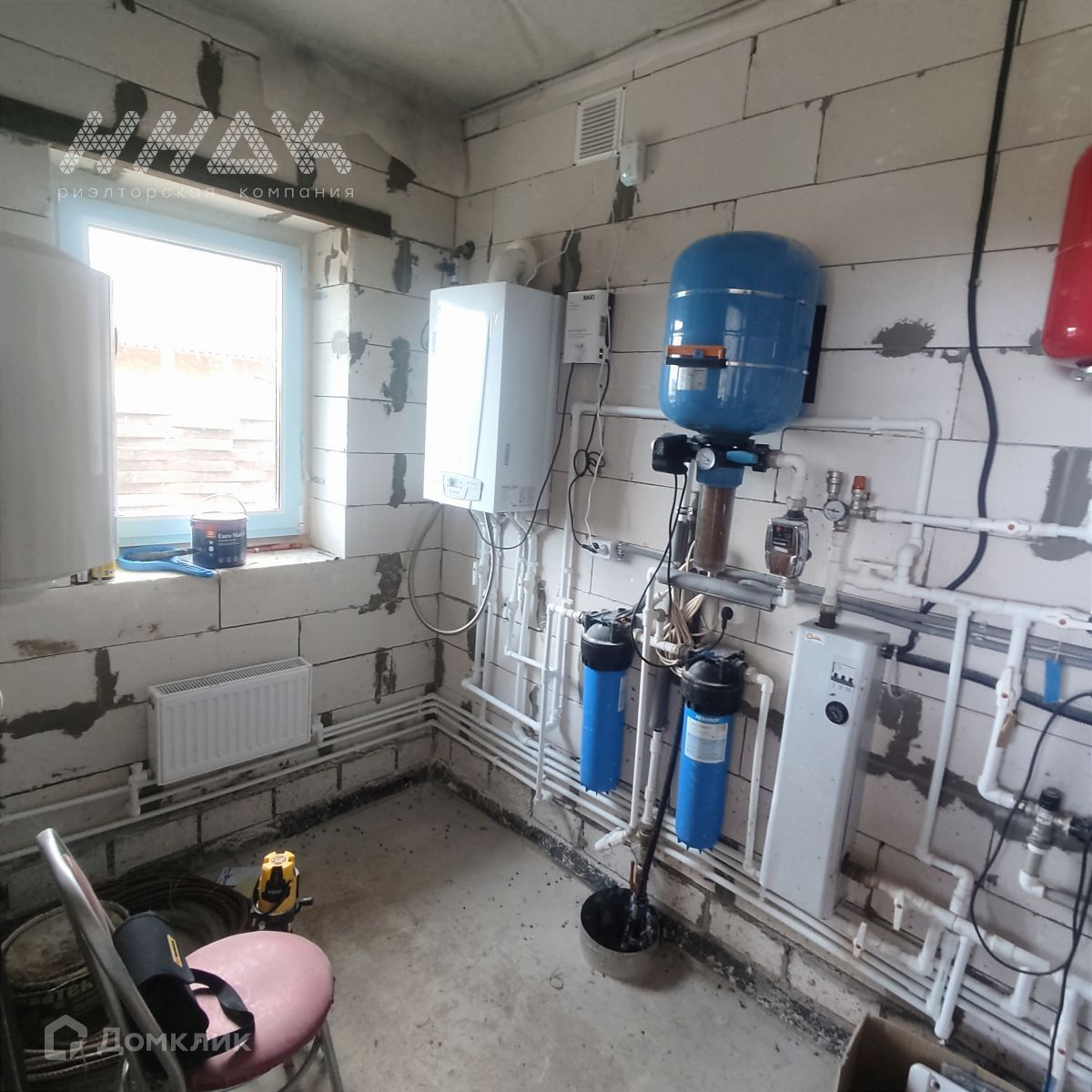 В дом заведены все коммуникации: газ, вода (скважина 35 м), канализация (септик 6 колец d-2 м с переливом). Полностью разведена электрика, подключено отопление.