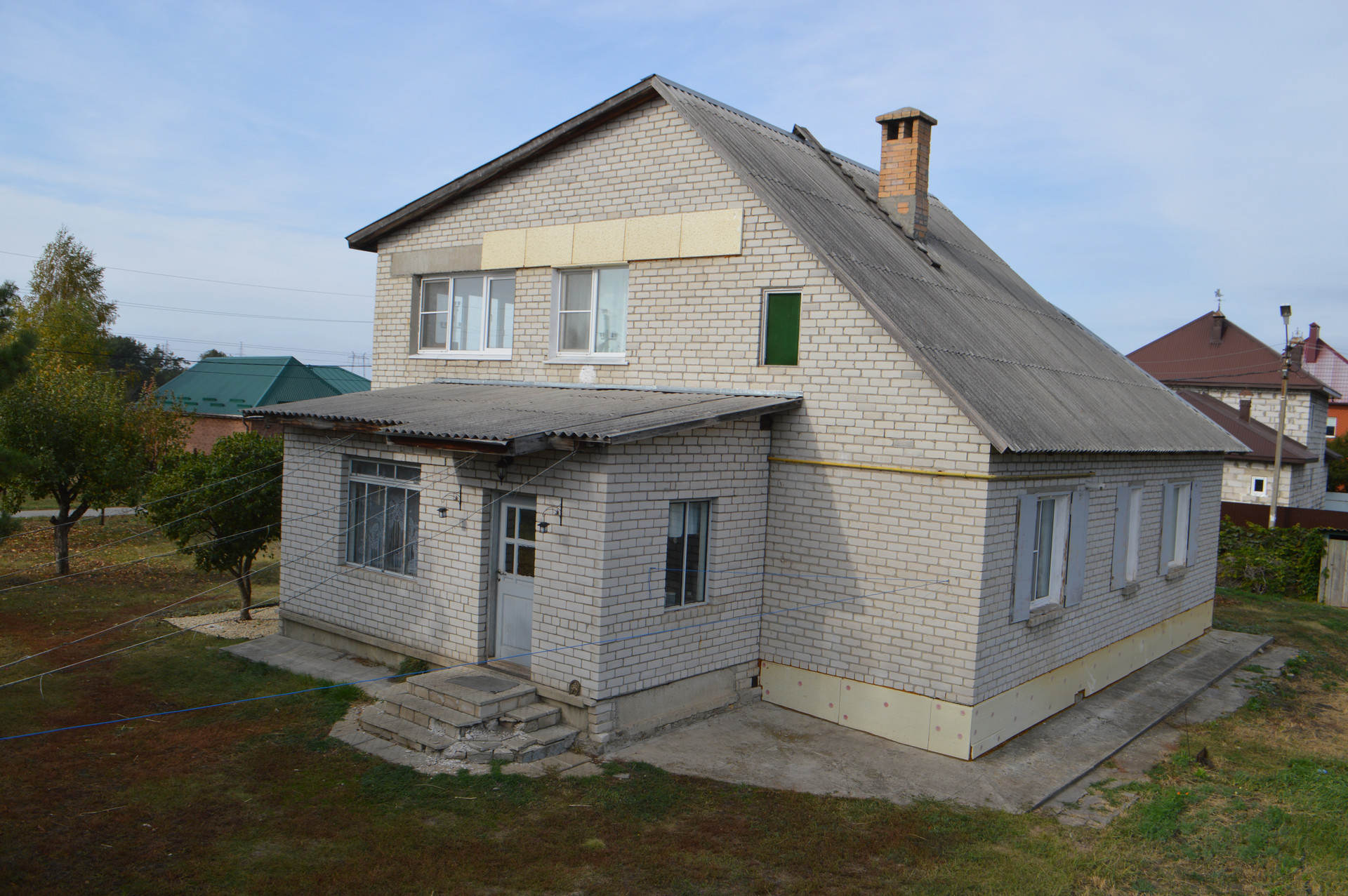 Дом - плиты обложенные кирпичём, два этажа + цокольный этаж. Фундамент - блоки на подушках под пятиэтажки, так что пару этажей при желании можно пристроить.