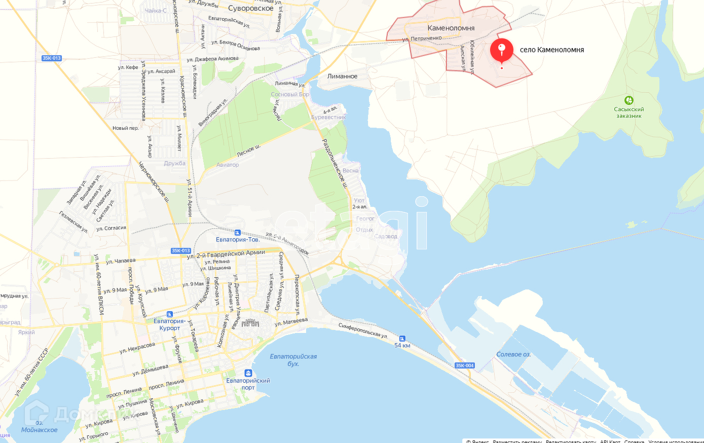 Село находится в пригороде Евпатории, на машине 10 минут до центра, на автобусе 20 минут. Перспективный район для строительства и проживания.