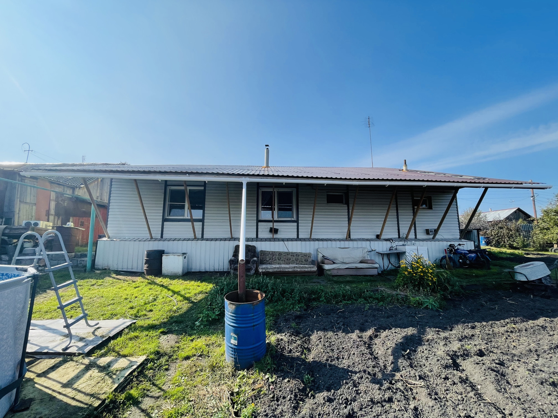 Дом из шпал, фундамент заливной (укреплен), установлены евроокна, крыша профлист, дом обшит сайдингом.