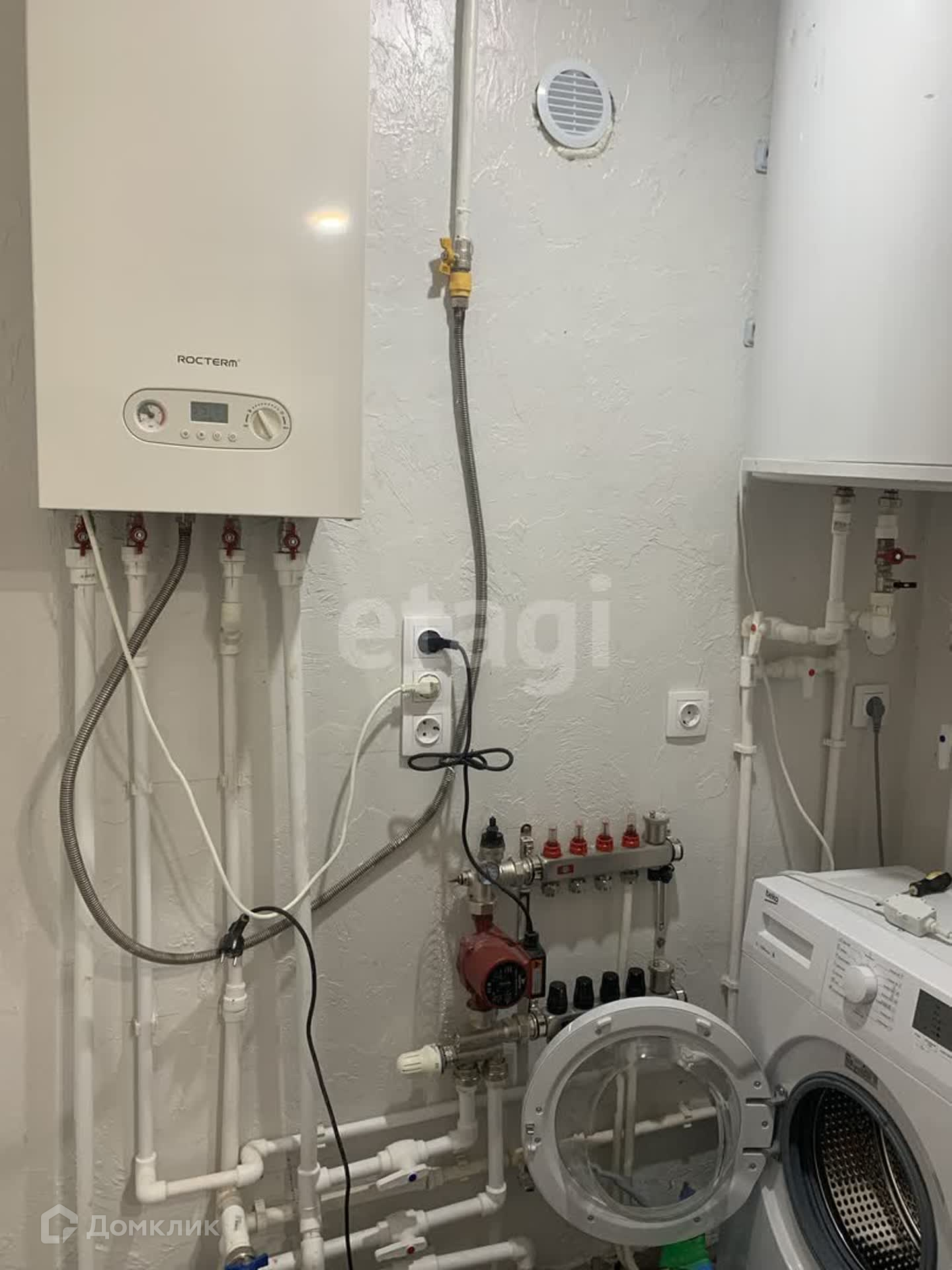 Внутри дома установлен газовый котел, что обеспечивает отопление в холодное время года. Также в доме имеется водонагреватель для подачи горячей воды.