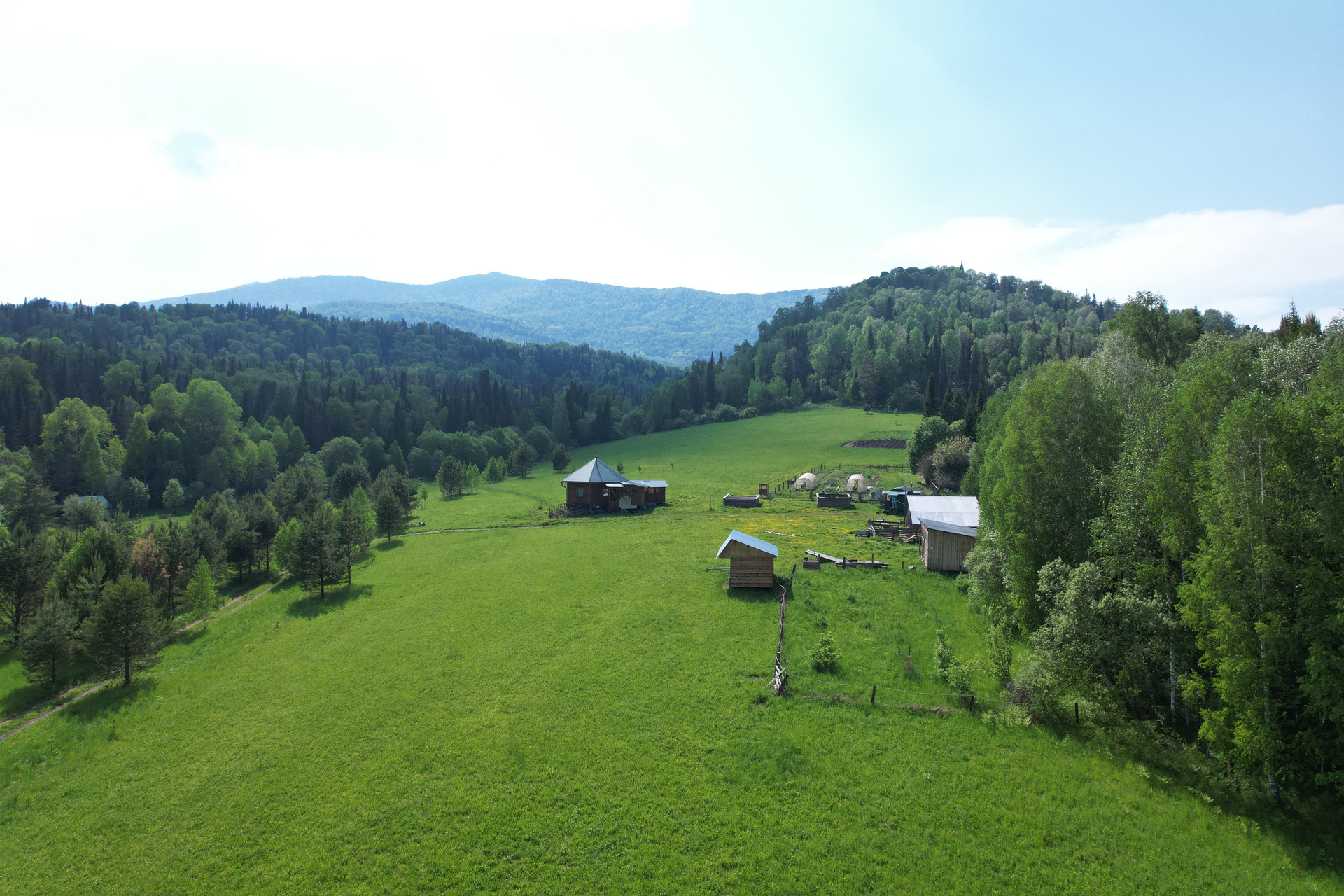 На полянах около деревни есть жилые дома фермеров и пасечников, Выше по течению реки - 2-3 жилых дома (поселение Чарбай)
