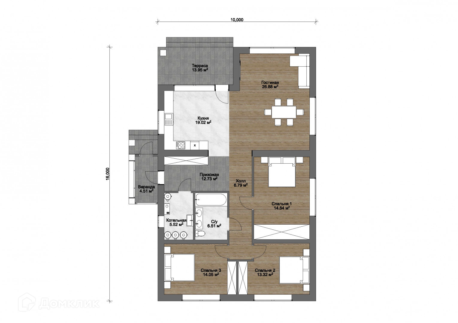 три спальные комнаты (одна из спален оборудована санузлом и гардеробом),